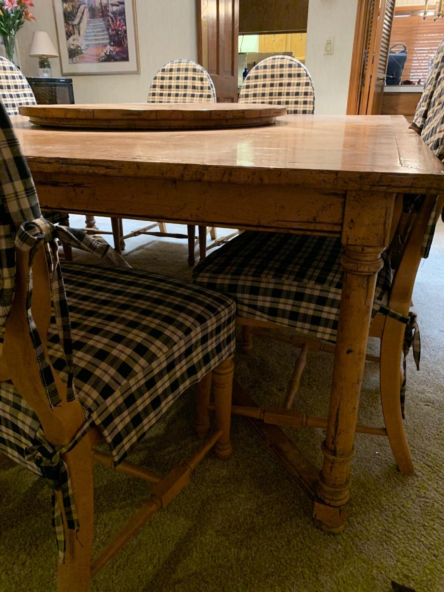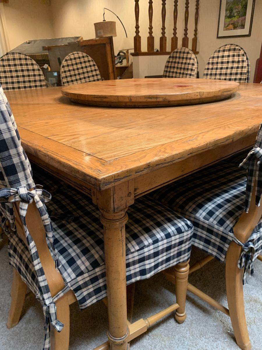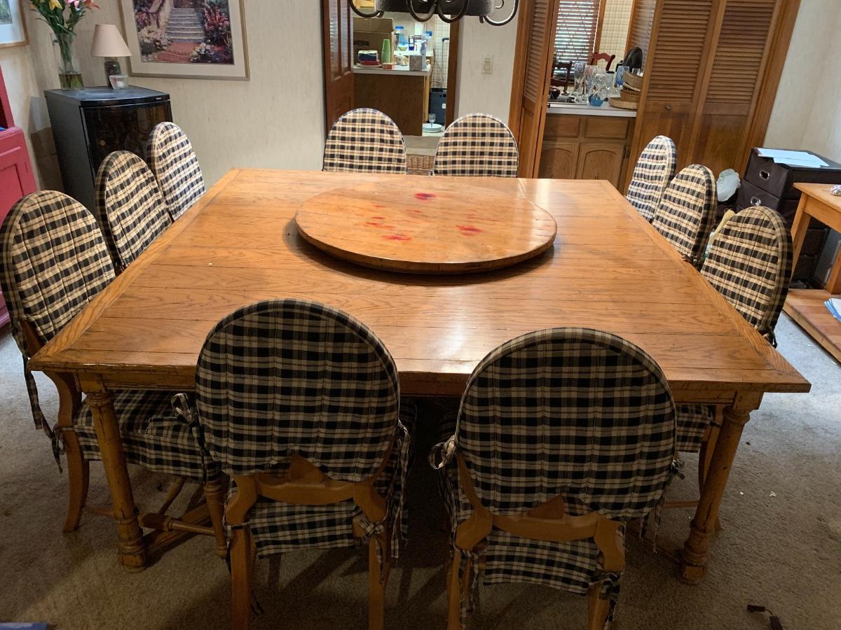 Oak dining table with 10 seats that have removable cushions. Includes a lazy Susan that is removable (does have some staining on the top) (Dining table-6 feet in length, 6 feet in width, 29 1/2 inches in height. Lazy Susan-38 inches in diameter)