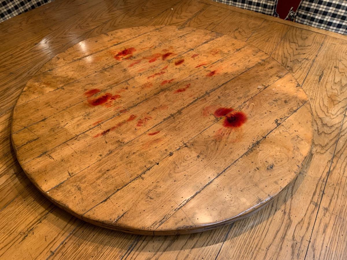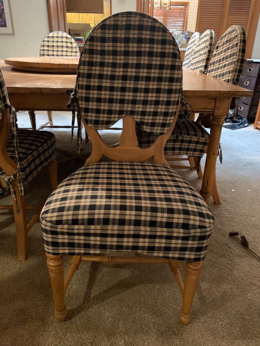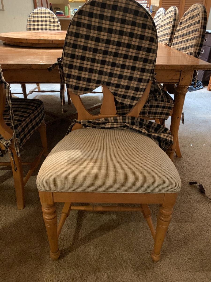 Oak dining table with 10 seats that have removable cushions. Includes a lazy Susan that is removable (does have some staining on the top) (Dining table-6 feet in length, 6 feet in width, 29 1/2 inches in height. Lazy Susan-38 inches in diameter)