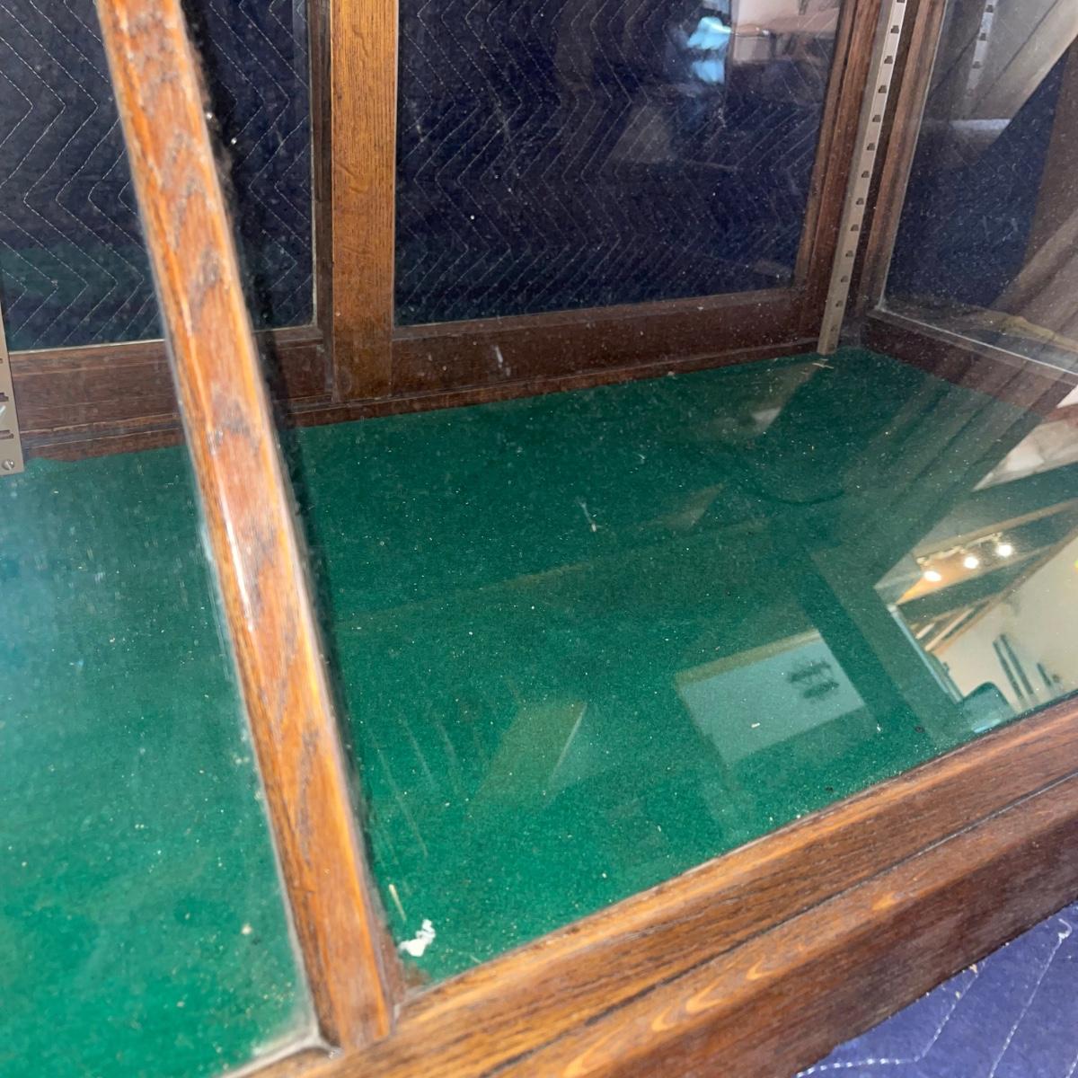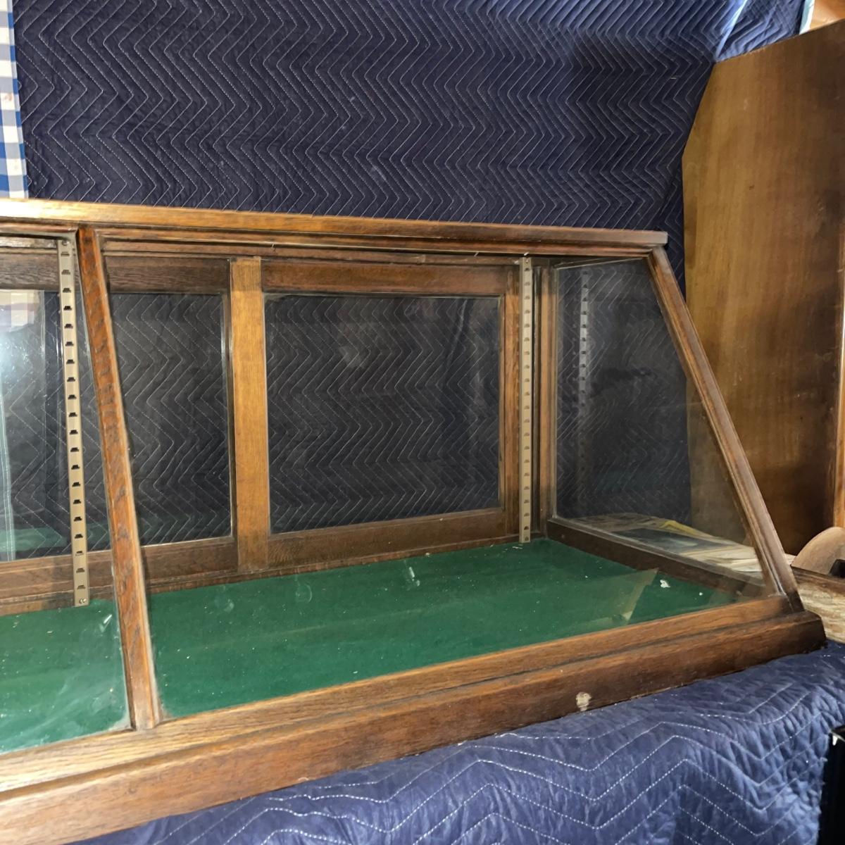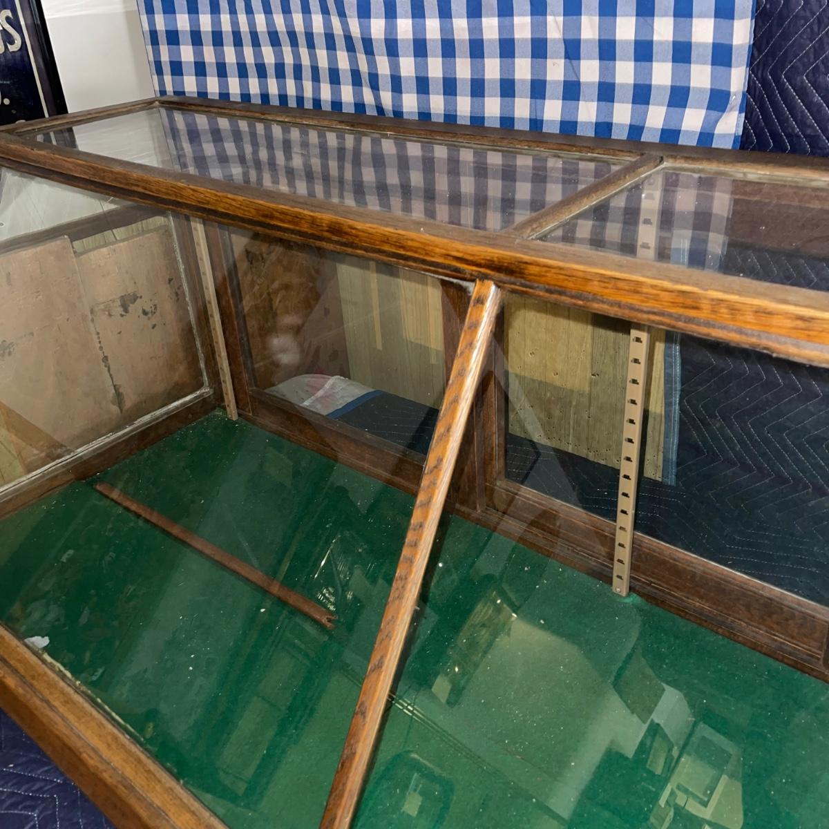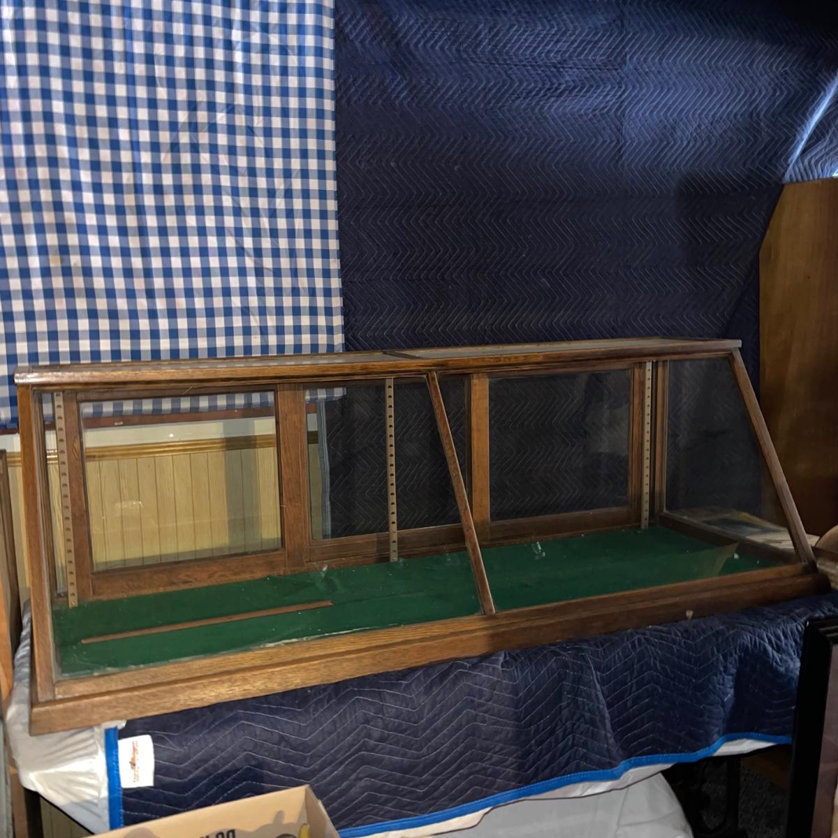 A large glass display case with sliding doors on the backside. It measures 69” x 24.5” x 23.5” and 12.5” deep at the top of the case where the glass slants and tapers in. One of the sliding glass doors on the back has a crack, on the left hand side when facing it. Please bring help to move this item as it is very large and heavy. Local pick up only.