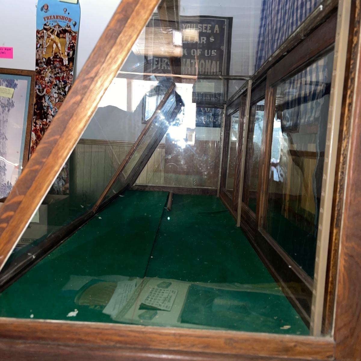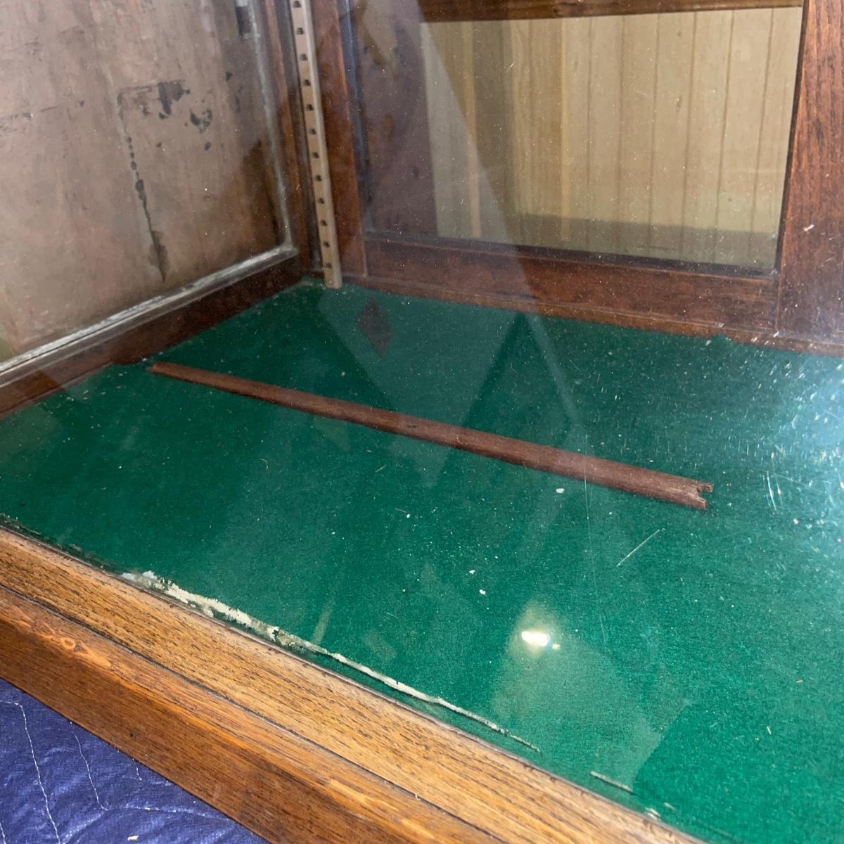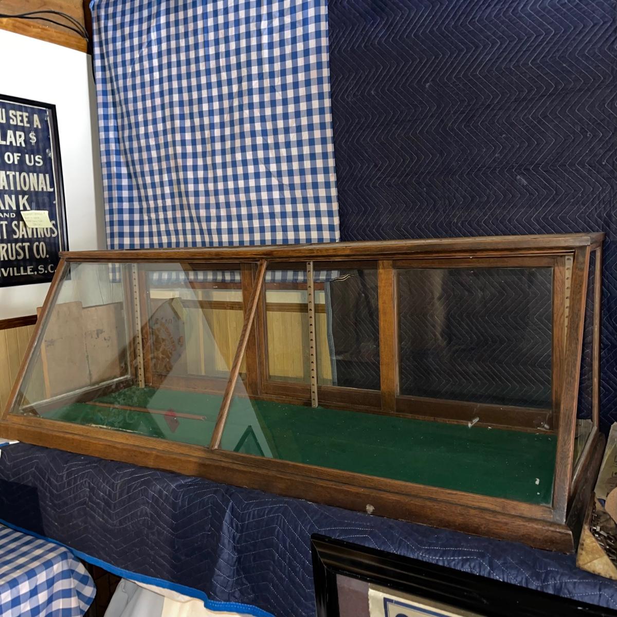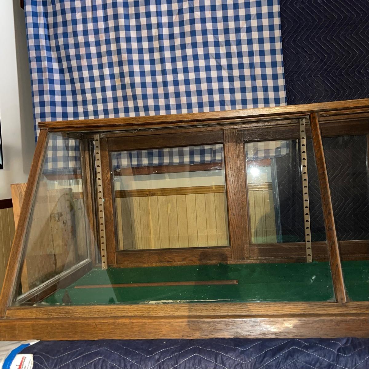 A large glass display case with sliding doors on the backside. It measures 69” x 24.5” x 23.5” and 12.5” deep at the top of the case where the glass slants and tapers in. One of the sliding glass doors on the back has a crack, on the left hand side when facing it. Please bring help to move this item as it is very large and heavy. Local pick up only.