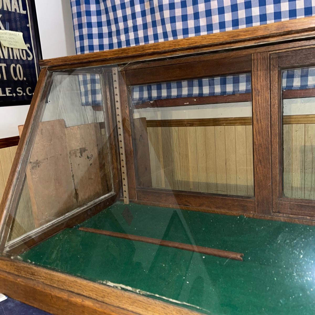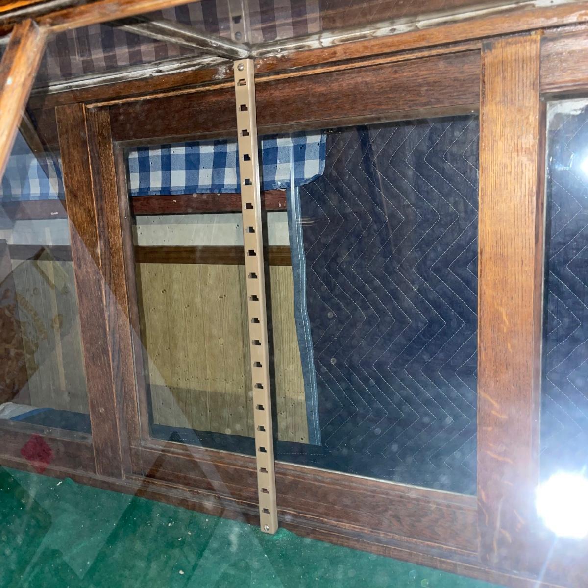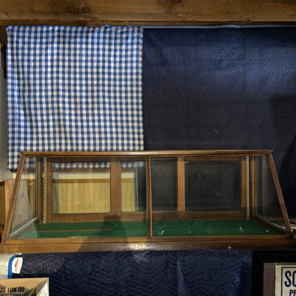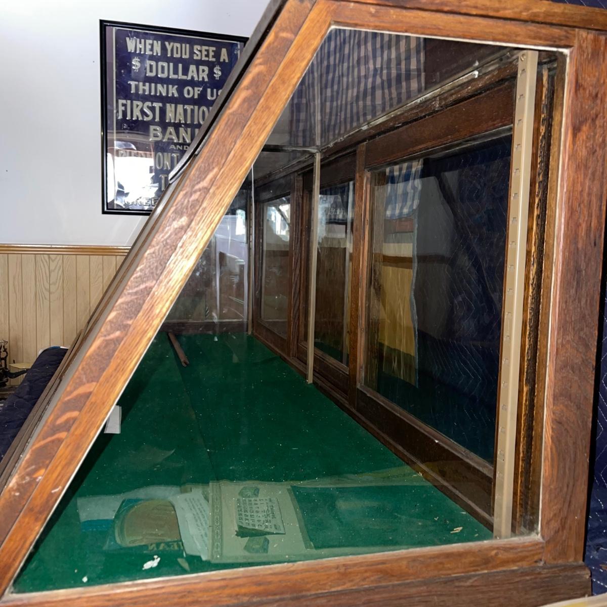 A large glass display case with sliding doors on the backside. It measures 69” x 24.5” x 23.5” and 12.5” deep at the top of the case where the glass slants and tapers in. One of the sliding glass doors on the back has a crack, on the left hand side when facing it. Please bring help to move this item as it is very large and heavy. Local pick up only.