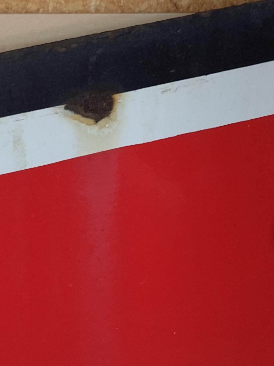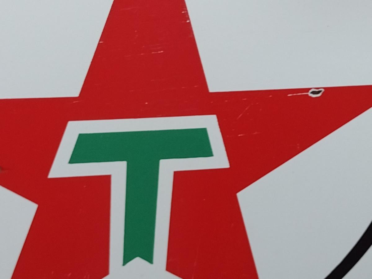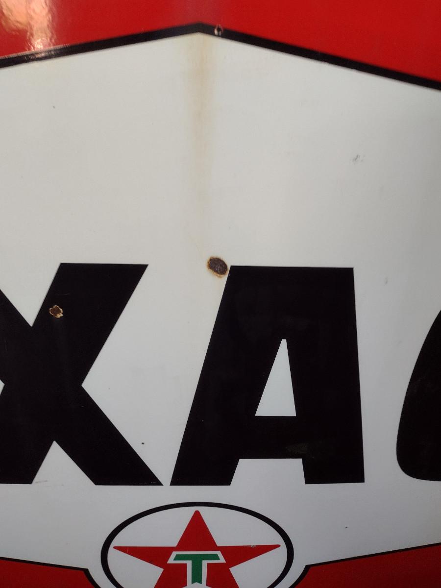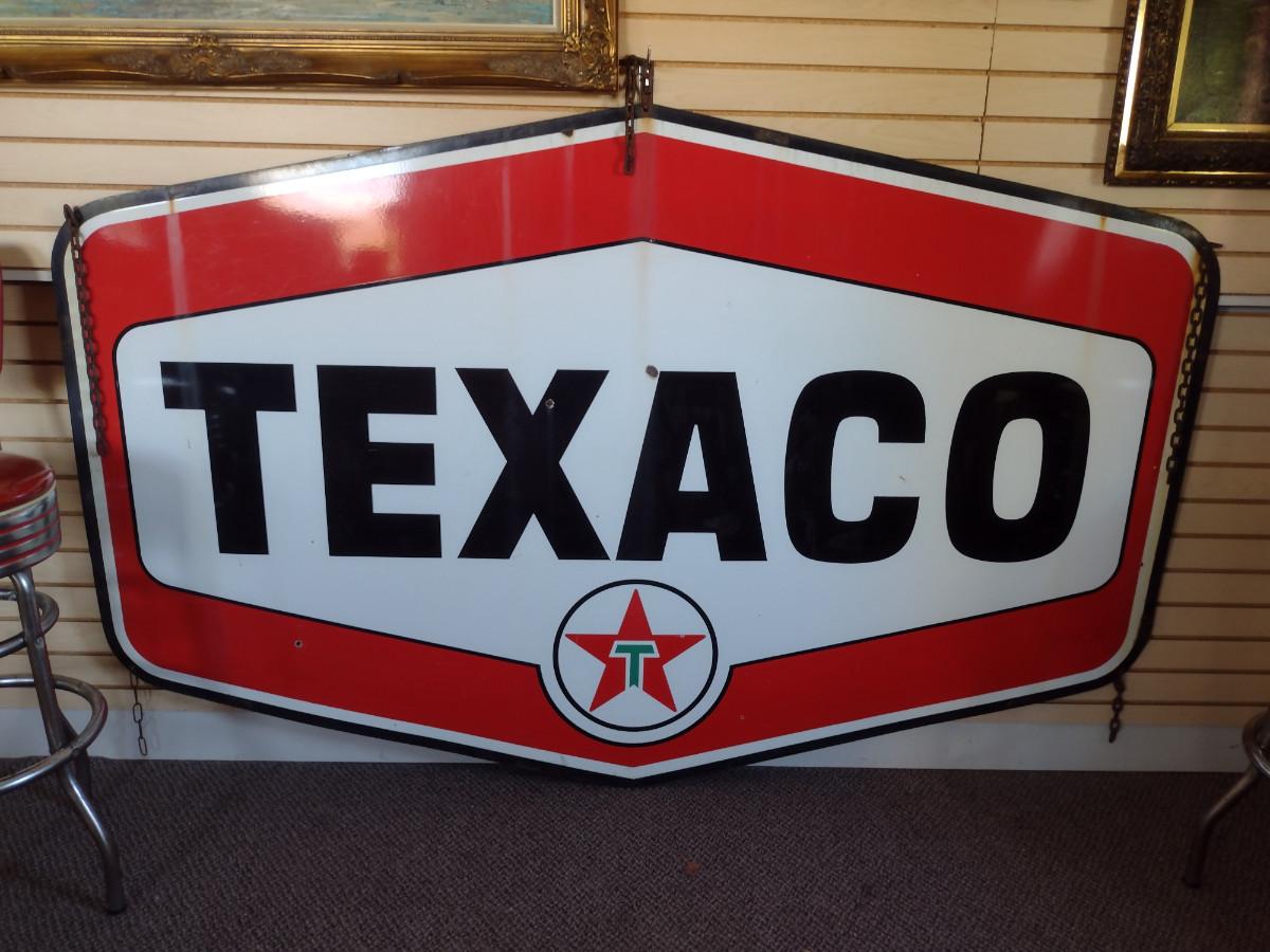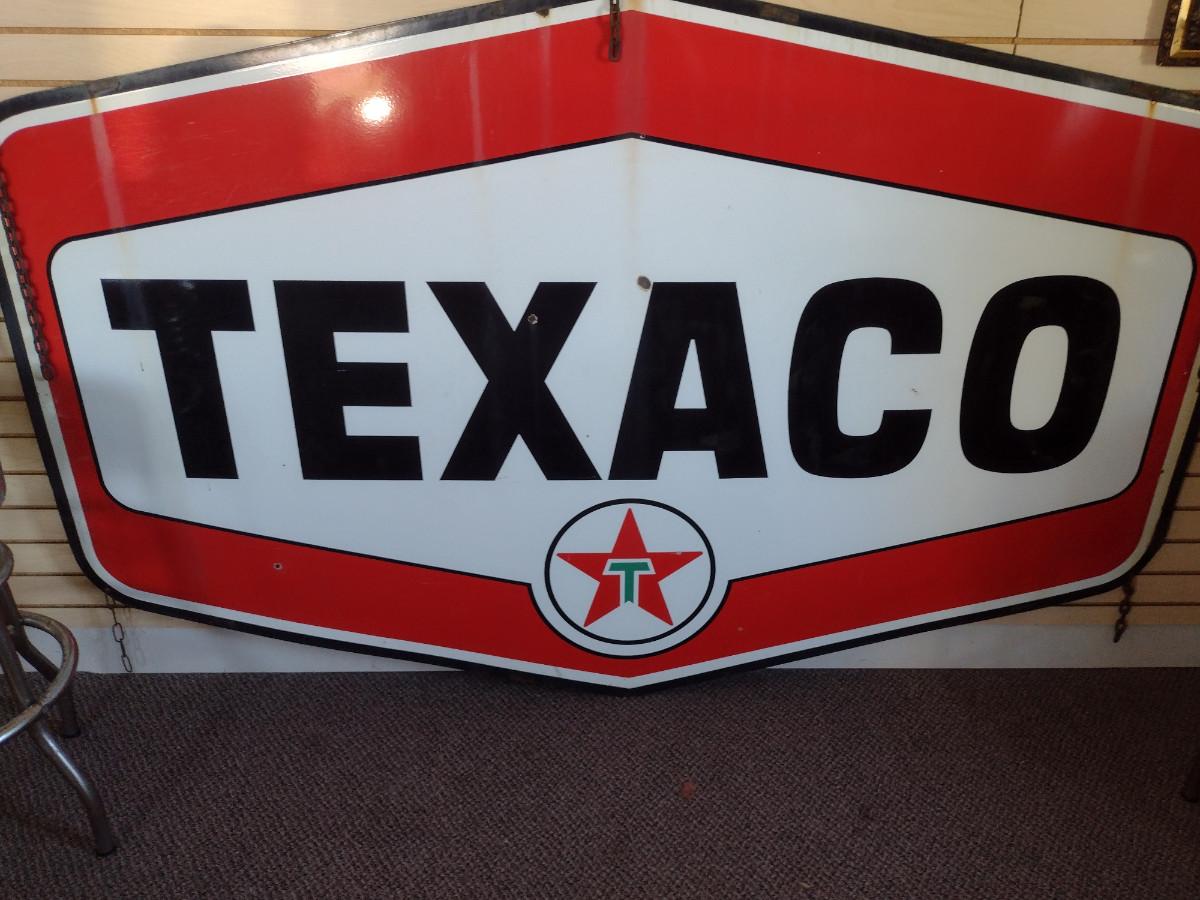 Large, Double Sided Porcelain Texaco Sign. Nice with vivid colors. Please see all pictures- there are some areas of chipping finish and rust from the chains used for hanging. Item measures approx 85 3/4" x 53 1/2".