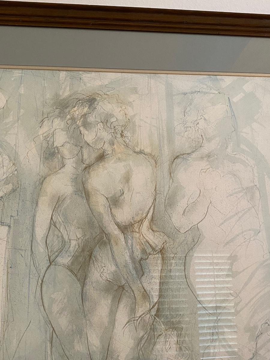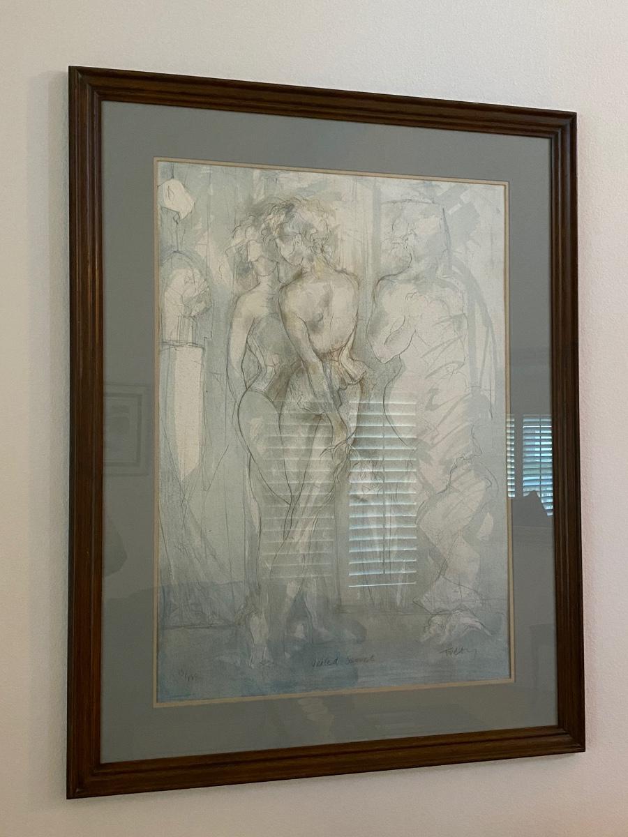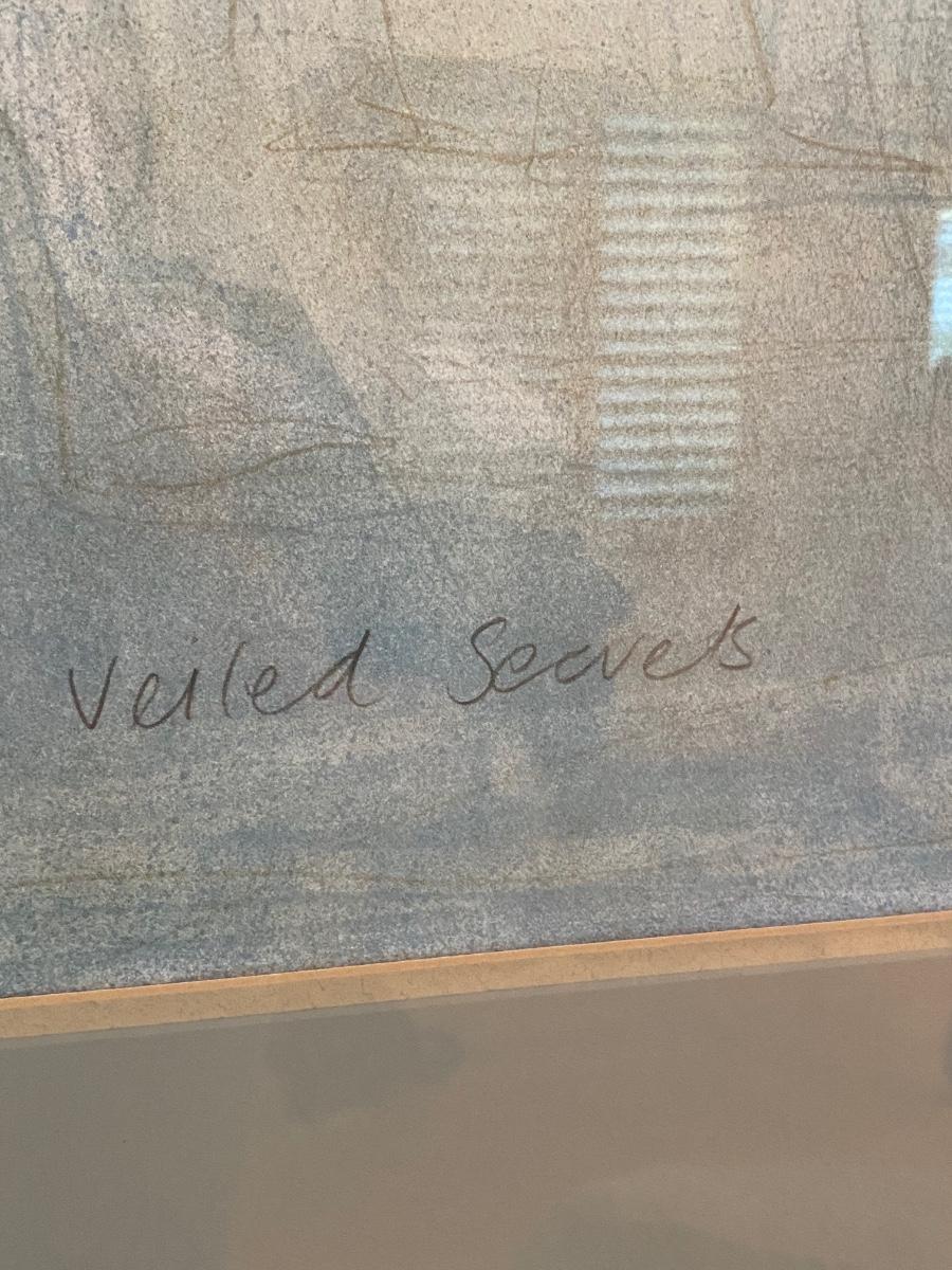 Large wall art piece titled "Veiled Secrets". Looks like a charcoal sketch and watercolor. Artist signed and numbered.