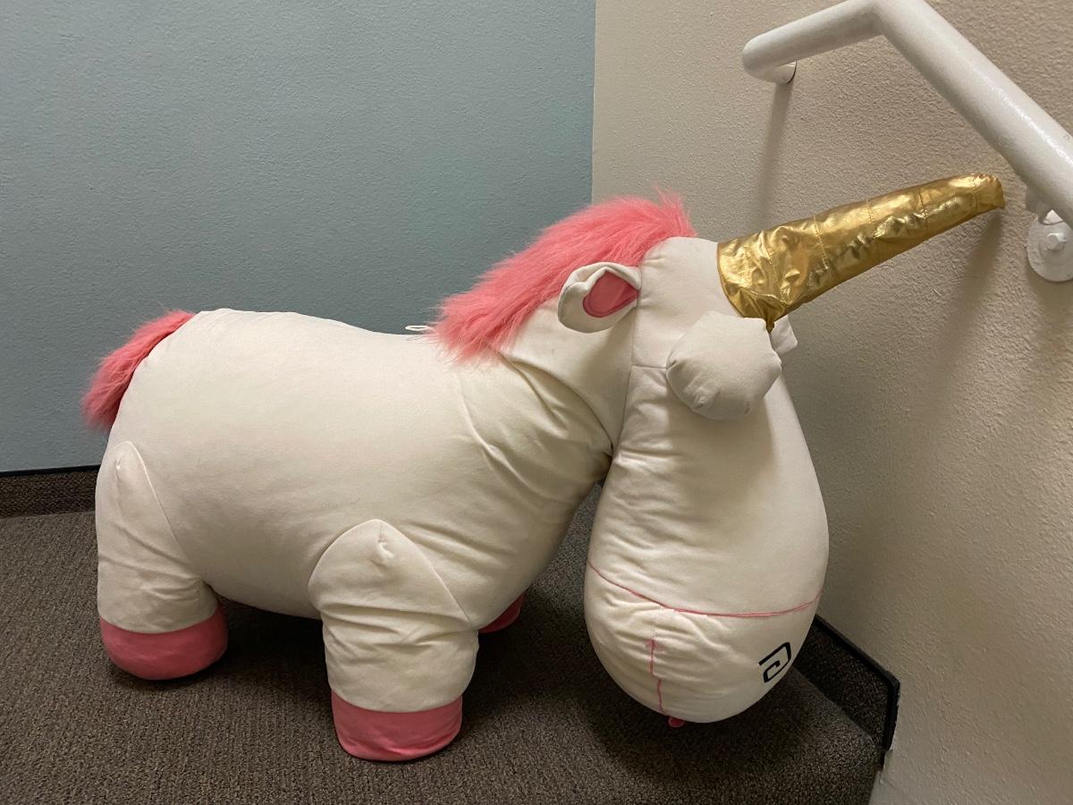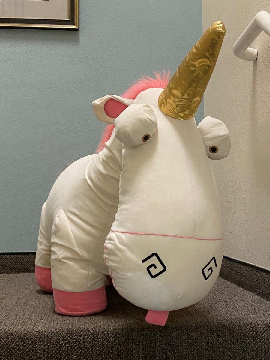 Large DreamWorks Despicable Me Unicorn Stuffed Animal, there is no significant damage to the stuffed animal and is in good condition. Check pictures for more details and for sizing. Pictures are taken on stairs for idea of size (medium dog size).