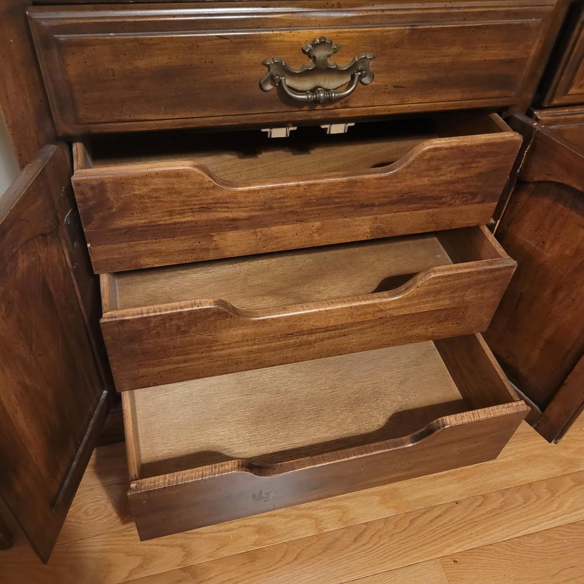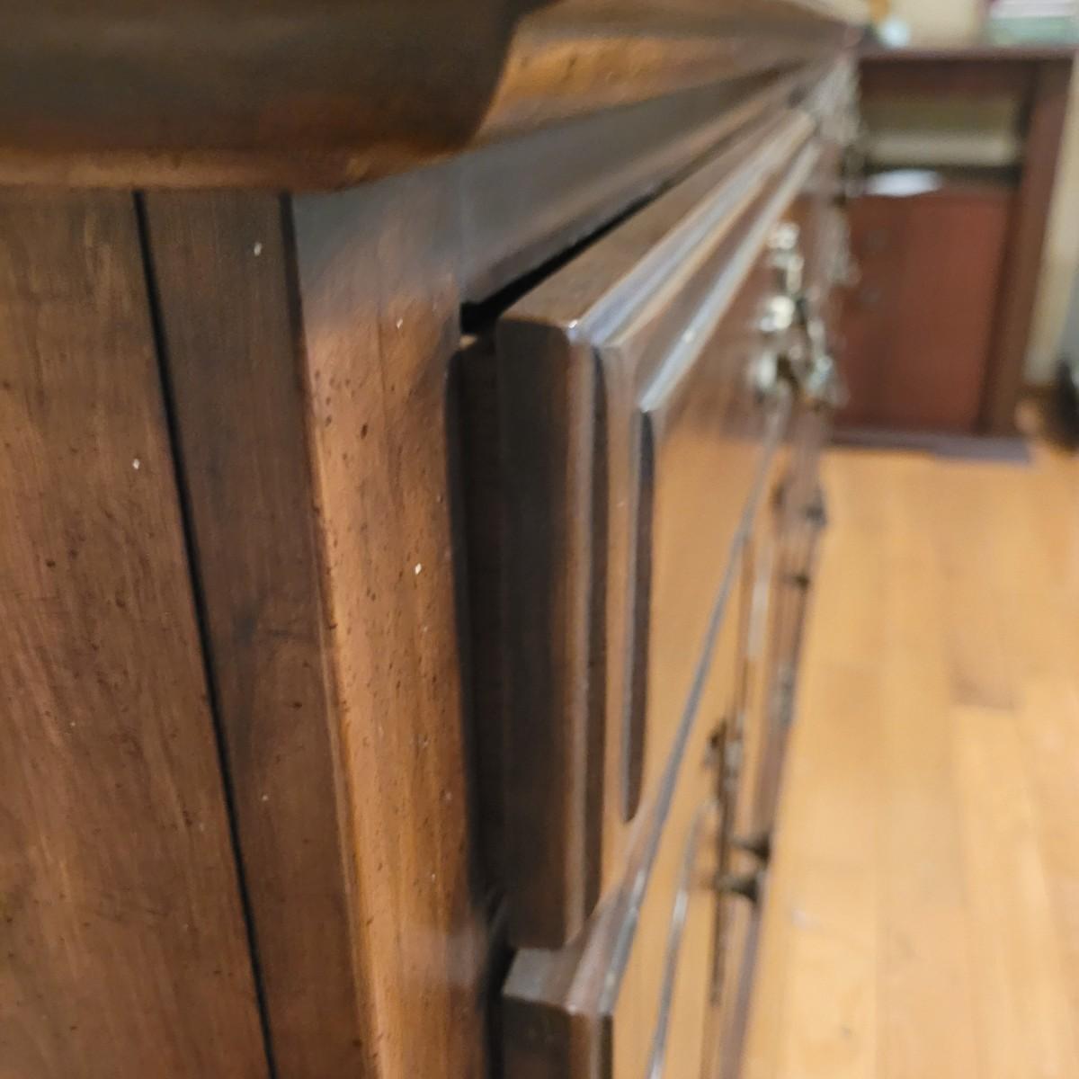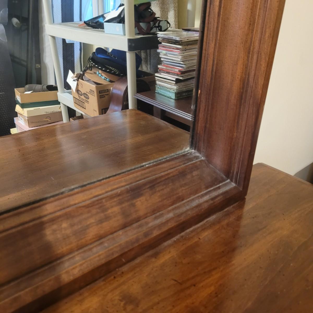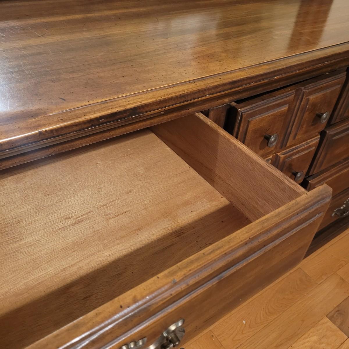 This large wooden dresser with attached mirror has twelve drawers, including a lower left cabinet with three drawer trays. Top left and middle drawers do not close all the way, and lower left cabinets are not level with each other (see photos). Dresser measures approximately 68” x 20” 32.5”H, and mirror 56.5” x 36.” Local pickup only. Winning bidder must bring assistance to help move and load this item due to its weight and size.