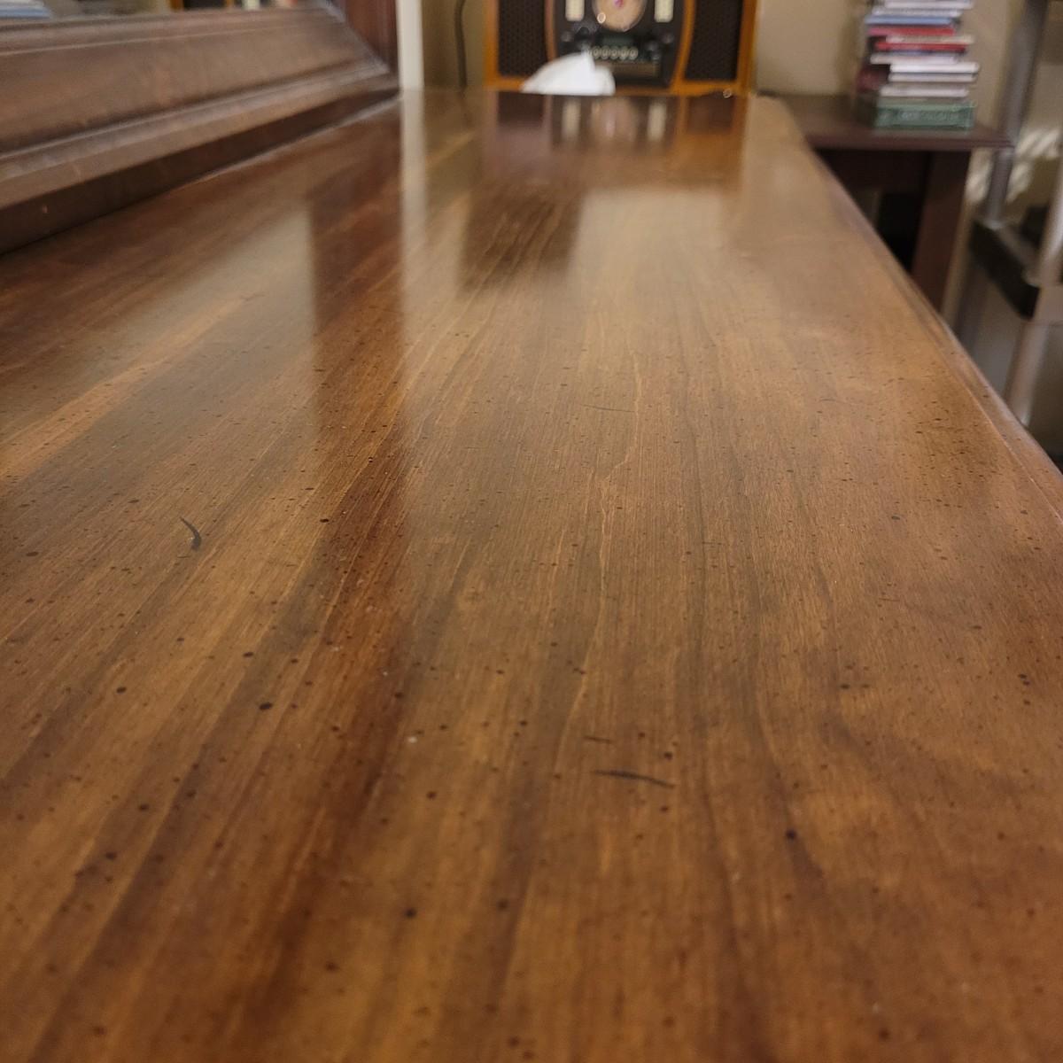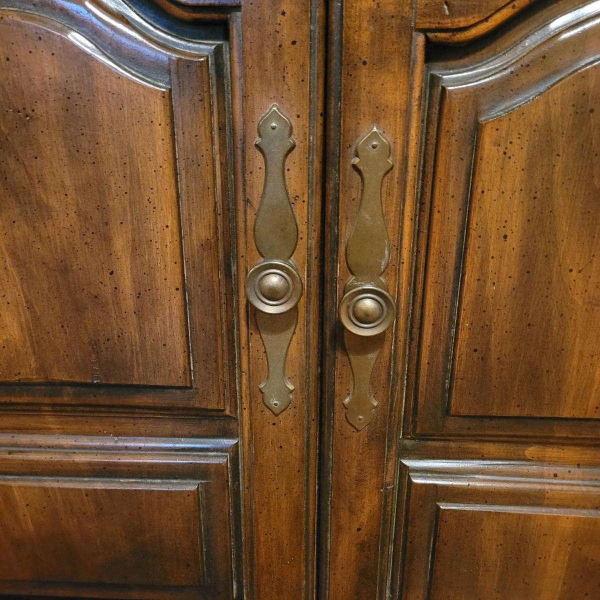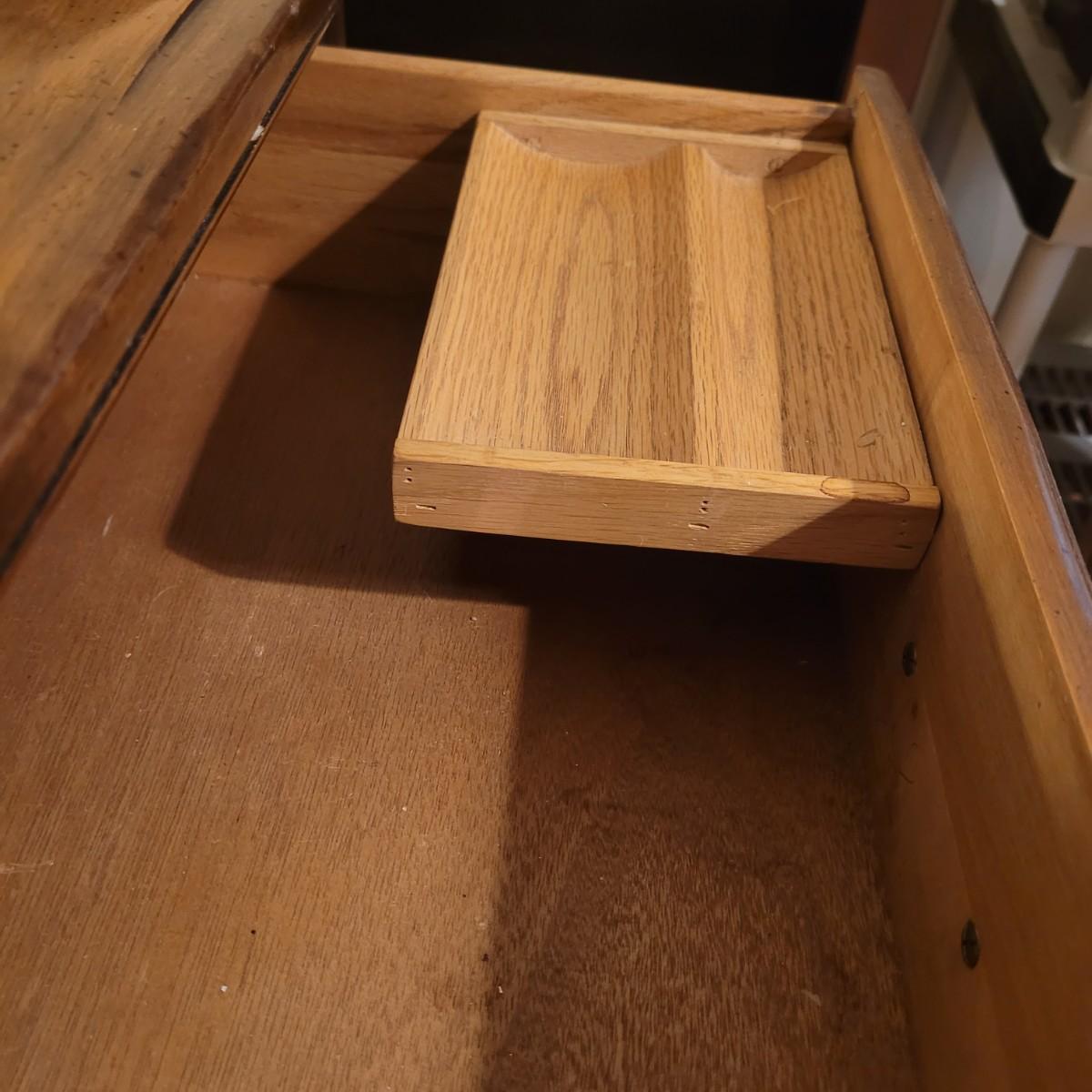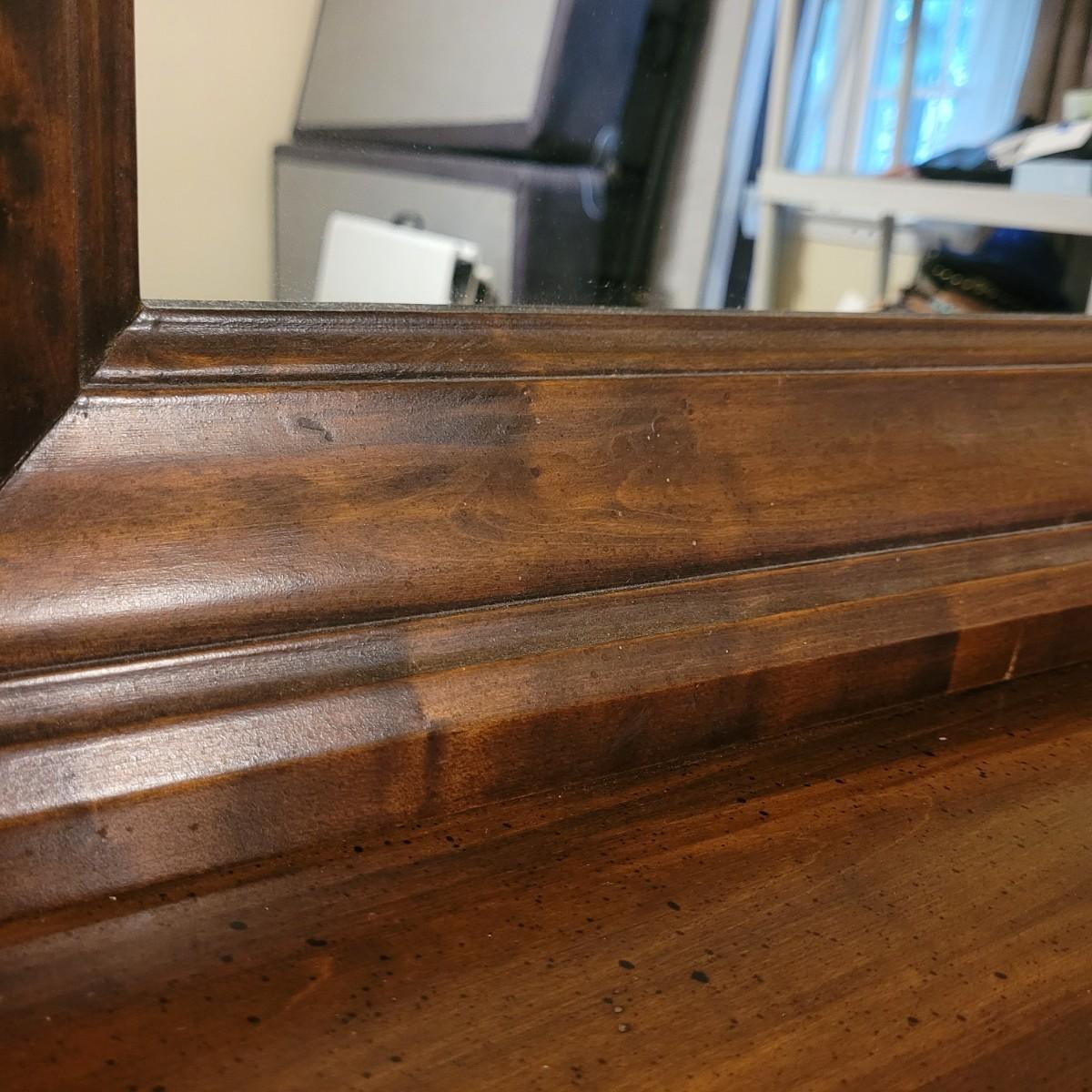 This large wooden dresser with attached mirror has twelve drawers, including a lower left cabinet with three drawer trays. Top left and middle drawers do not close all the way, and lower left cabinets are not level with each other (see photos). Dresser measures approximately 68” x 20” 32.5”H, and mirror 56.5” x 36.” Local pickup only. Winning bidder must bring assistance to help move and load this item due to its weight and size.