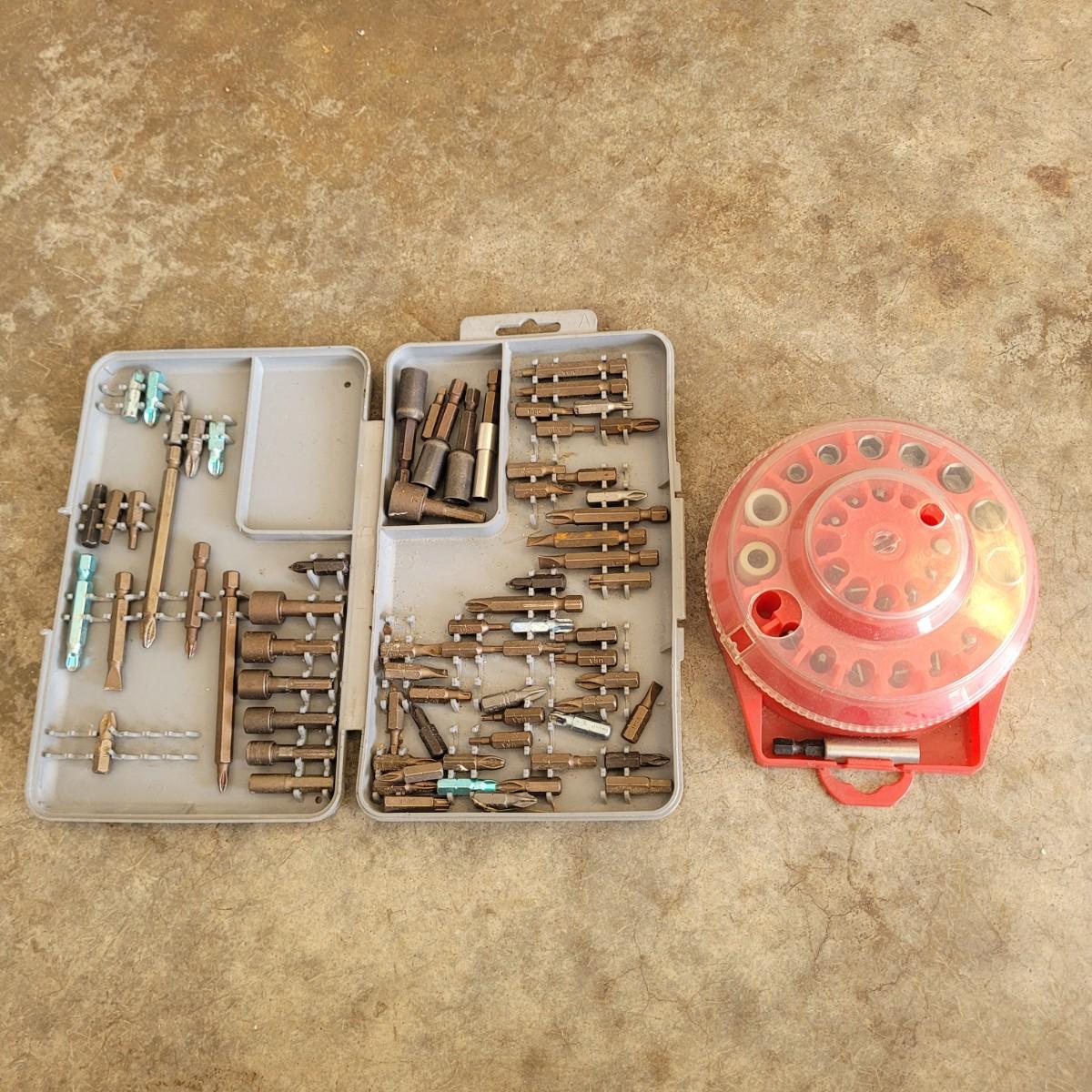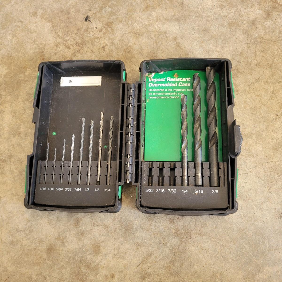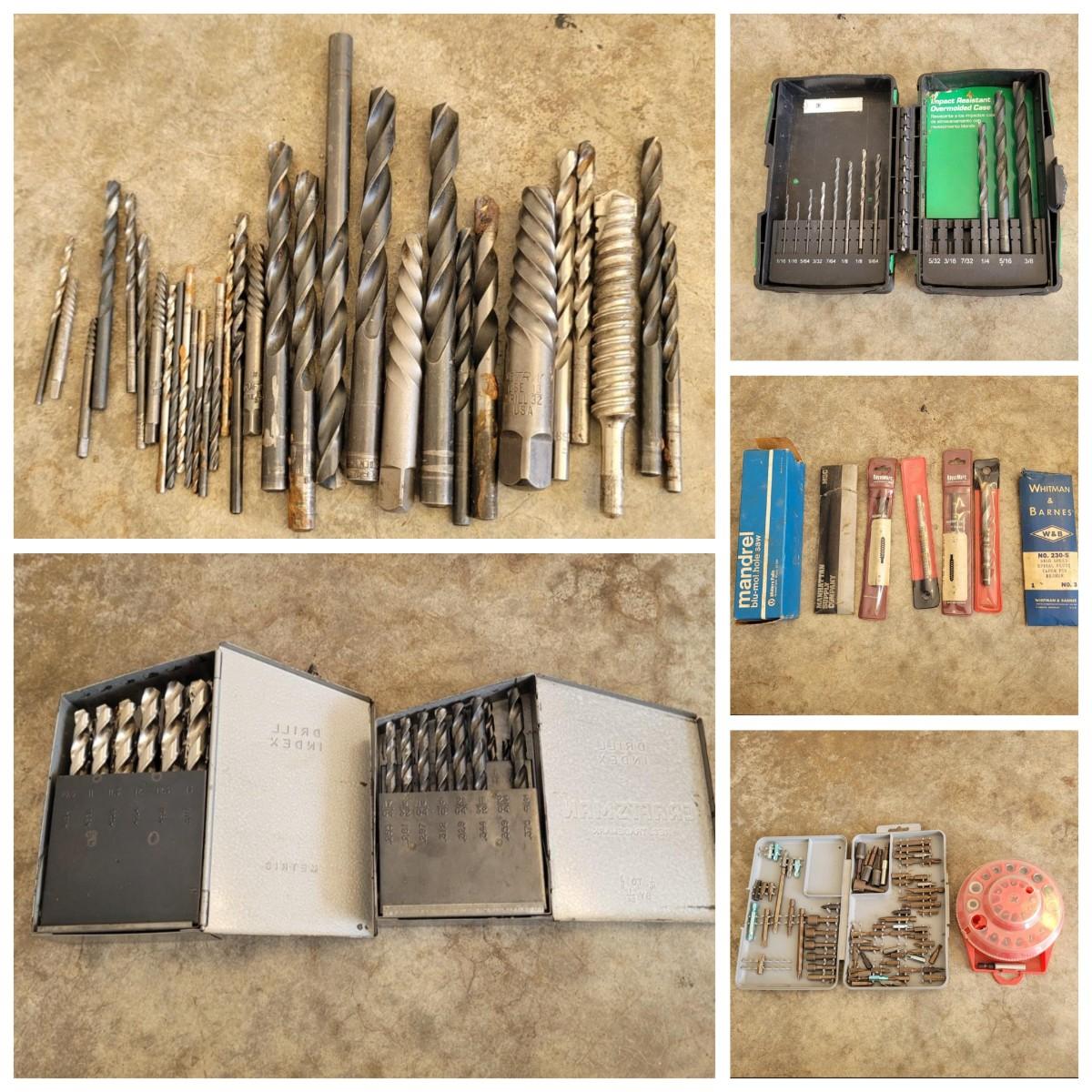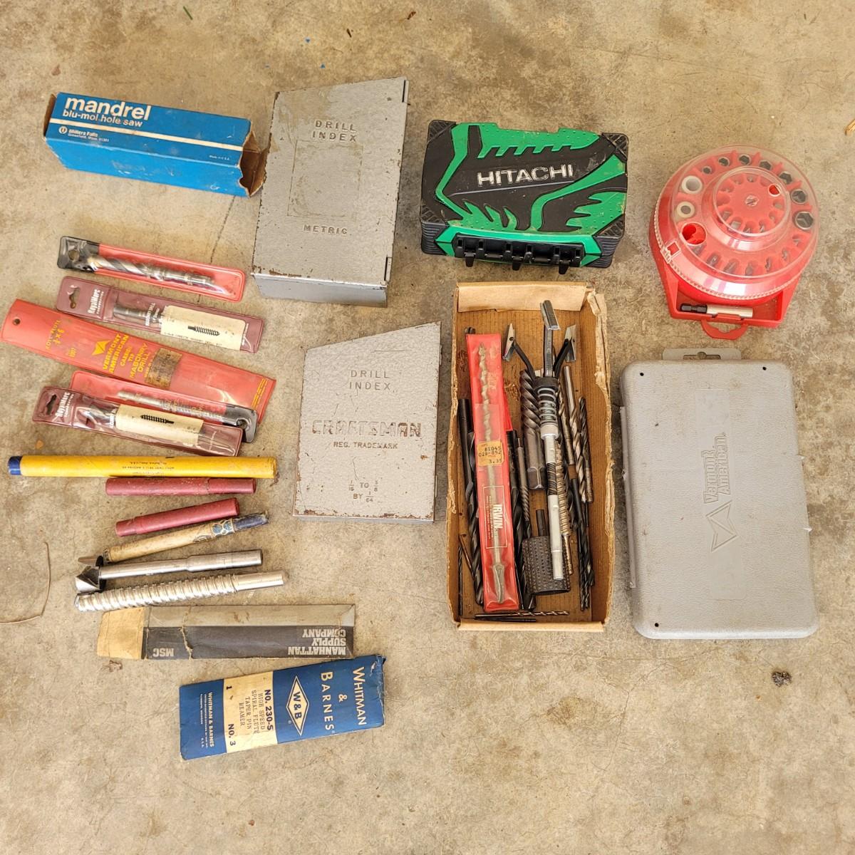 This lot includes a large mix of drill bits and attachments. Five kits featuring drill bits and attachments for a power drill and various loose drill bits. Many different sized bits. Brands include Craftsman, Vermont American, Hitachi, and RoyalMarc.