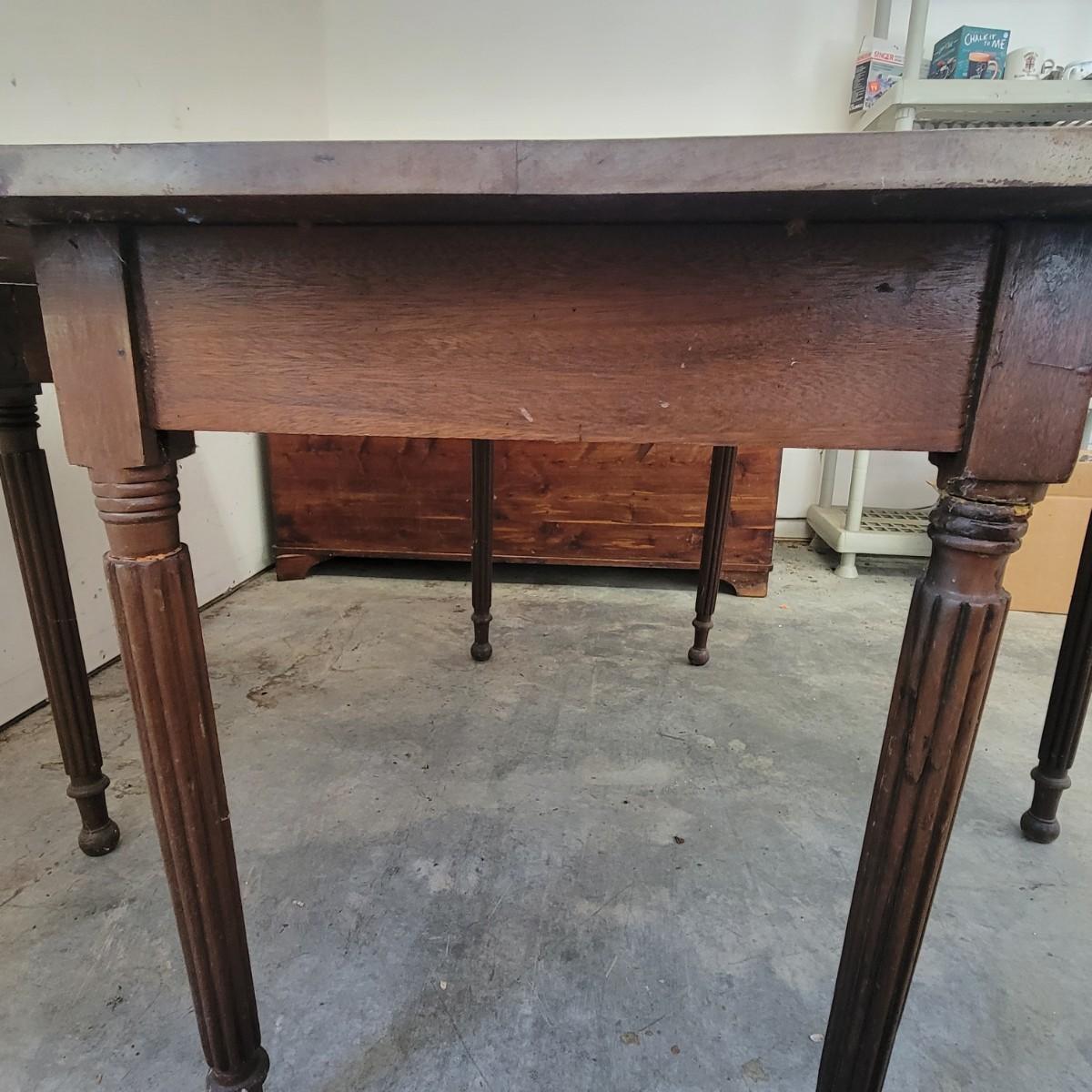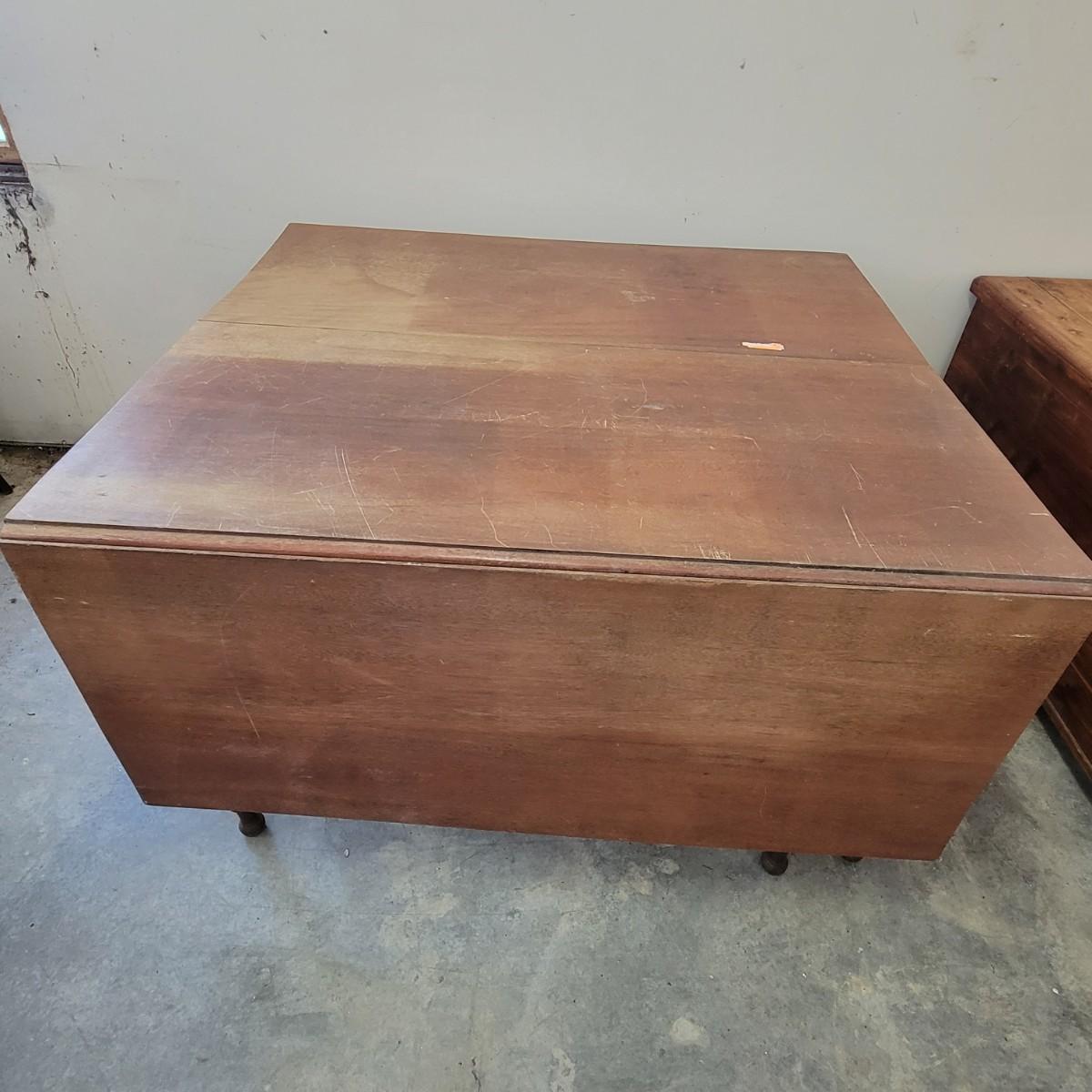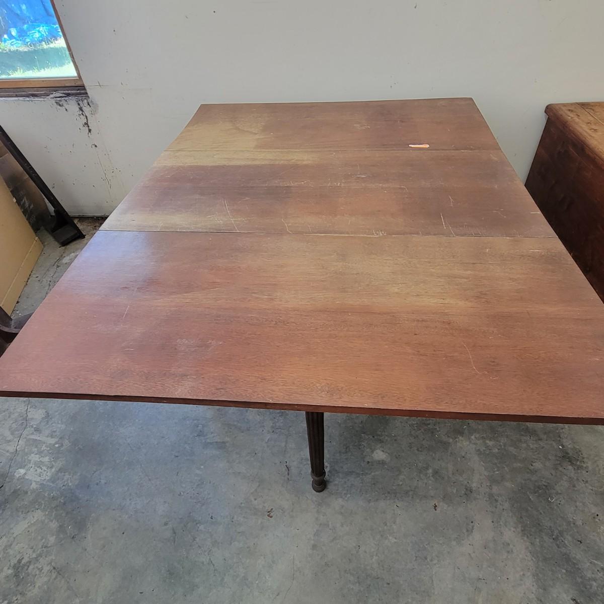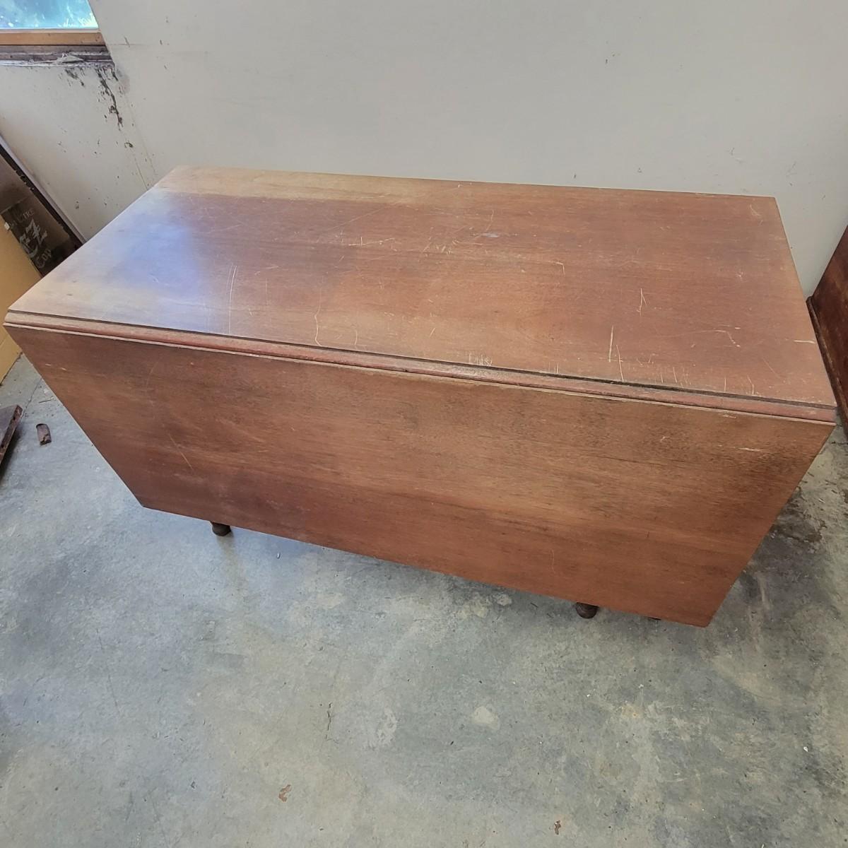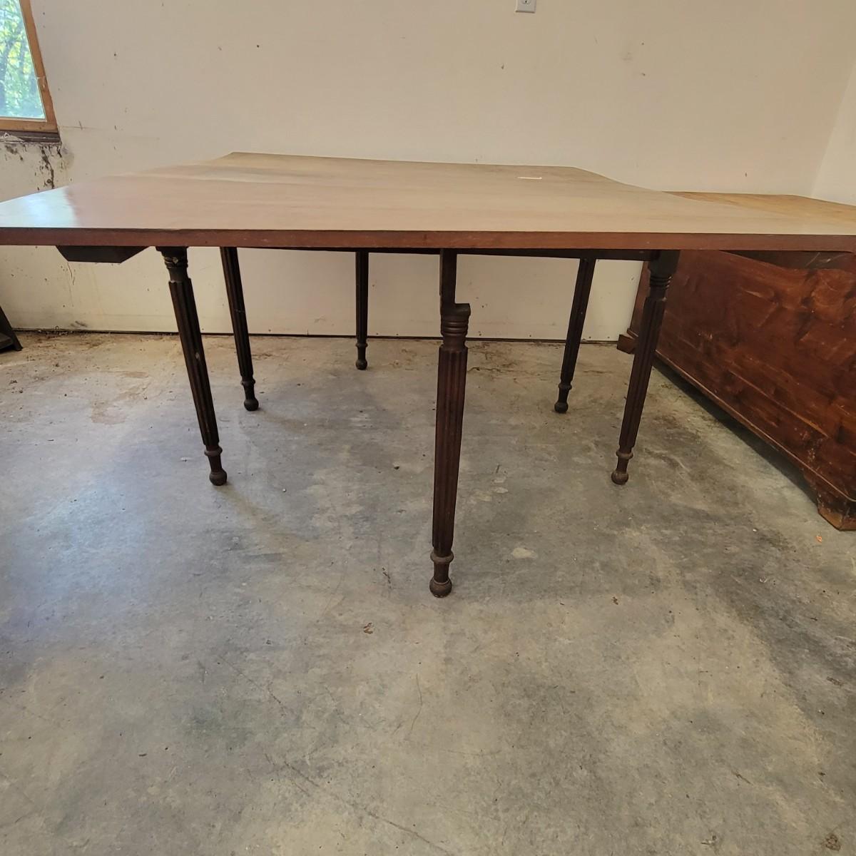 Solid wood drop leaf table with 6 legs. Measures approximately 63" x 48" x 28" when leafs are open and measures approximately 24" x 48" x 28" with the leafs down. Table top is warped and multiple legs need repair. Has quite a bit of wear and tear, see photos.