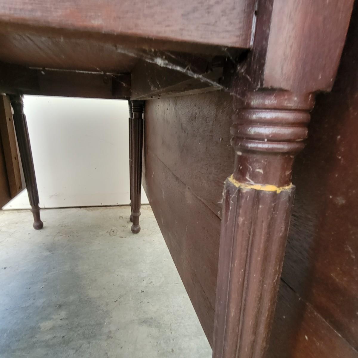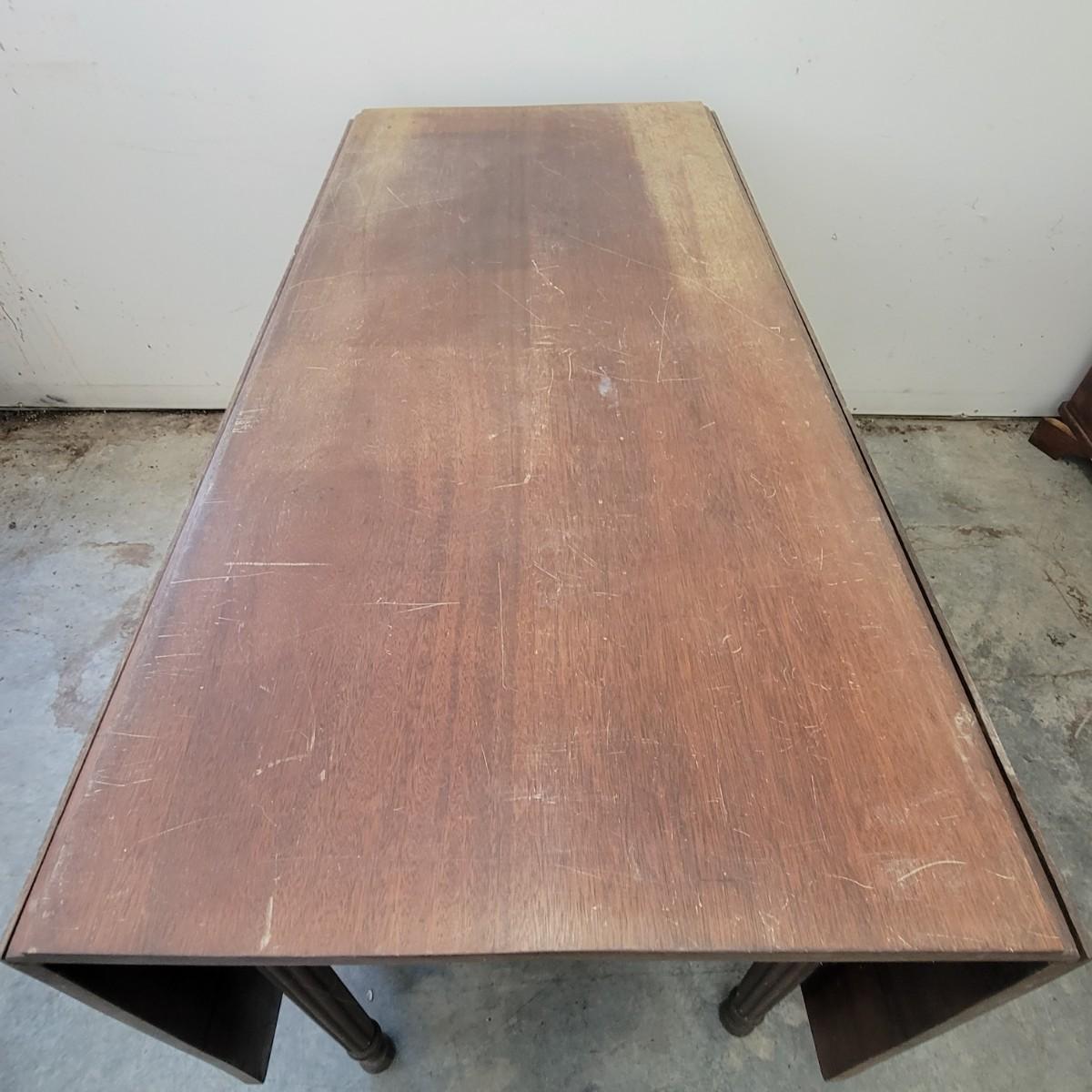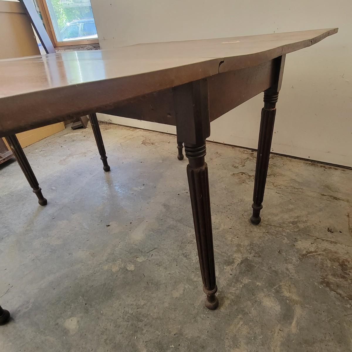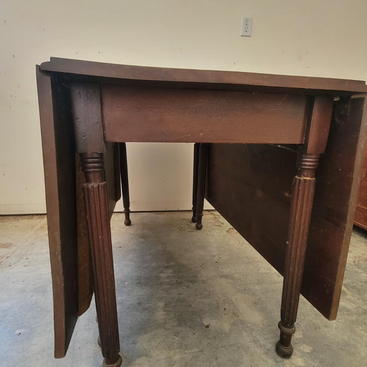 Solid wood drop leaf table with 6 legs. Measures approximately 63" x 48" x 28" when leafs are open and measures approximately 24" x 48" x 28" with the leafs down. Table top is warped and multiple legs need repair. Has quite a bit of wear and tear, see photos.