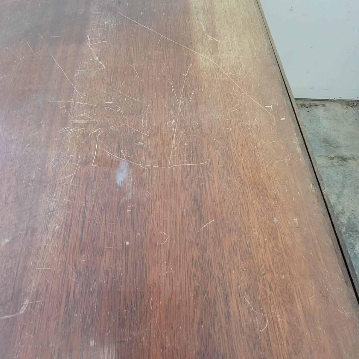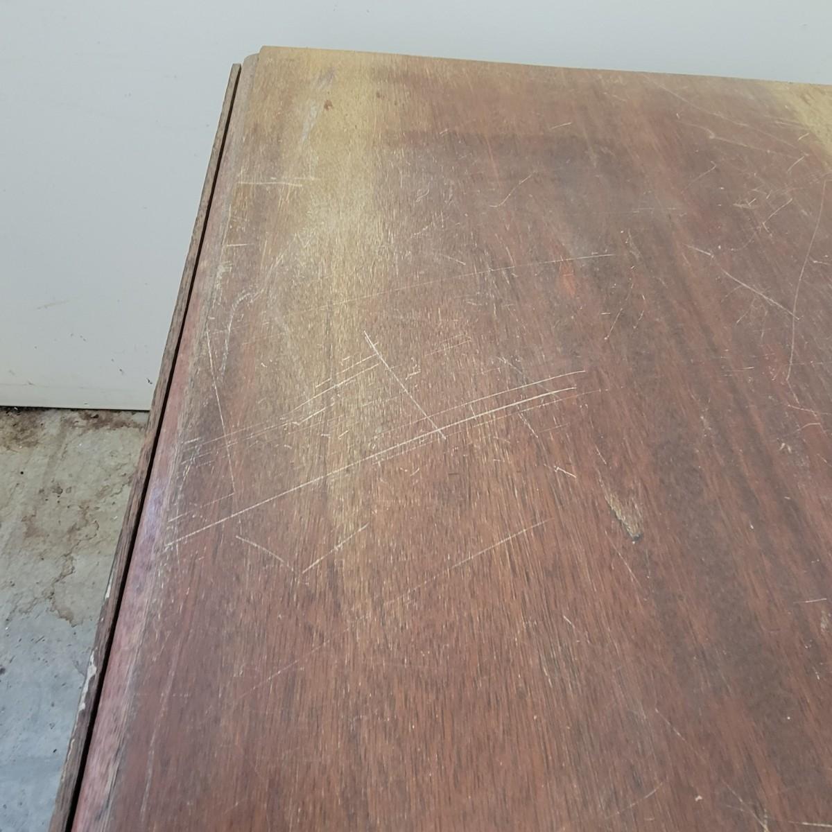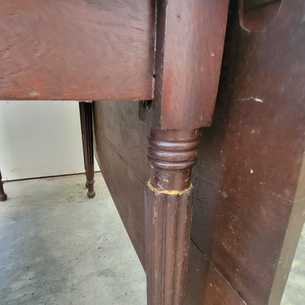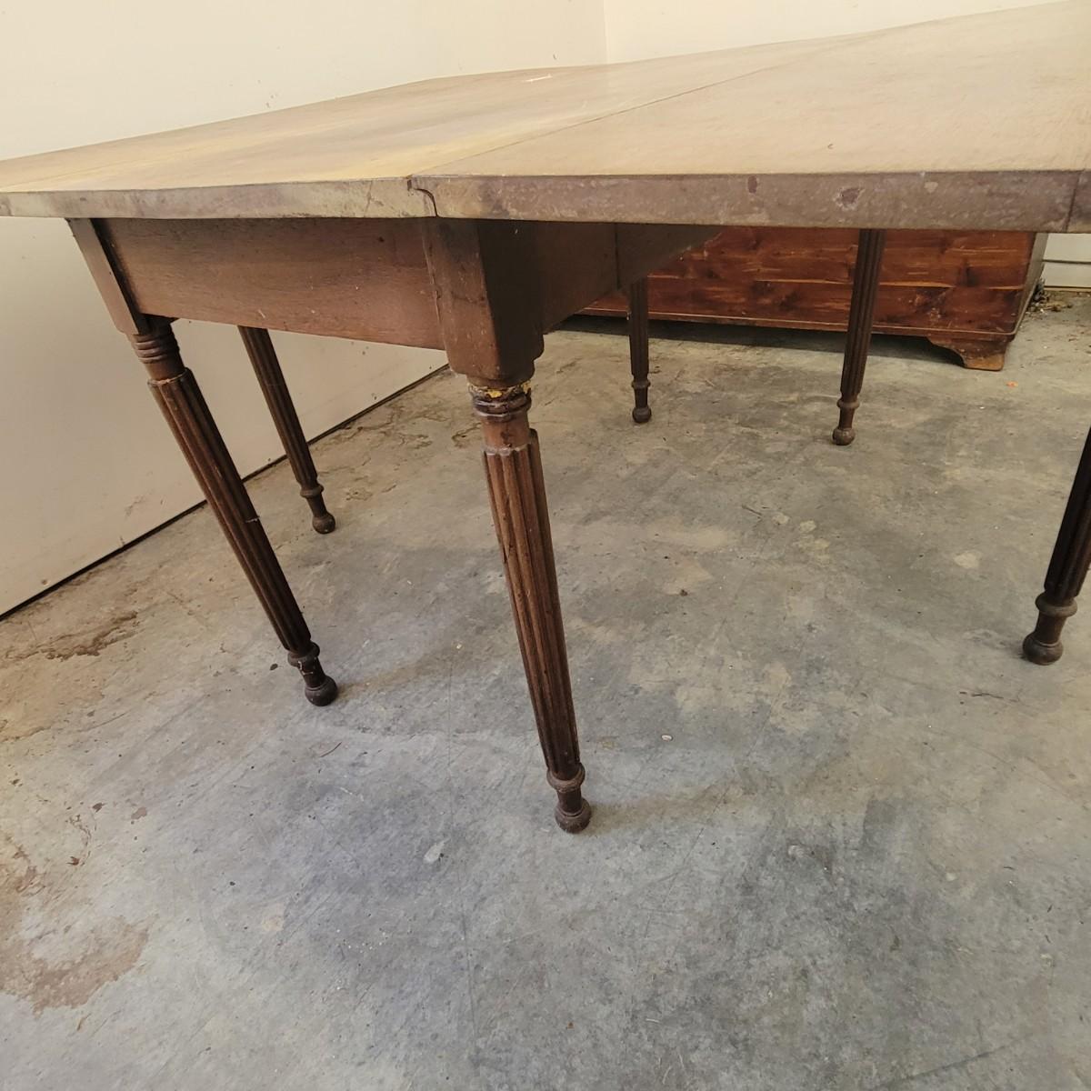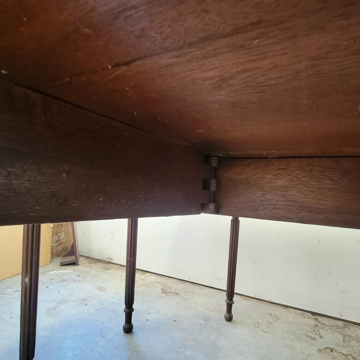 Solid wood drop leaf table with 6 legs. Measures approximately 63" x 48" x 28" when leafs are open and measures approximately 24" x 48" x 28" with the leafs down. Table top is warped and multiple legs need repair. Has quite a bit of wear and tear, see photos.