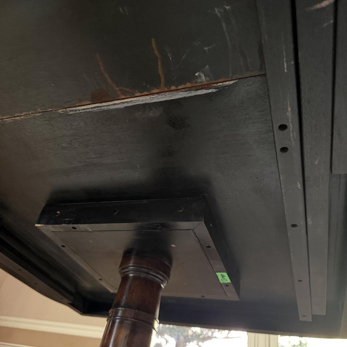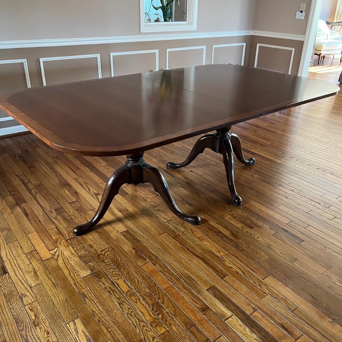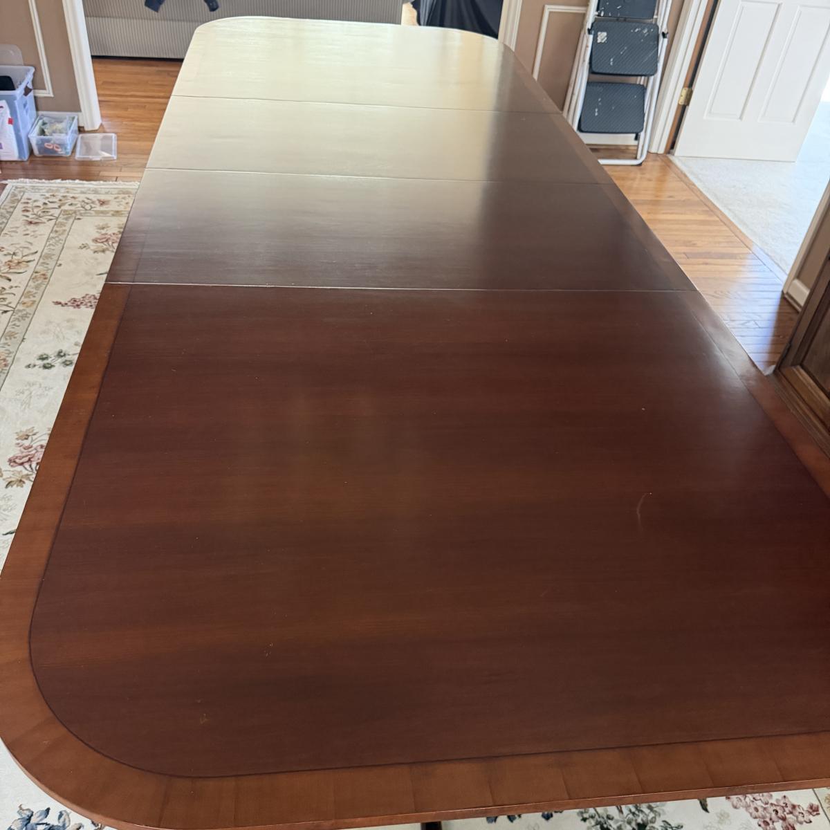 Lot includes a large dual pedestal dining table with two 22” leaves. Table measures 48” x 82” x 30”H with no leaves and 48” x 126” x 30”H with both leaves in.