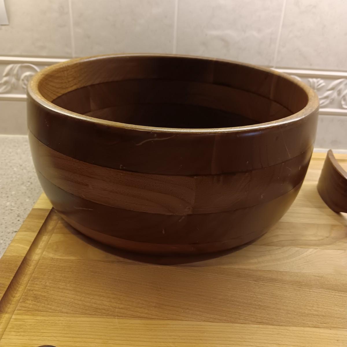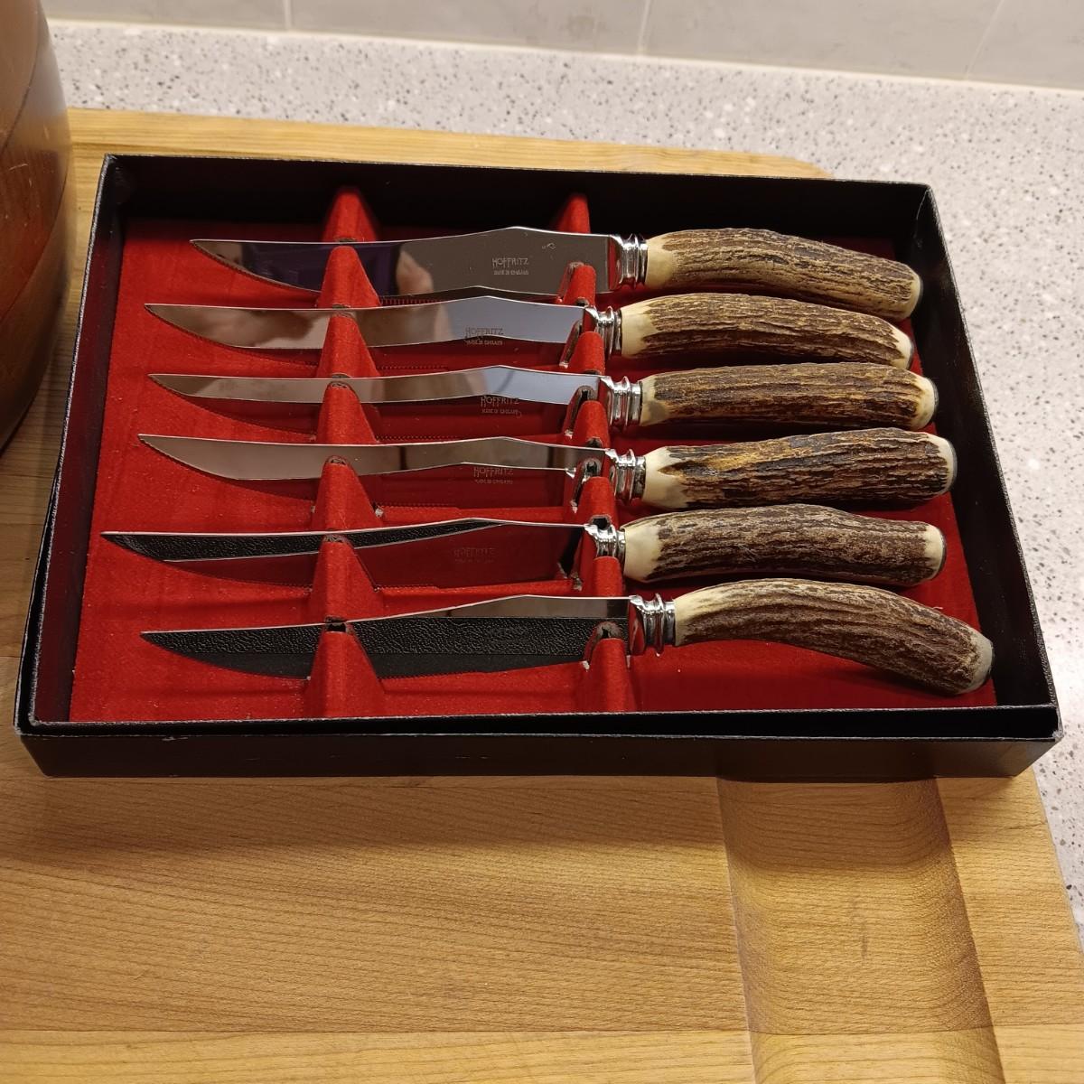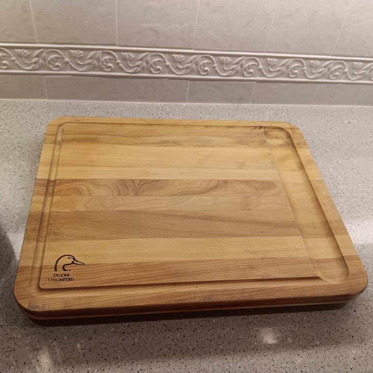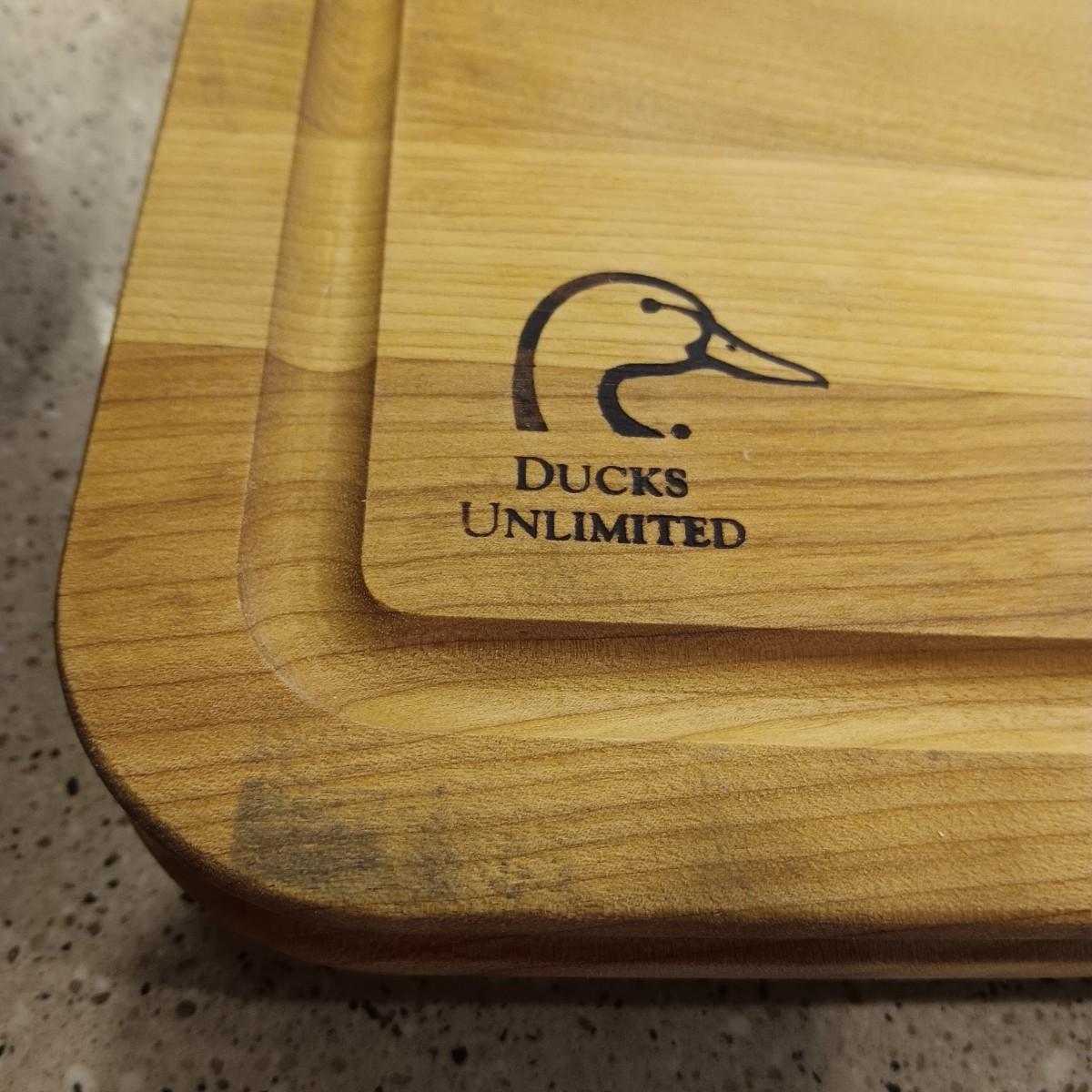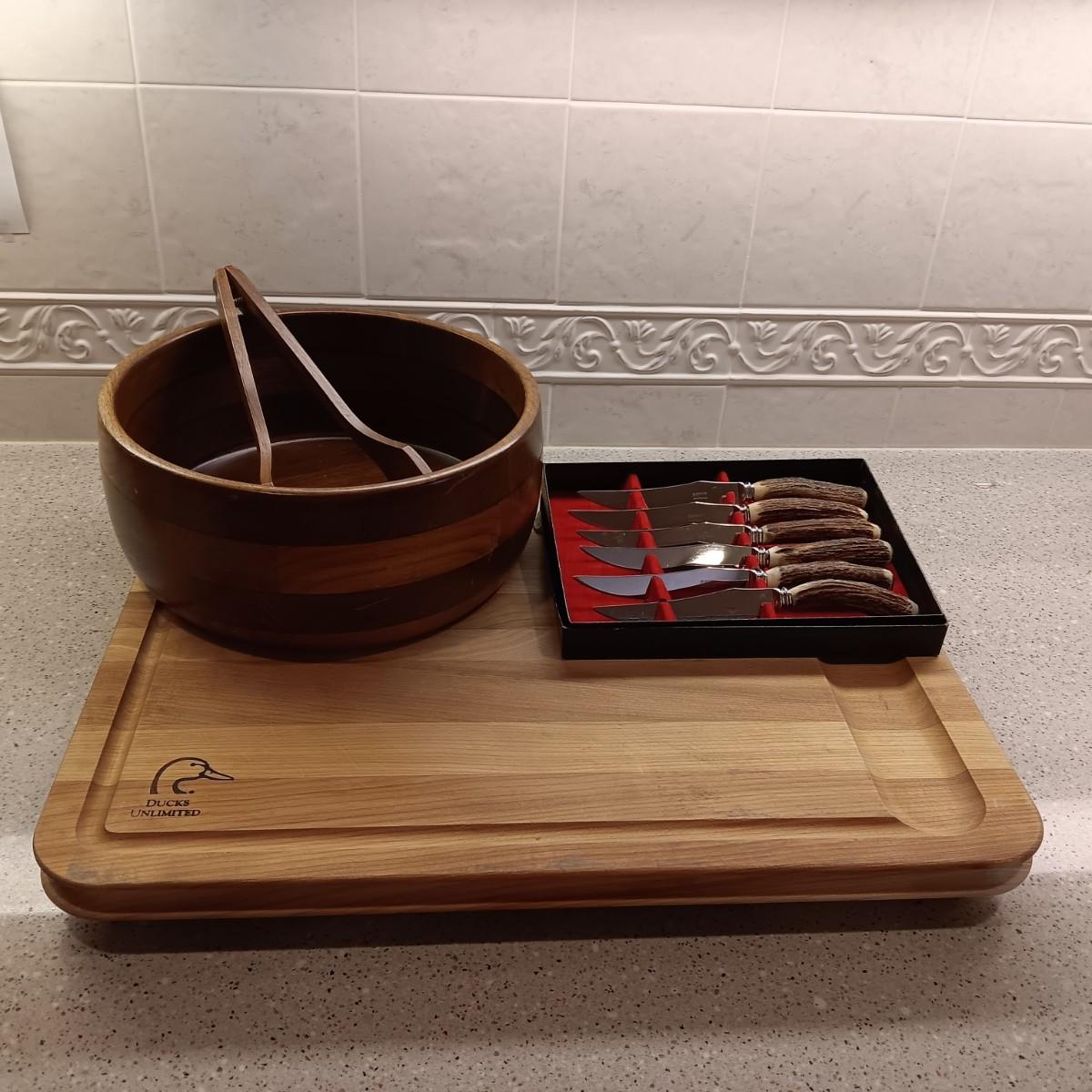 LARGE DUCKS UNLIMITED CUTTING BOARD, BLACK WALNUT SALAD BOWL & HOFFRITZ STEAK KNIVES