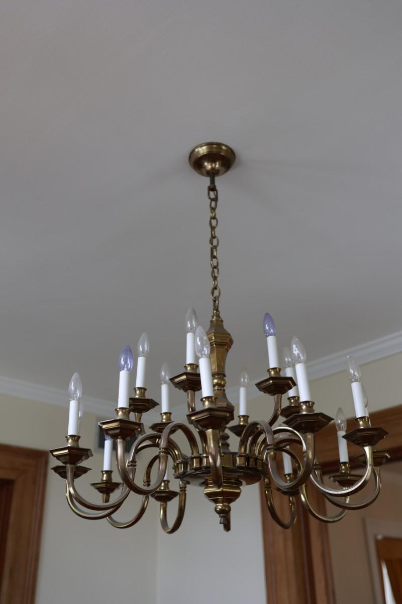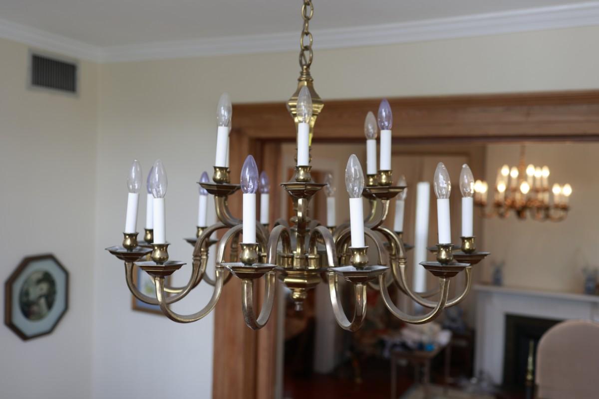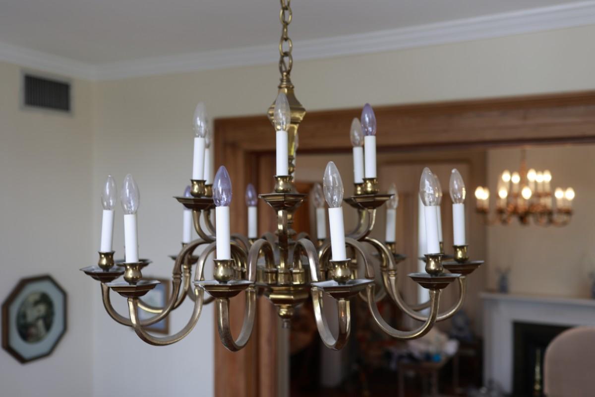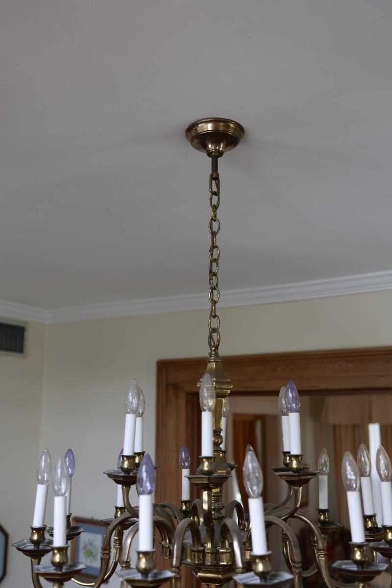 Large Two-Tier Brass Chandelier with 18 Candle-Style Lights.