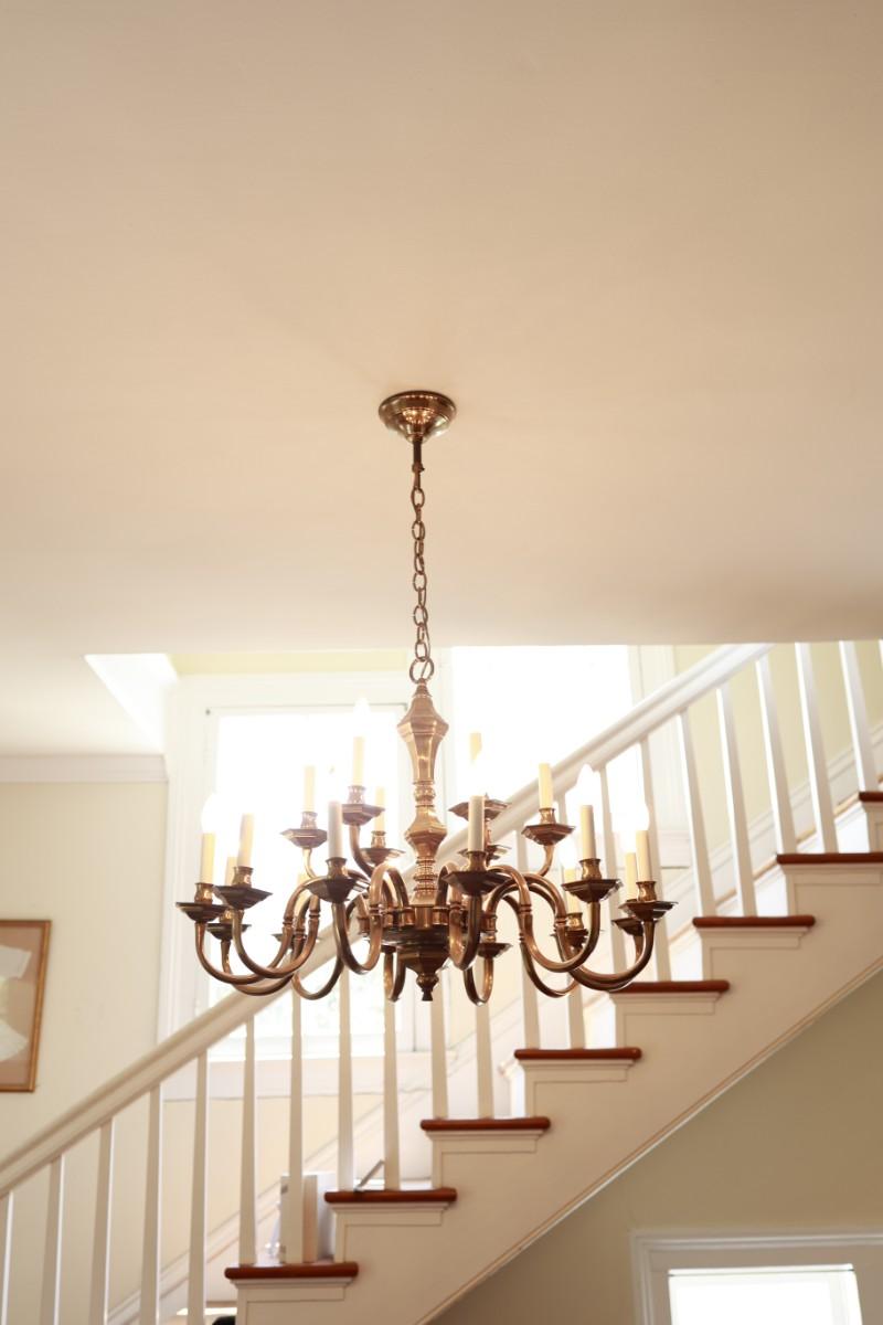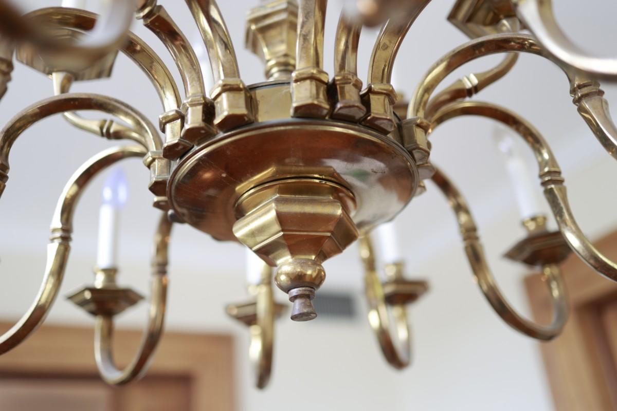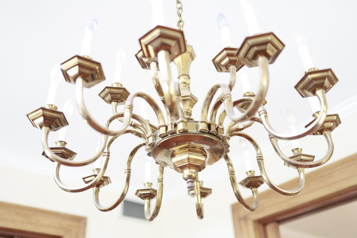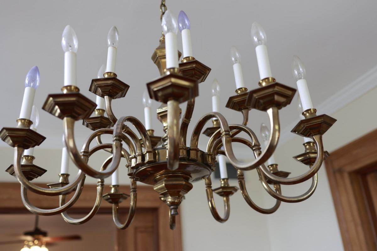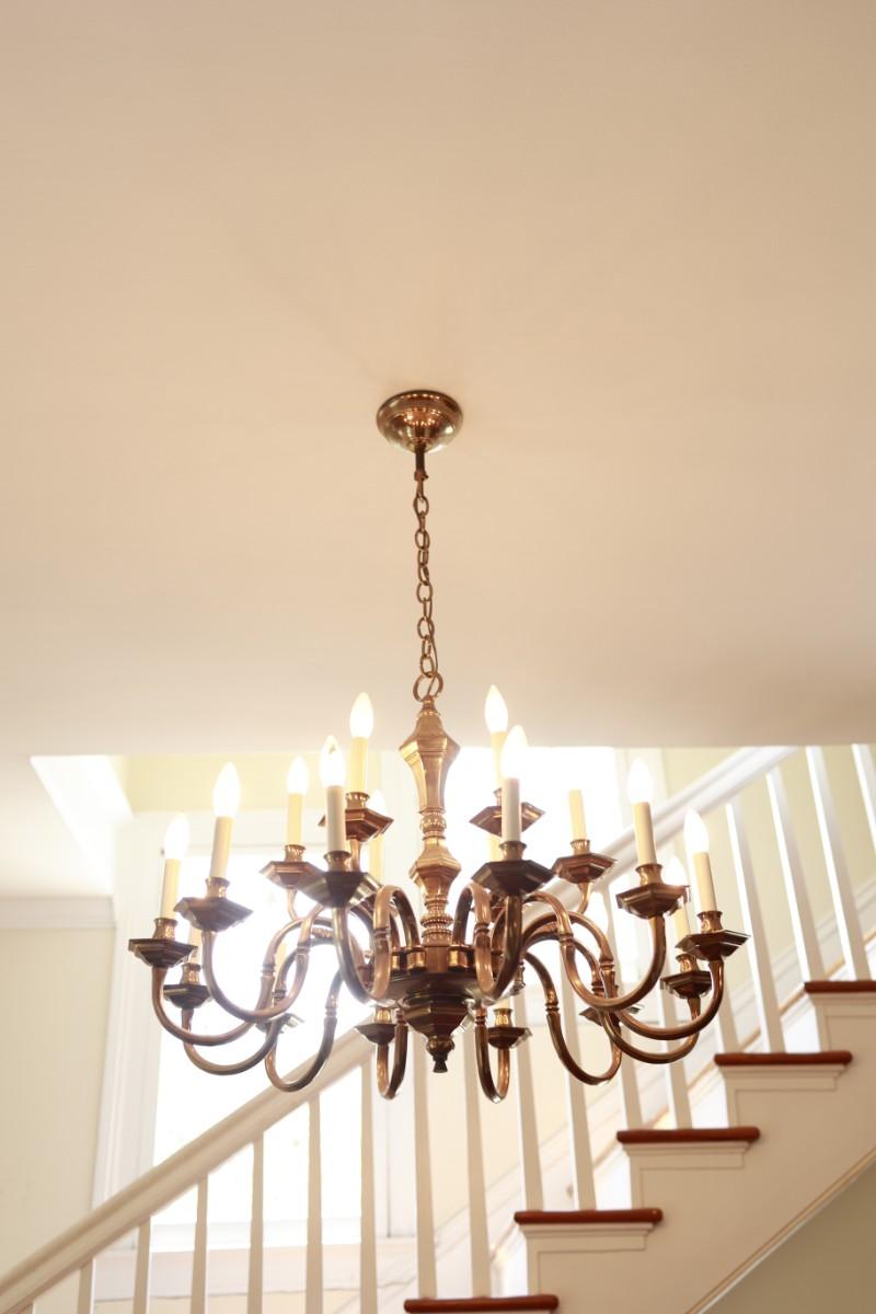 Large Two-Tier Brass Chandelier with 18 Candle-Style Lights.
