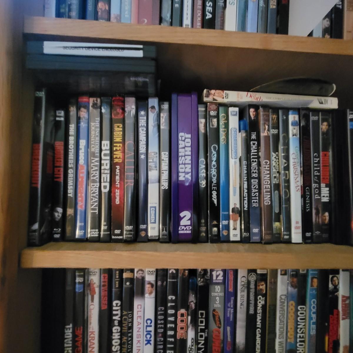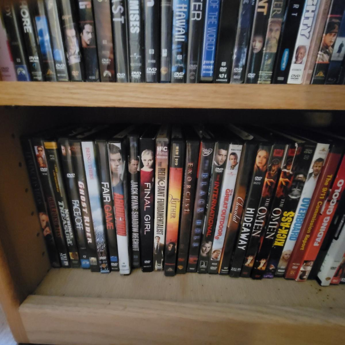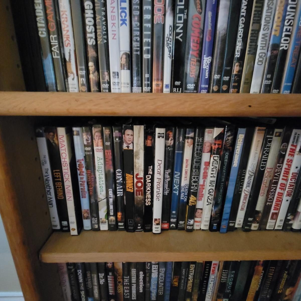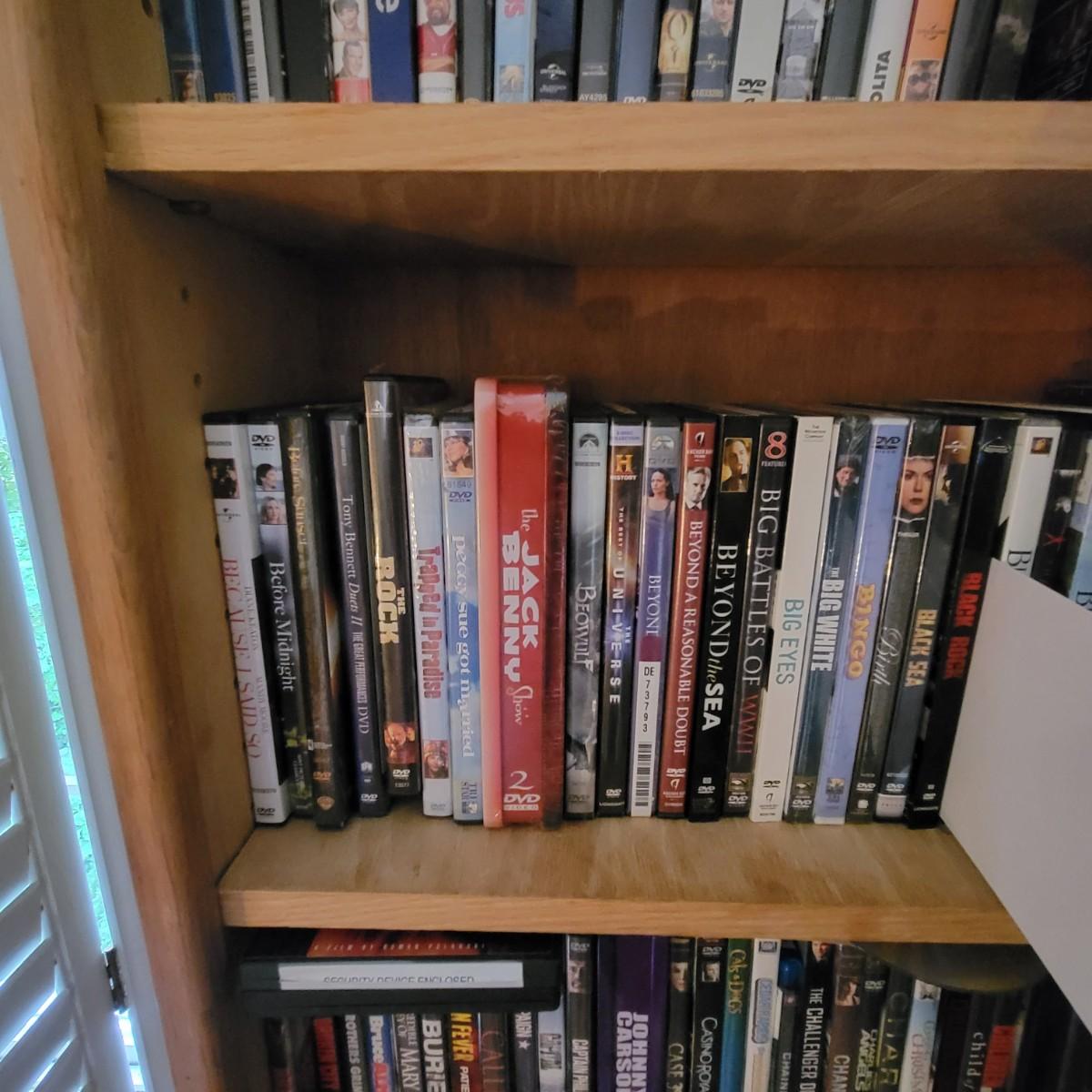 Large lot of DVDs including box sets of Jack Benny and Johnny Carson. Also includes a whole lot of Nicholas Cage movies. All are in good to new condition. Each shelf holds about 35 DVDs. Shelves are not included, but are for sale in this auction. This auction is for the DVDs on the left shelf. Local pickup only