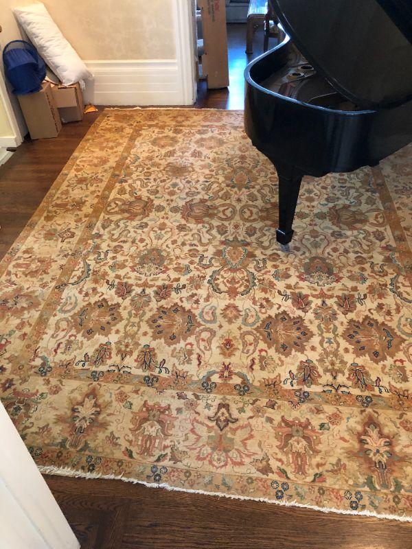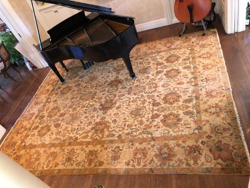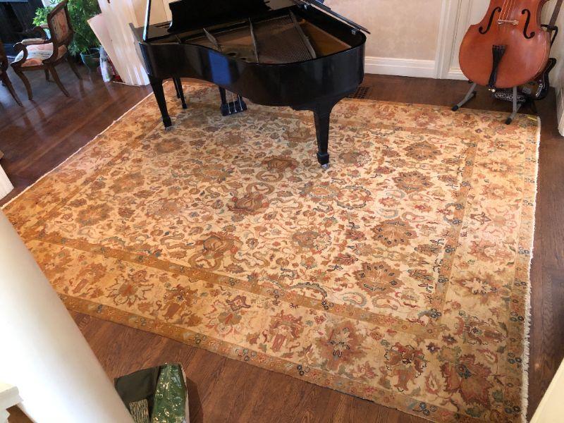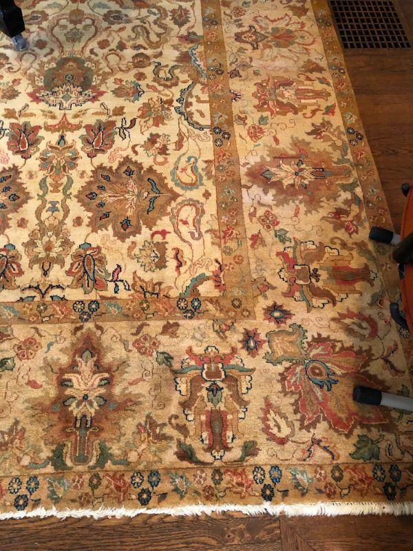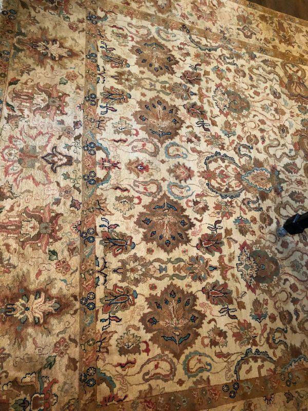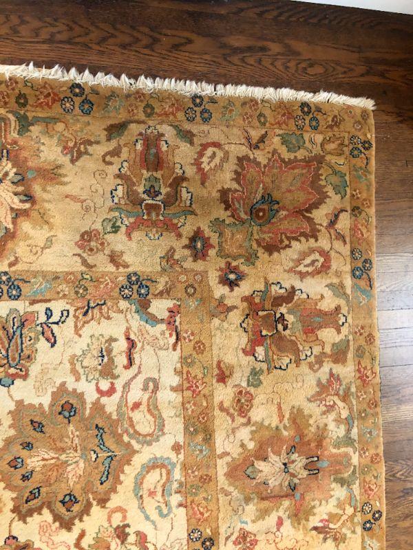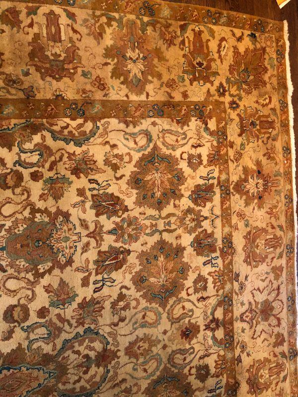 Beautiful large hand woven area rug in an elegant tan design. Measures approximately 12'9" x 9'10" (118 inches by 153 inches). Was kept in an interior room of the home and doesn't show color fading. In very good condition. From a San Francisco Presidio Heights family estate.