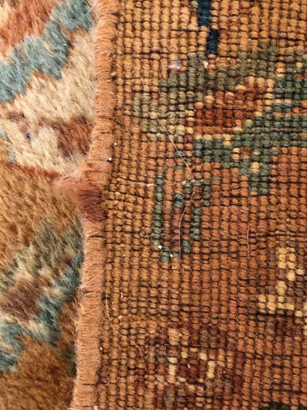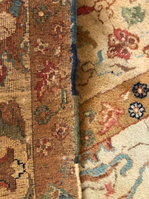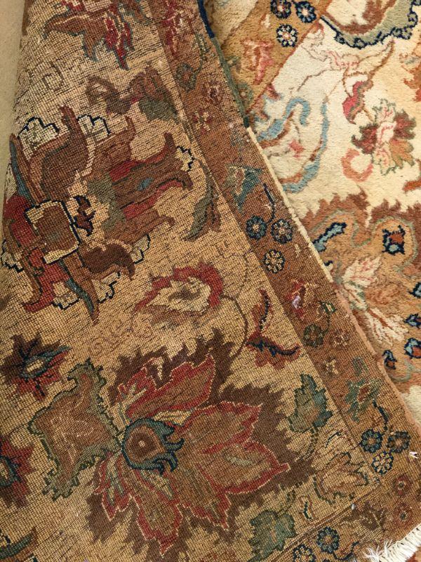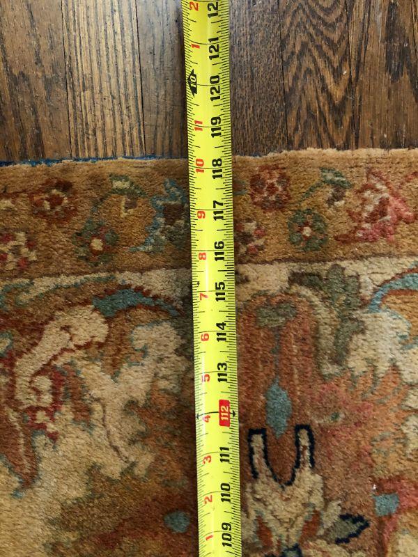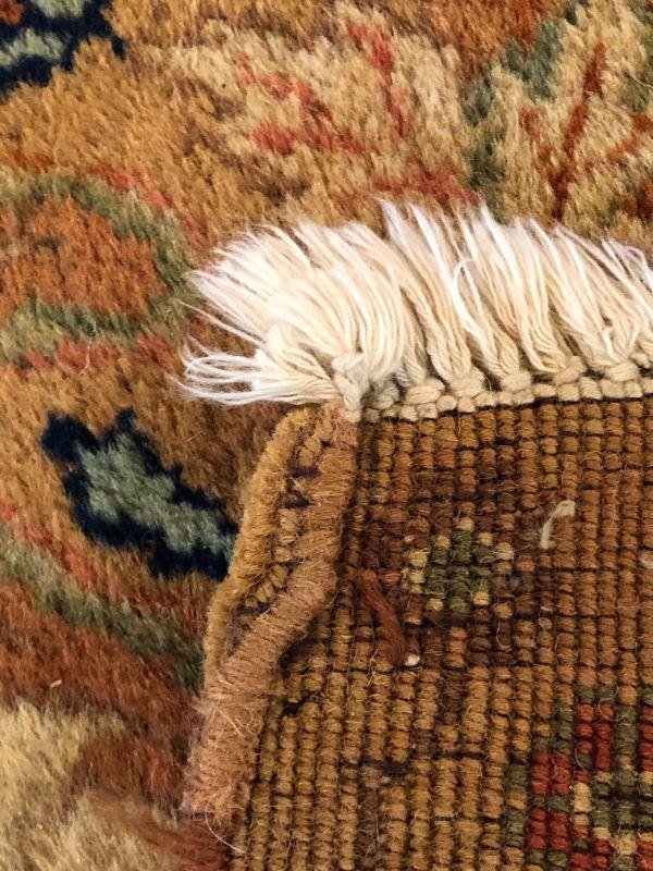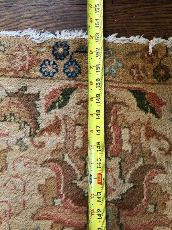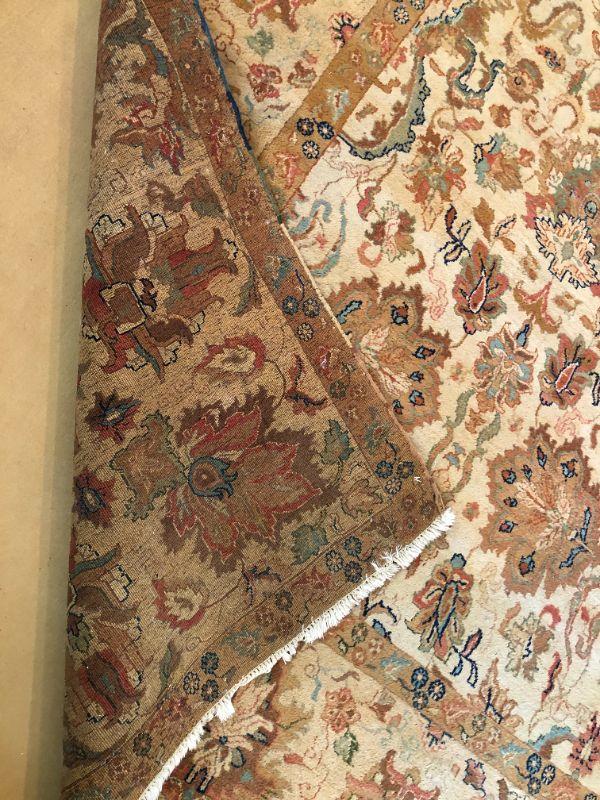 Beautiful large hand woven area rug in an elegant tan design. Measures approximately 12'9" x 9'10" (118 inches by 153 inches). Was kept in an interior room of the home and doesn't show color fading. In very good condition. From a San Francisco Presidio Heights family estate.