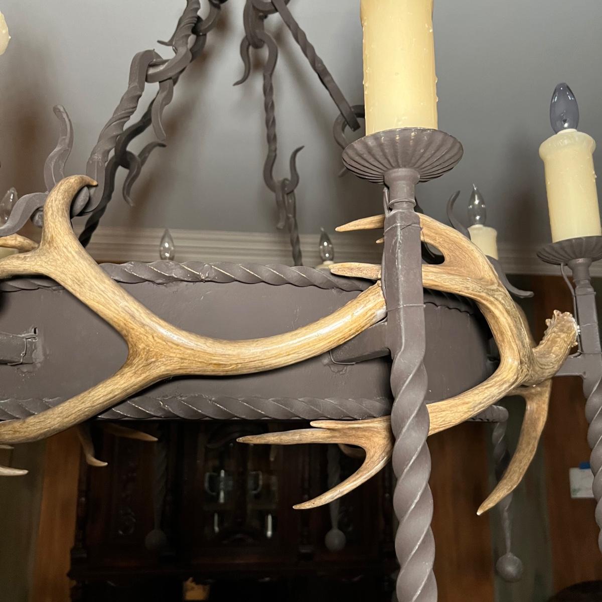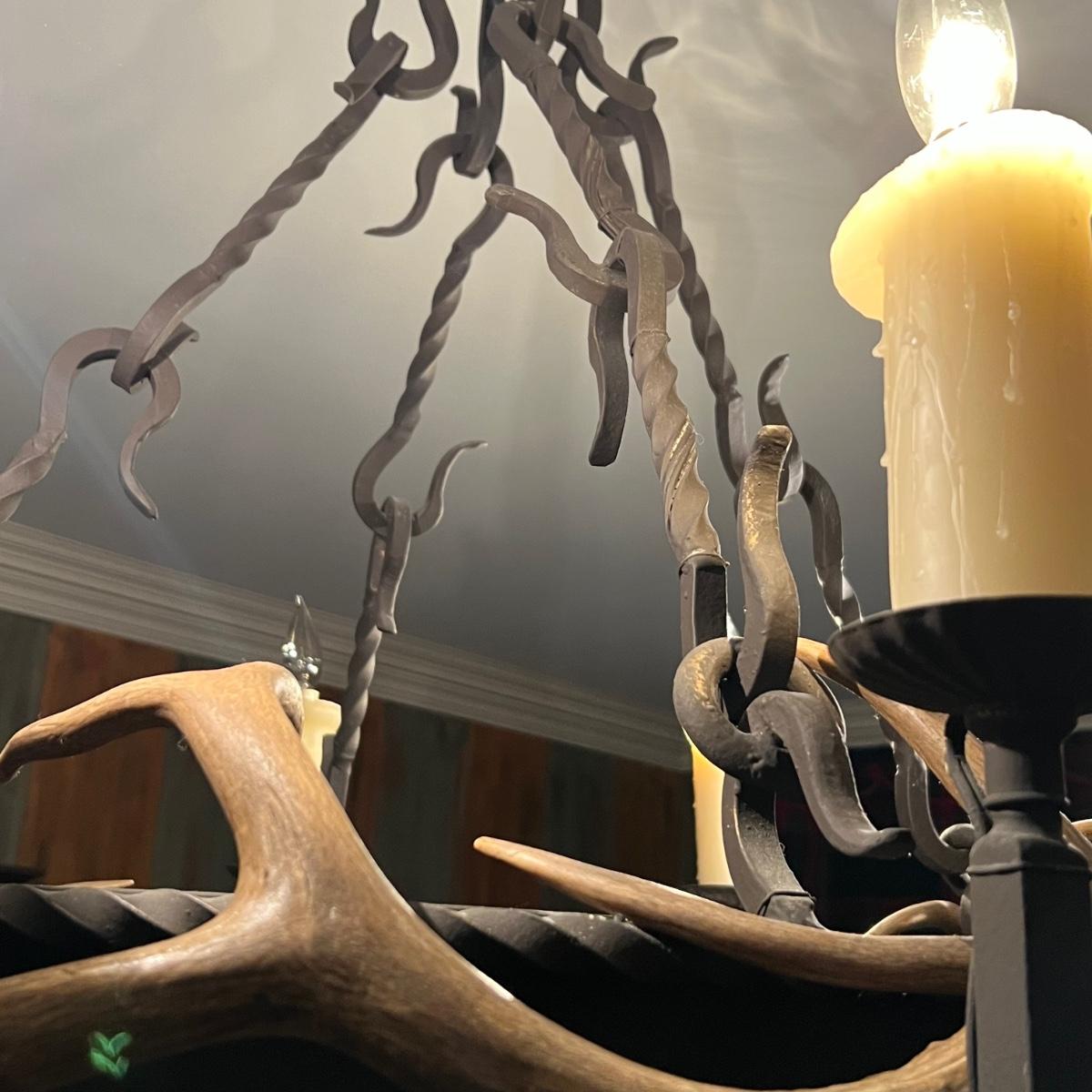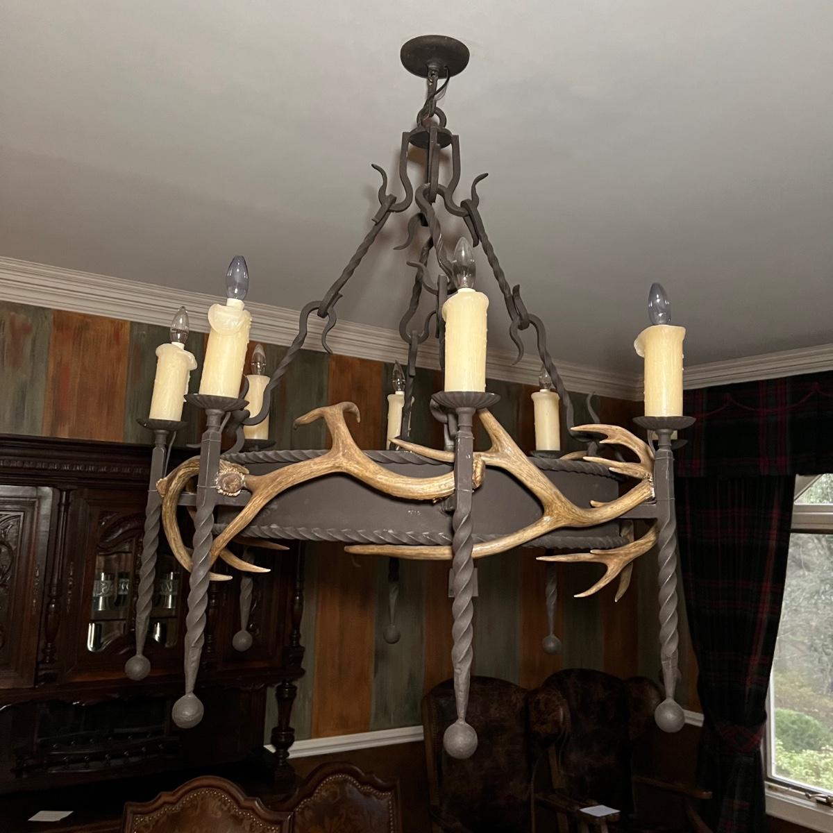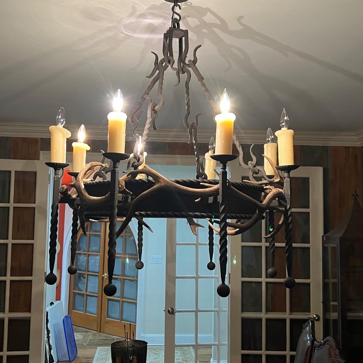This large chandelier is a heavy, possibly iron frame adorned with elk antlers. We cannot guarantee they are real but they are authentic looking. Eight faux candles house the light bulbs, a few of which need replacing. A tag with a hefty price tag tells us that this came from High Country Furniture & Design but again we cannot make any guarantees on this claim.