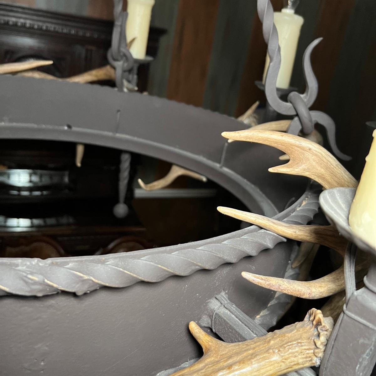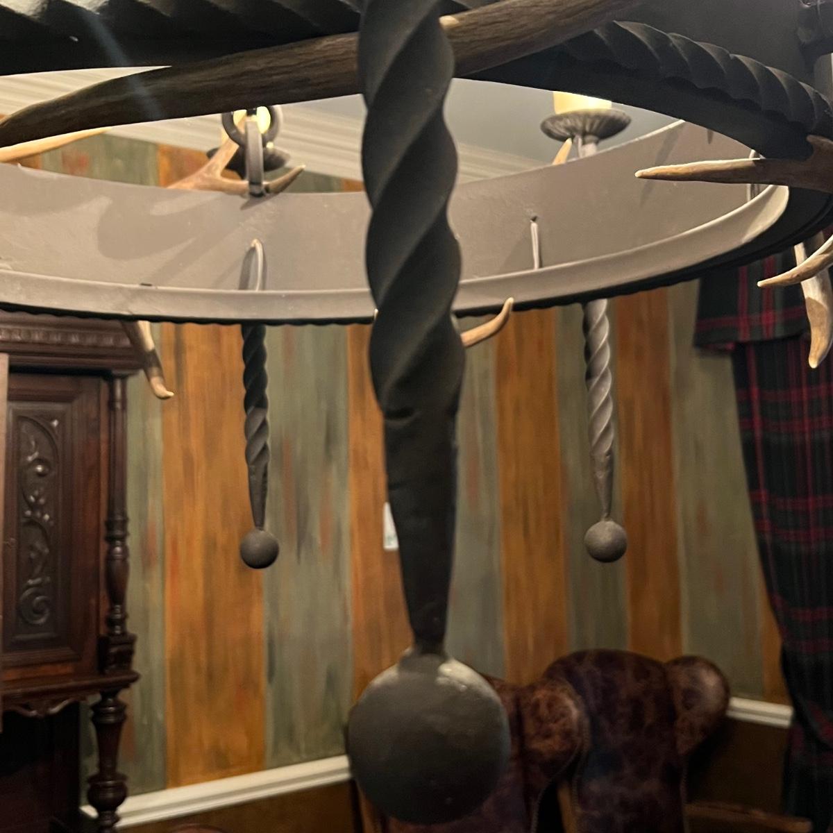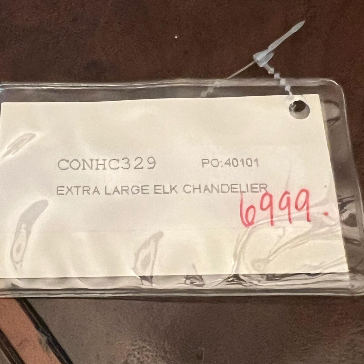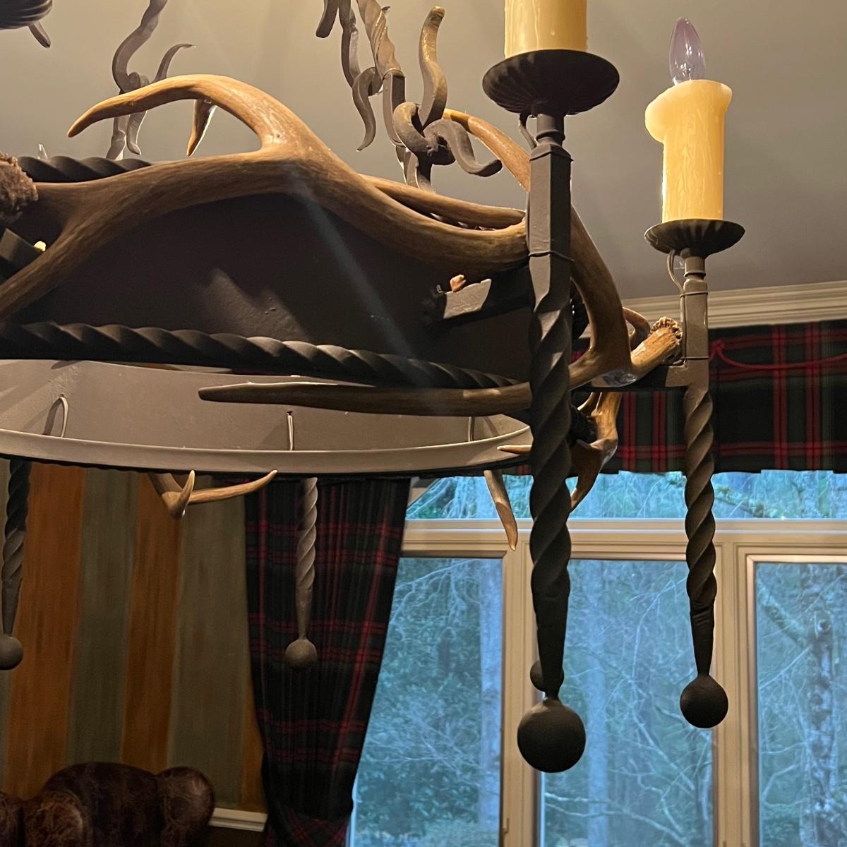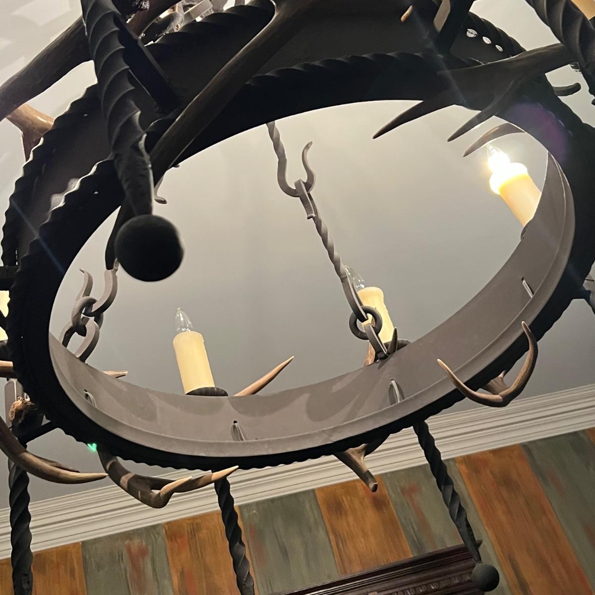 This large chandelier is a heavy, possibly iron frame adorned with elk antlers. We cannot guarantee they are real but they are authentic looking. Eight faux candles house the light bulbs, a few of which need replacing. A tag with a hefty price tag tells us that this came from High Country Furniture & Design but again we cannot make any guarantees on this claim.