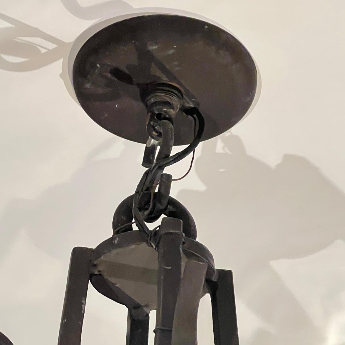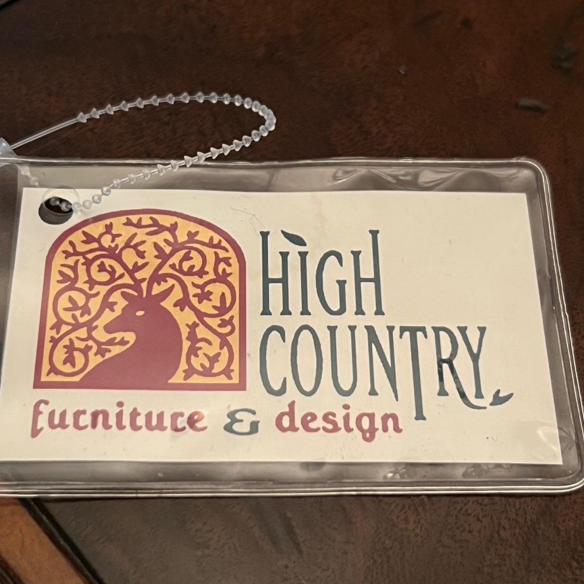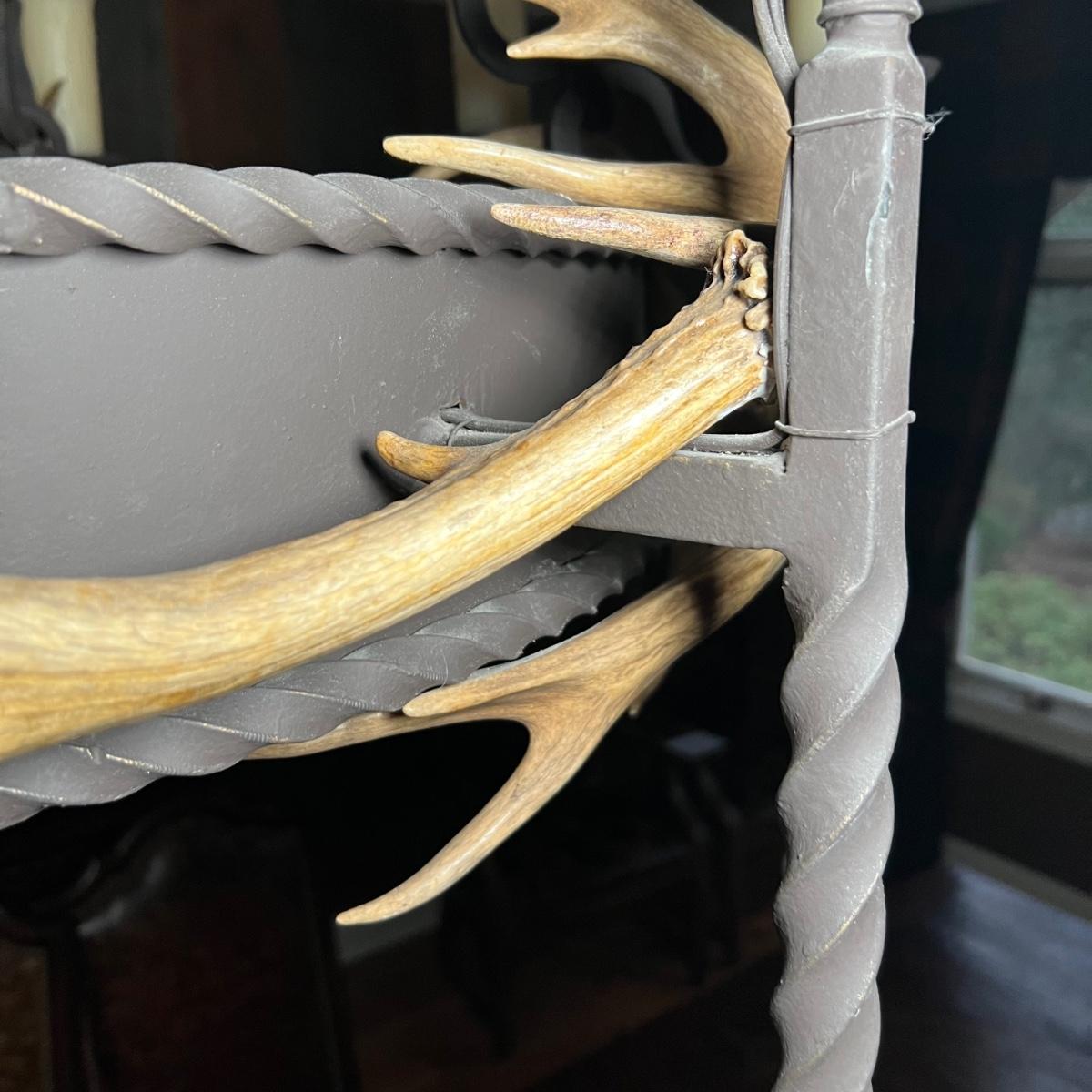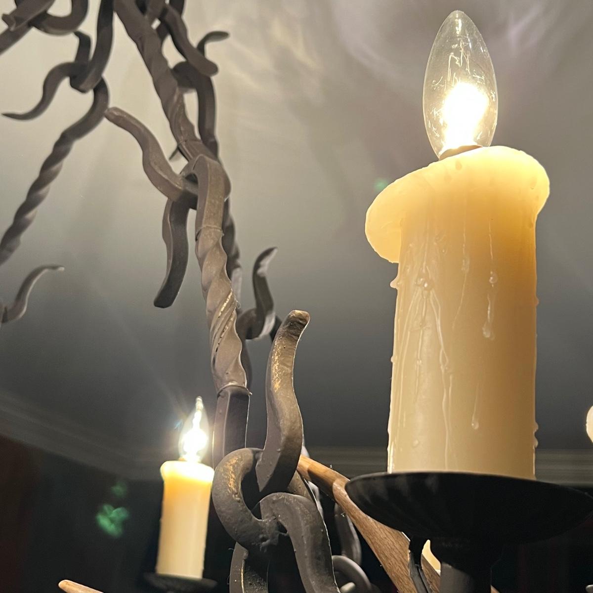This large chandelier is a heavy, possibly iron frame adorned with elk antlers. We cannot guarantee they are real but they are authentic looking. Eight faux candles house the light bulbs, a few of which need replacing. A tag with a hefty price tag tells us that this came from High Country Furniture & Design but again we cannot make any guarantees on this claim.