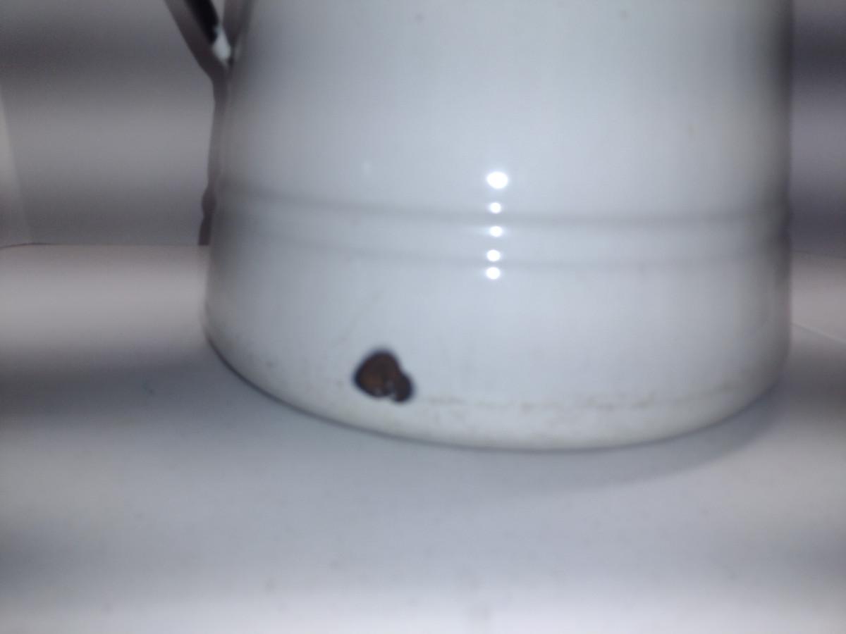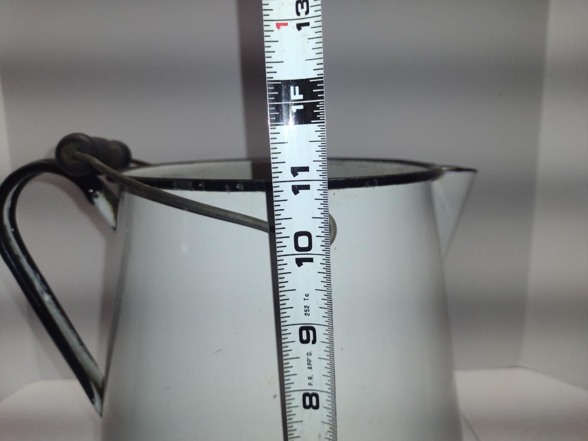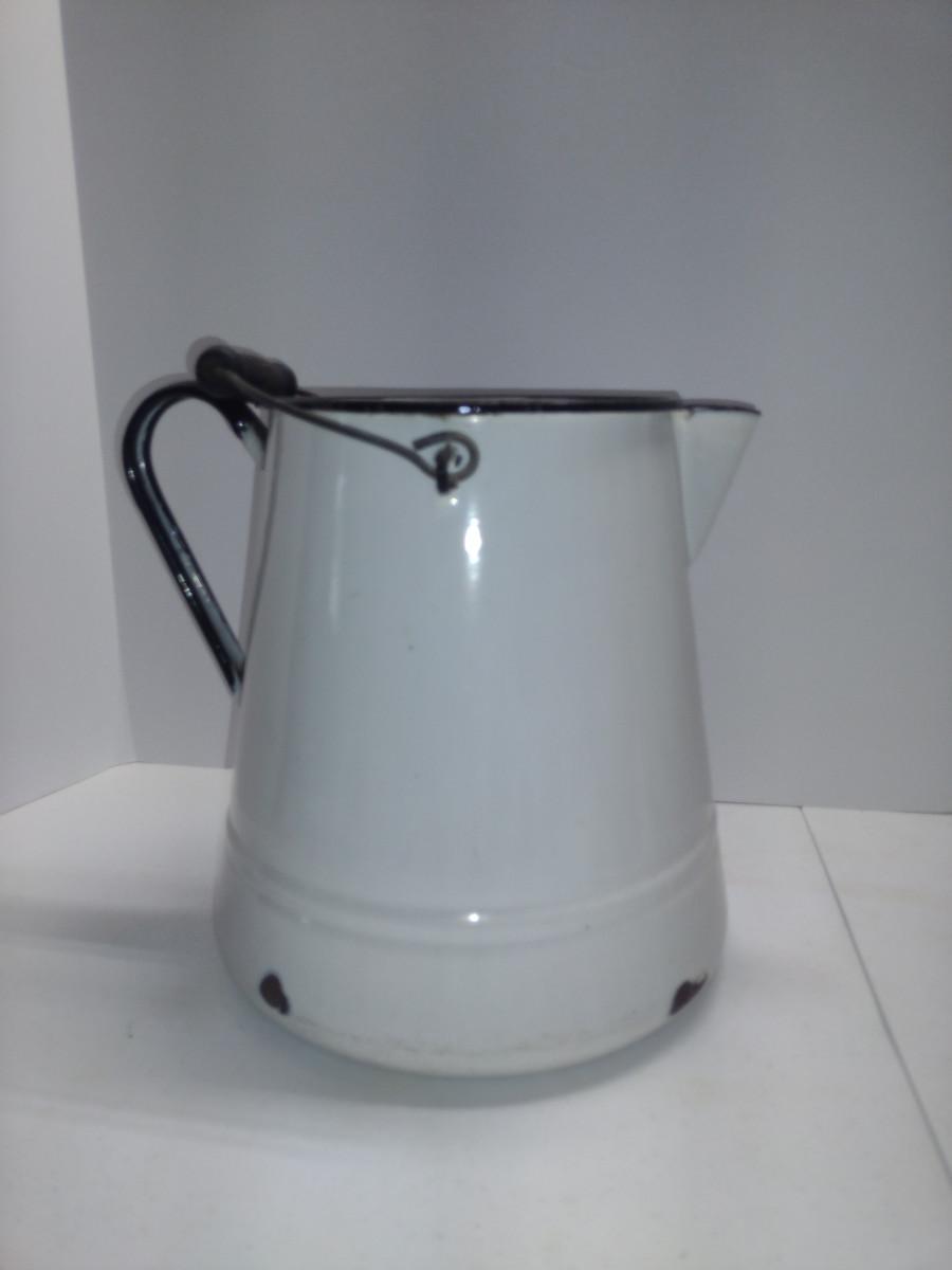 Large Enameled Metal Pitcher- Approx 11" Tall. Item has some chipping and is not water tight (hole in bottom). Please see all pictures for condition.