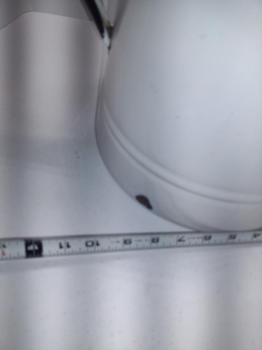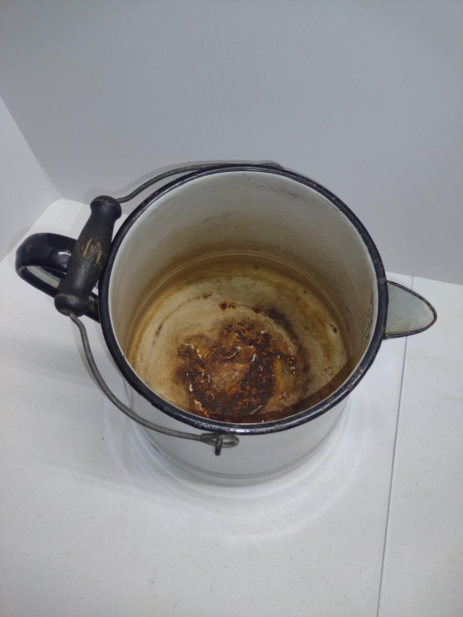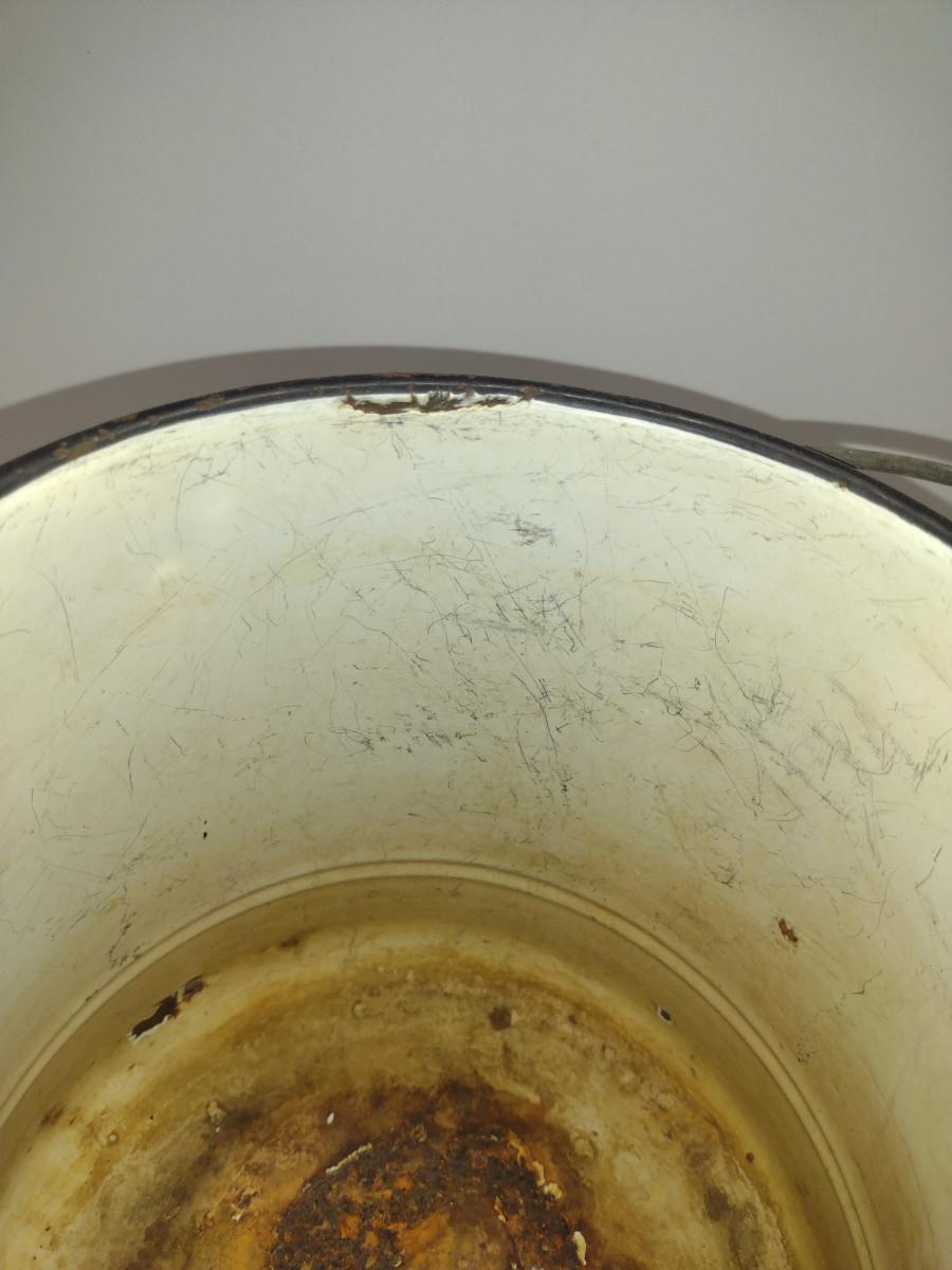 Large Enameled Metal Pitcher- Approx 11" Tall. Item has some chipping and is not water tight (hole in bottom). Please see all pictures for condition.