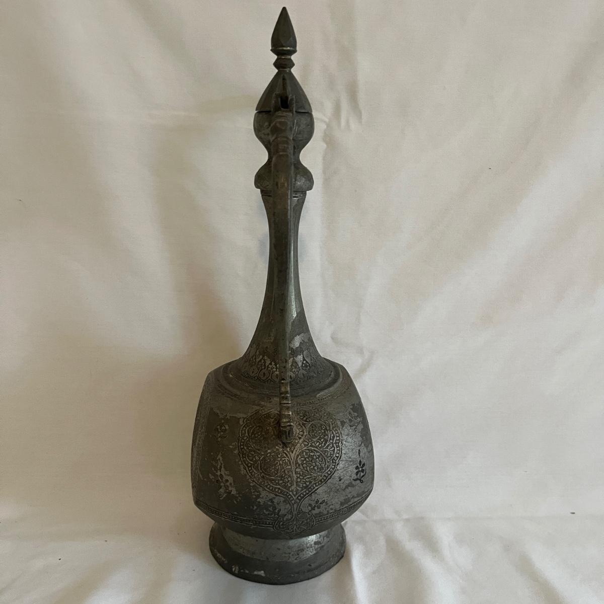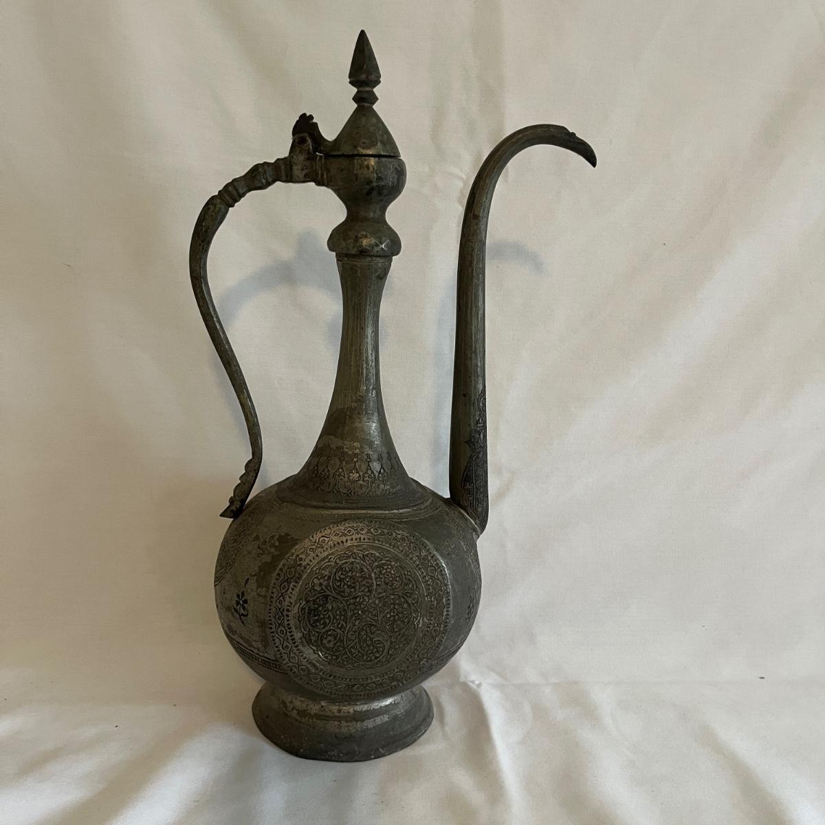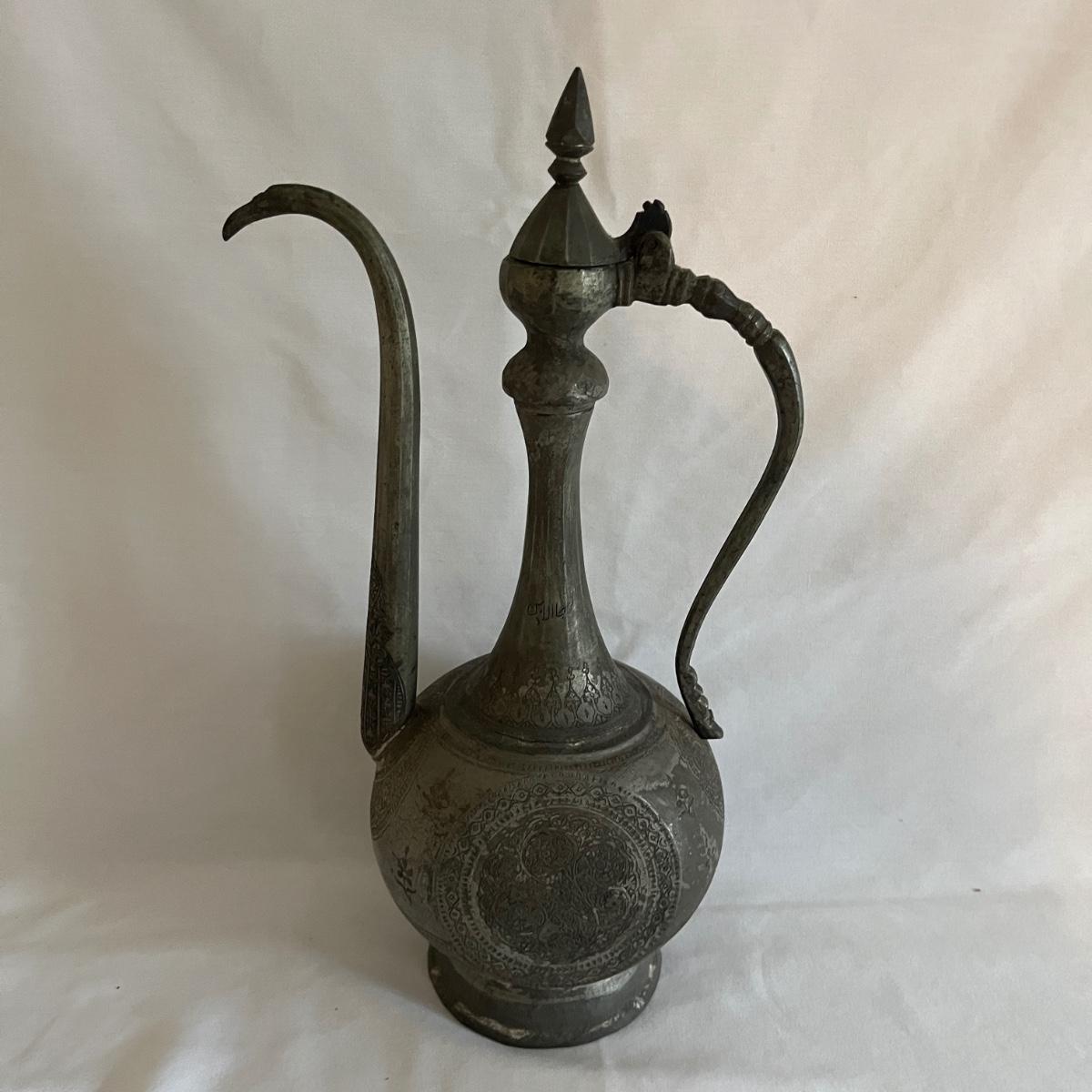 Lot includes a large metal engraved ewer that measures 9” x 6” x 18.5”H. There is some wear on the finish from age.