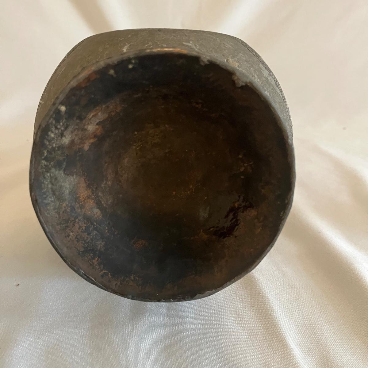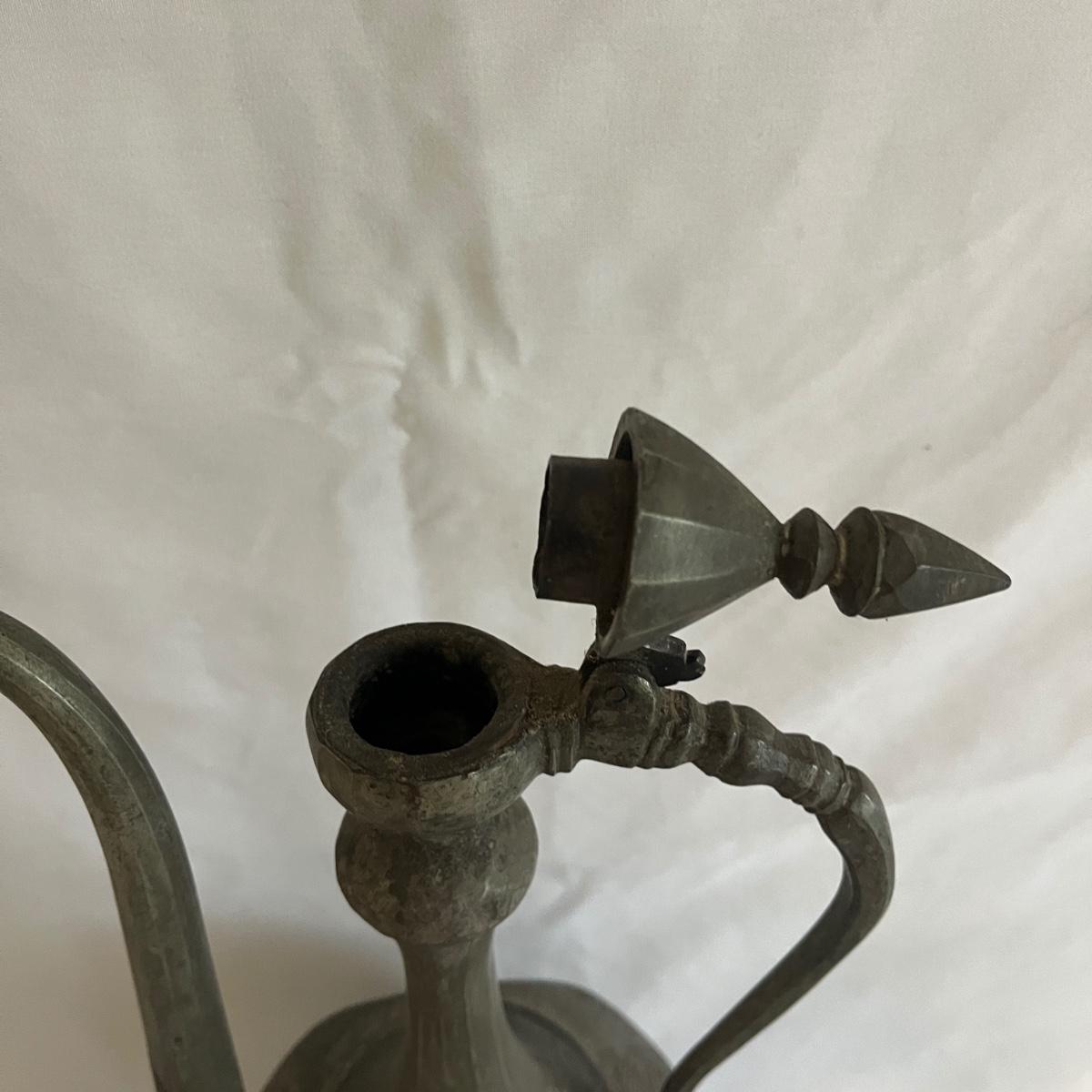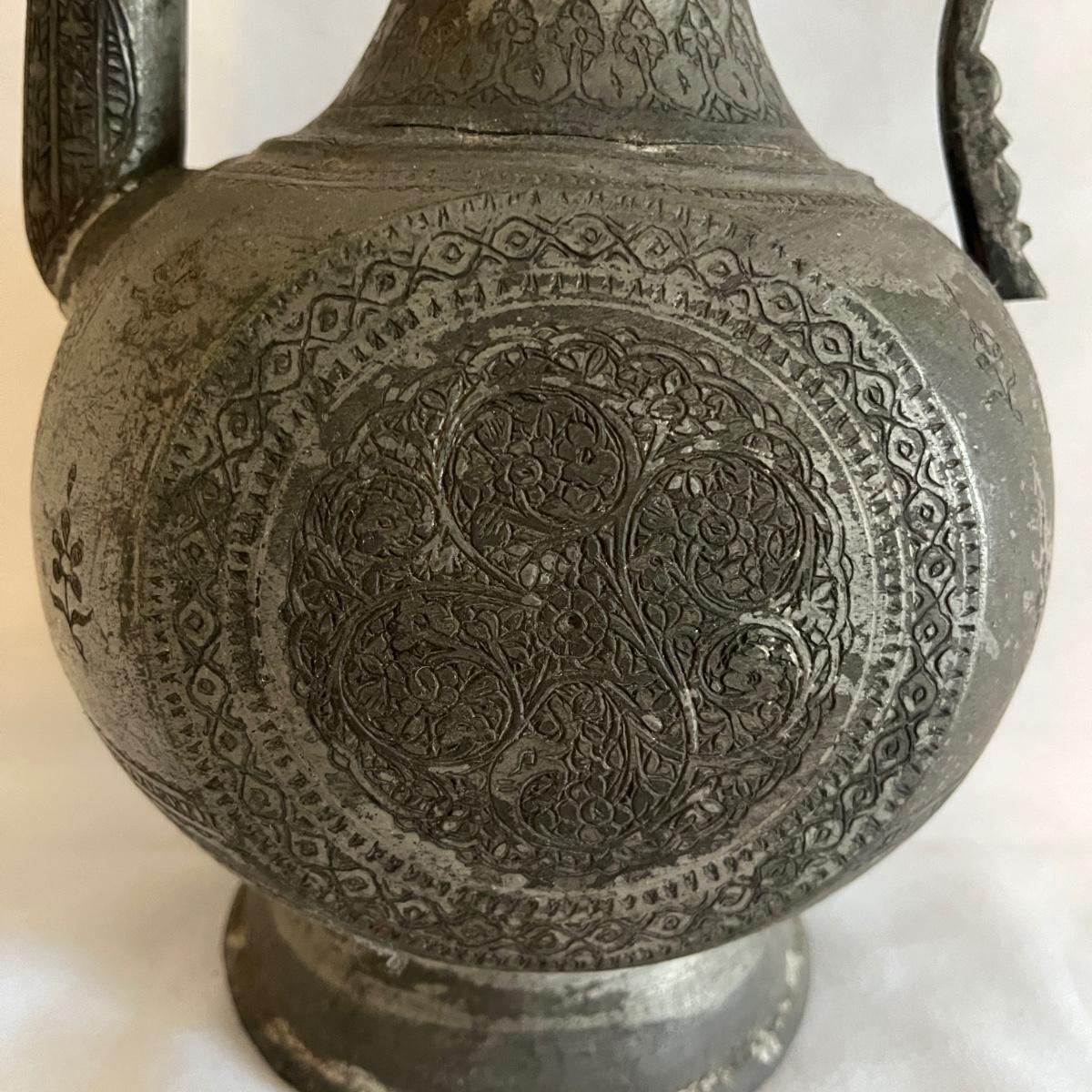 Lot includes a large metal engraved ewer that measures 9” x 6” x 18.5”H. There is some wear on the finish from age.