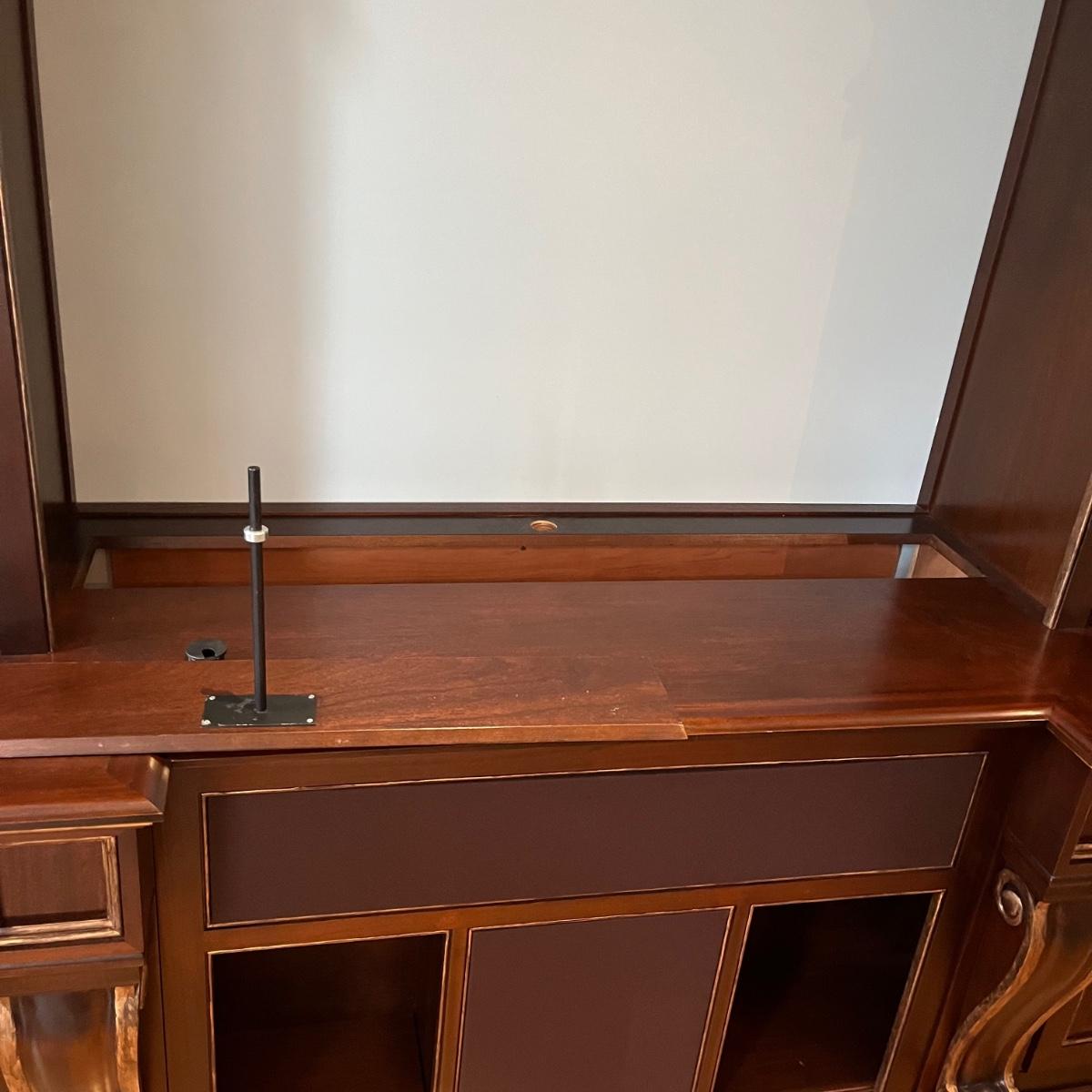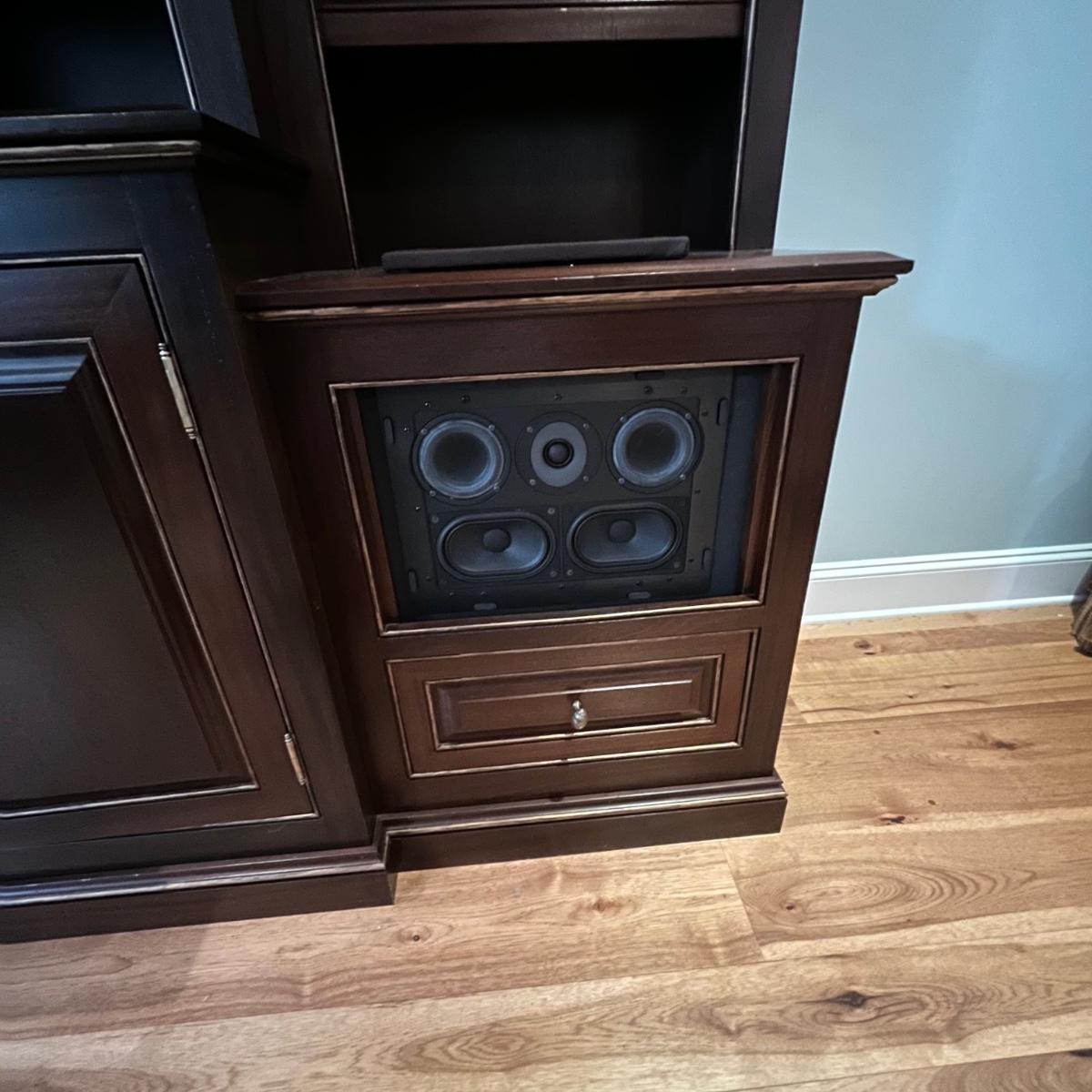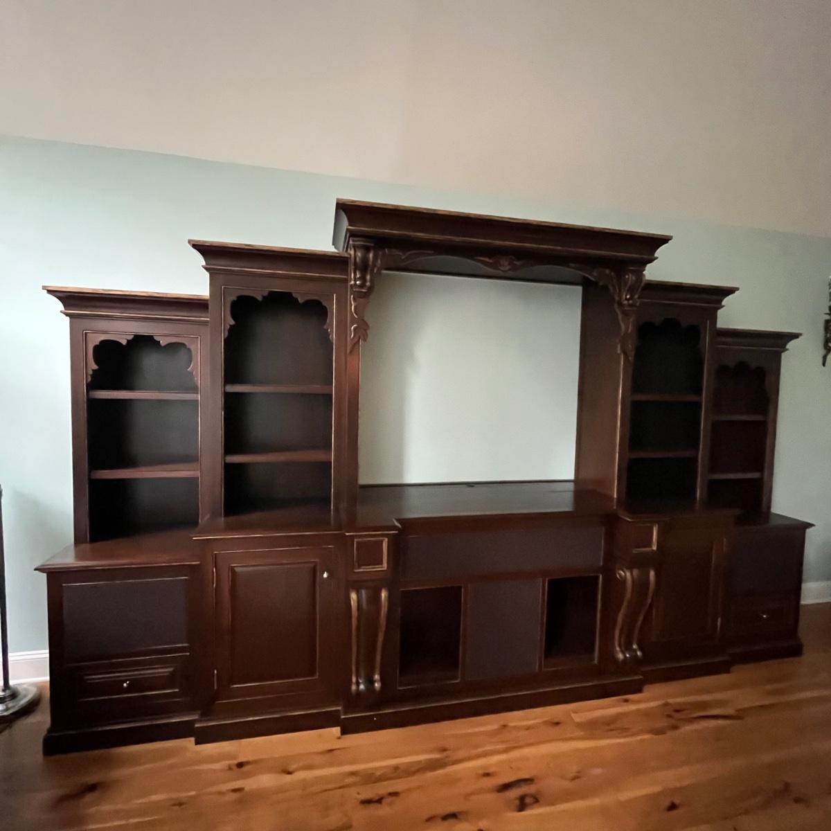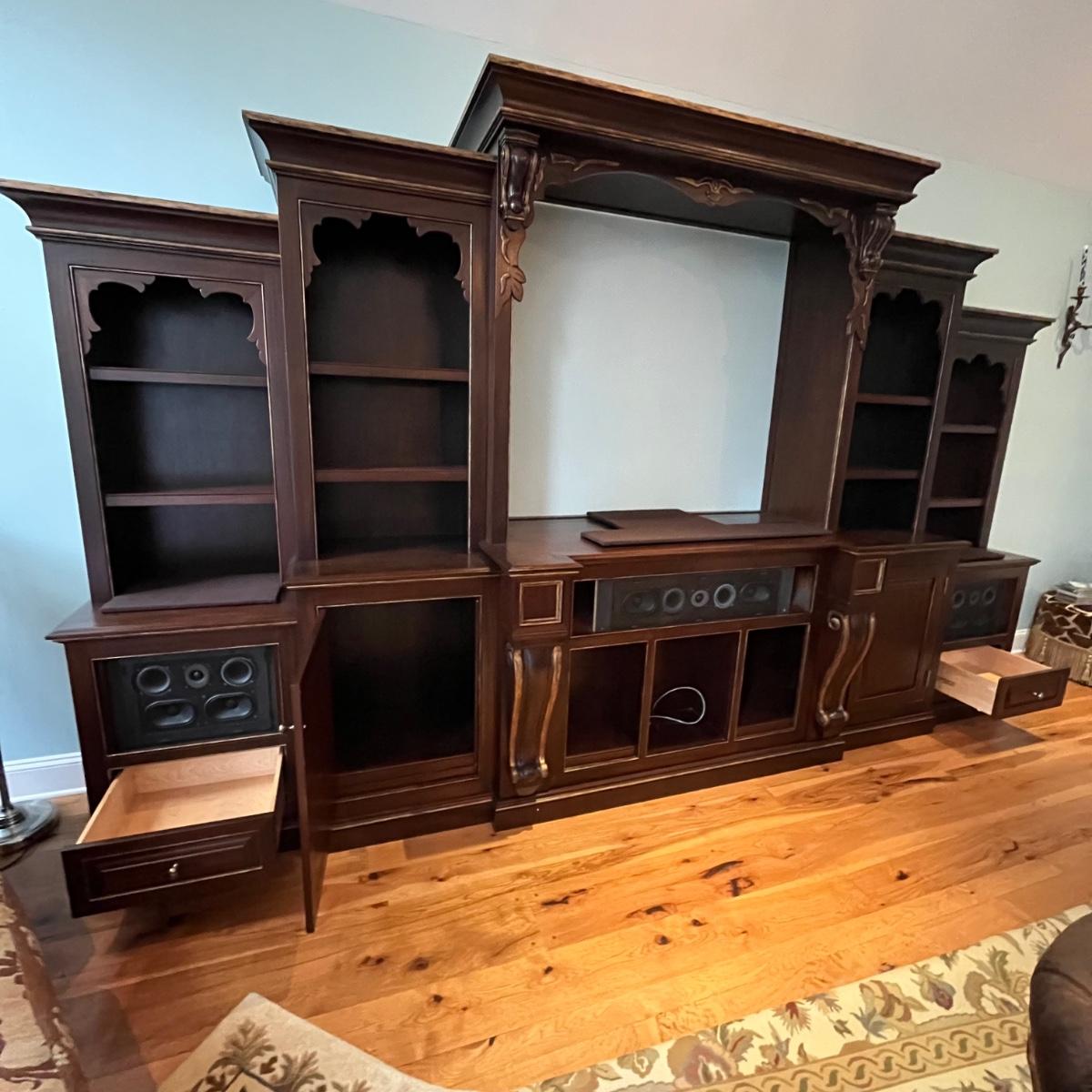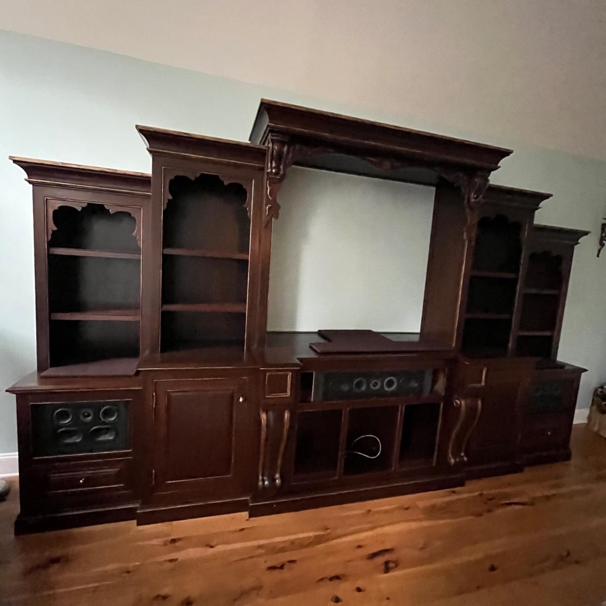 Lot includes a large solid wood entertainment center by Square Peg of Asheville. Unit has three built in speakers, a spot for a subwoofer and a slide out tray for home entertainment electronics. Unit measures 164” x 32” x 96”H. Winning bidder must bring assistance to help move and load this item due to its weight and/or size. This unit is very heavy and will need to be taken apart to move.