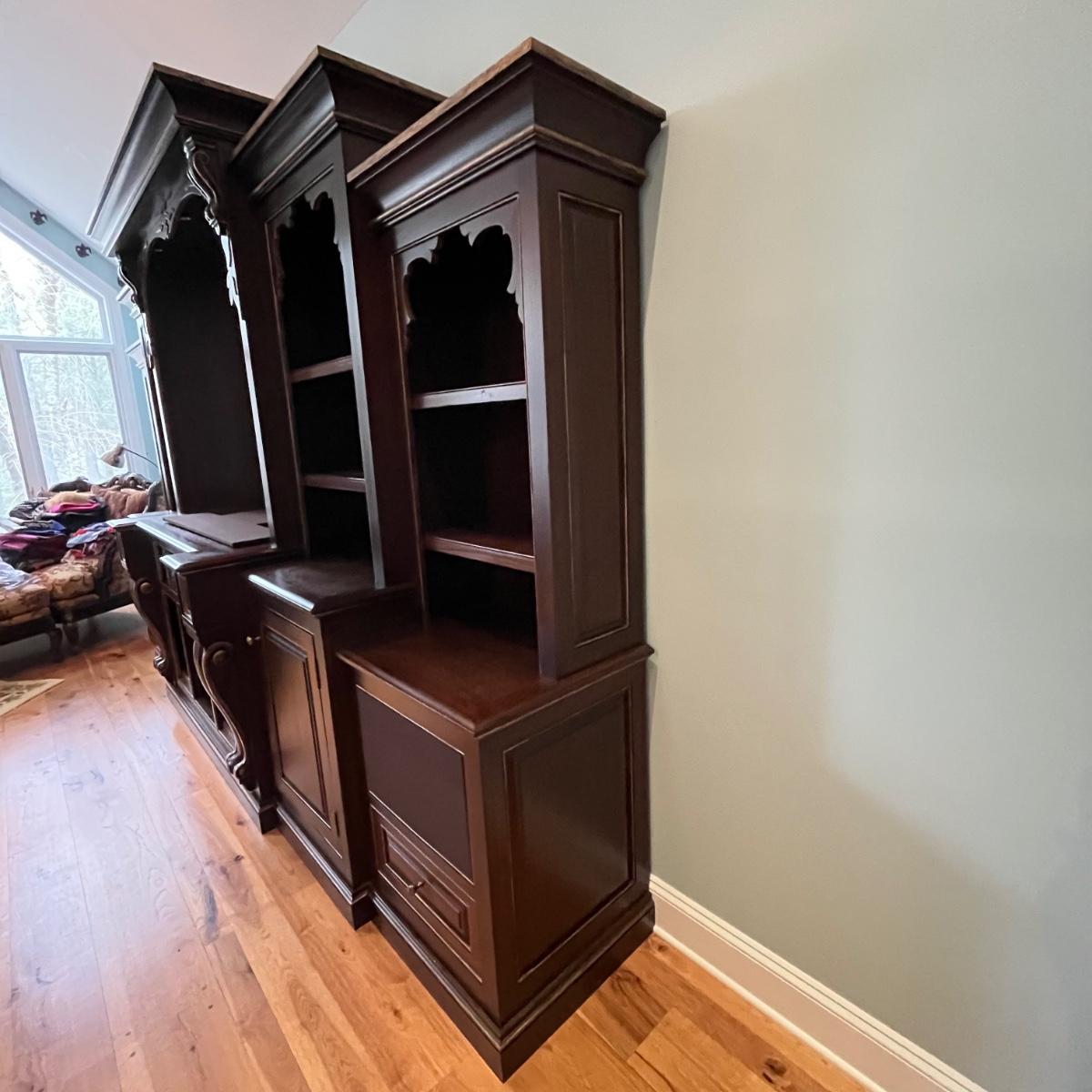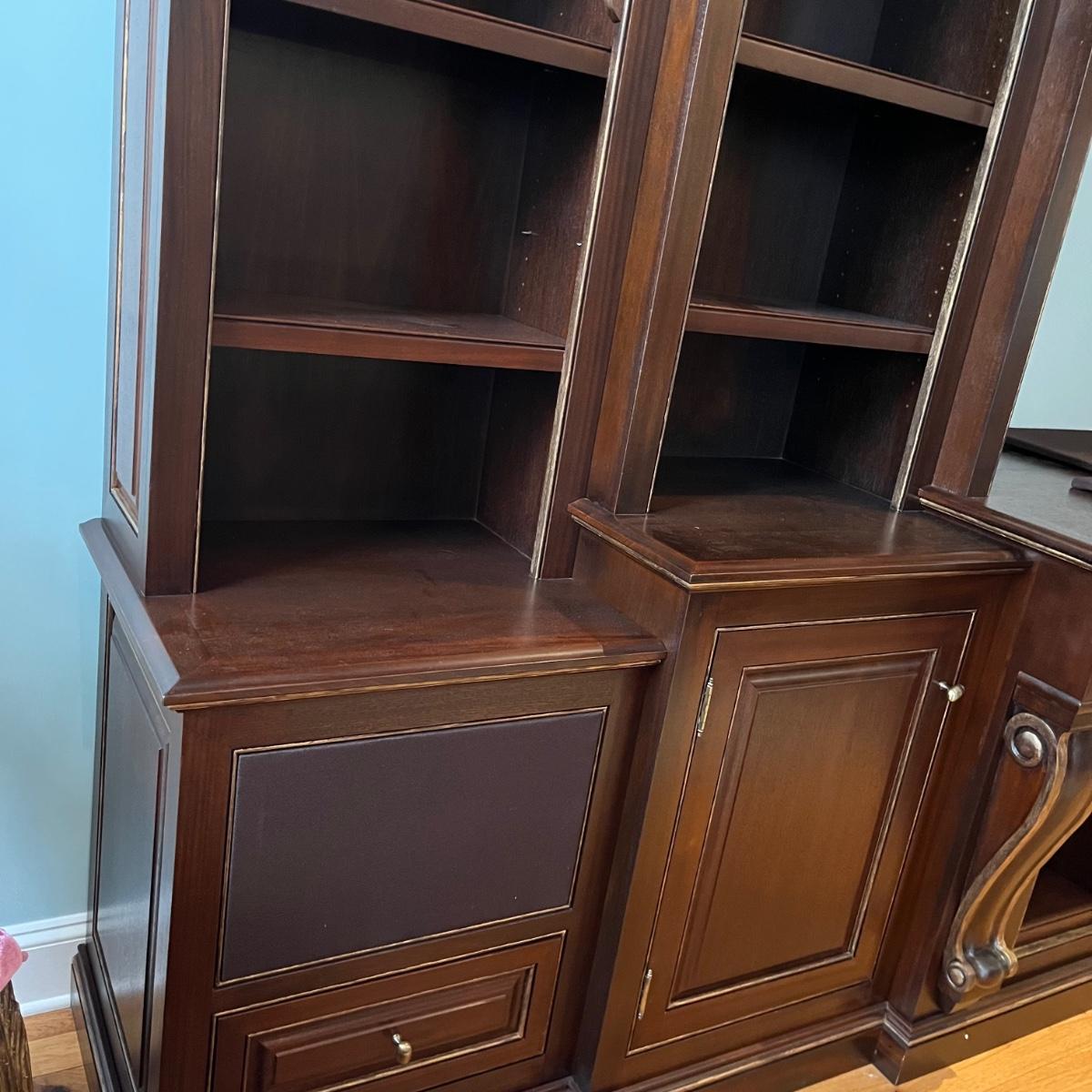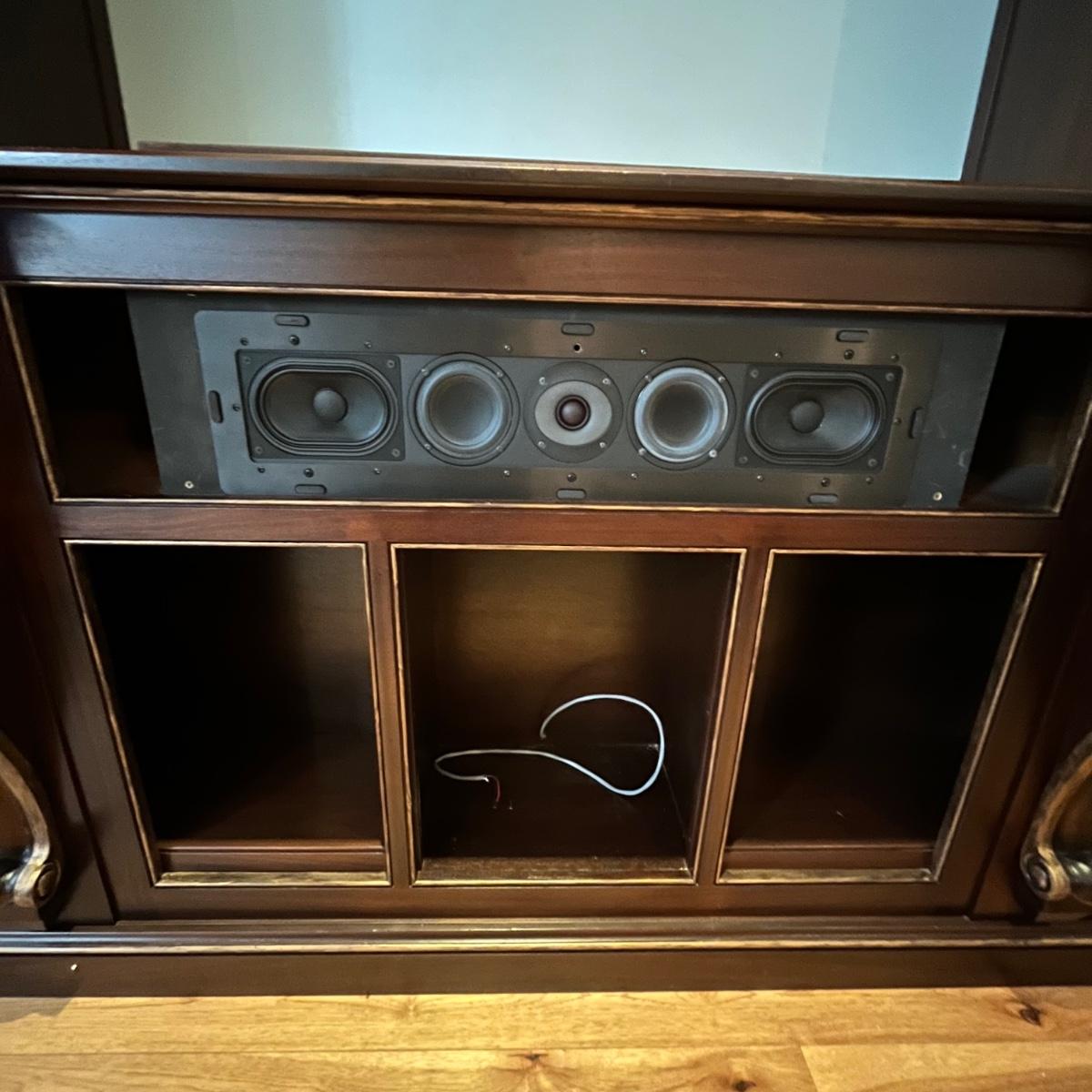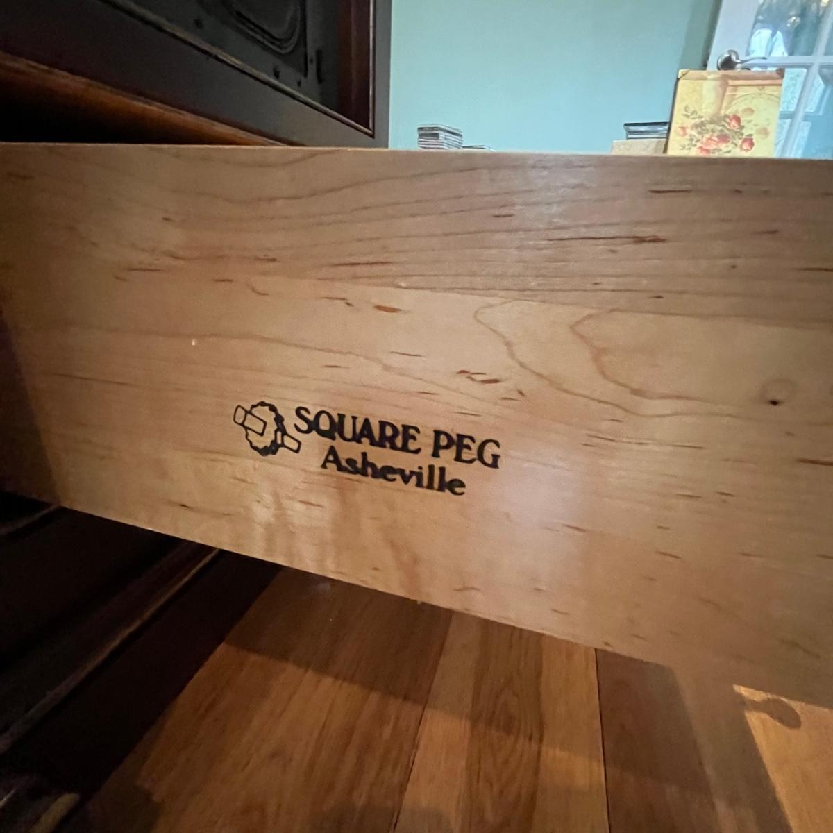 Lot includes a large solid wood entertainment center by Square Peg of Asheville. Unit has three built in speakers, a spot for a subwoofer and a slide out tray for home entertainment electronics. Unit measures 164” x 32” x 96”H. Winning bidder must bring assistance to help move and load this item due to its weight and/or size. This unit is very heavy and will need to be taken apart to move.