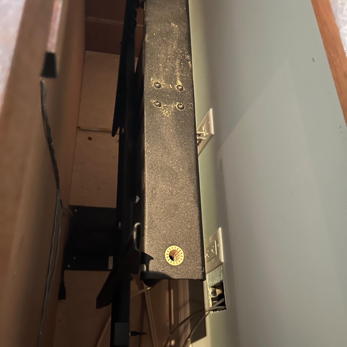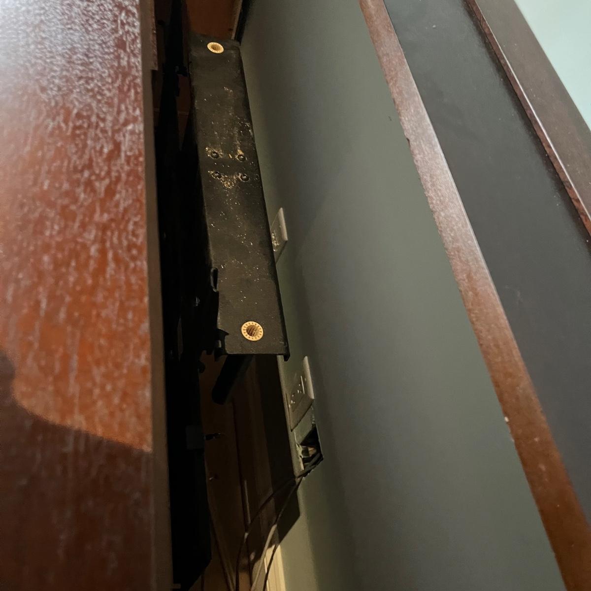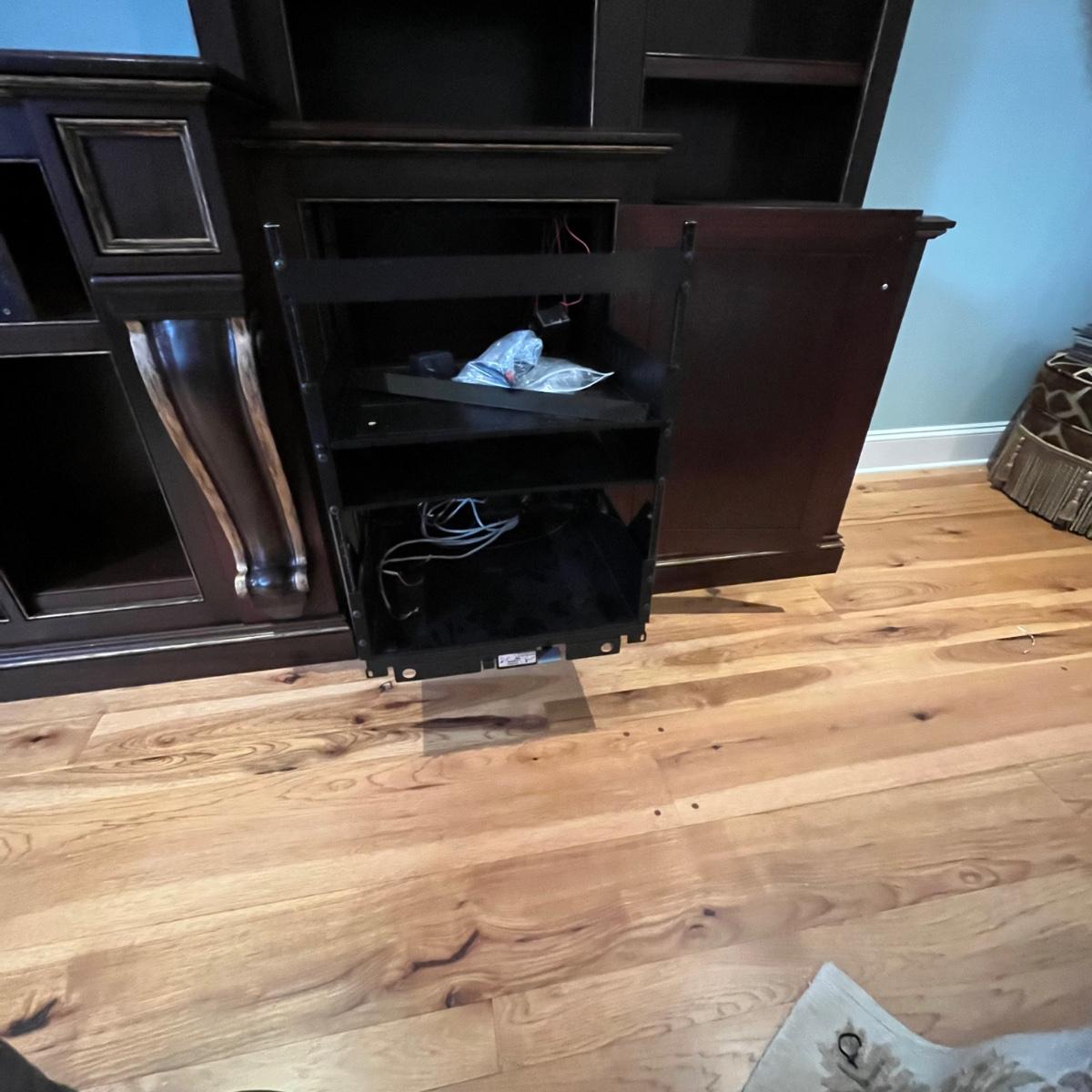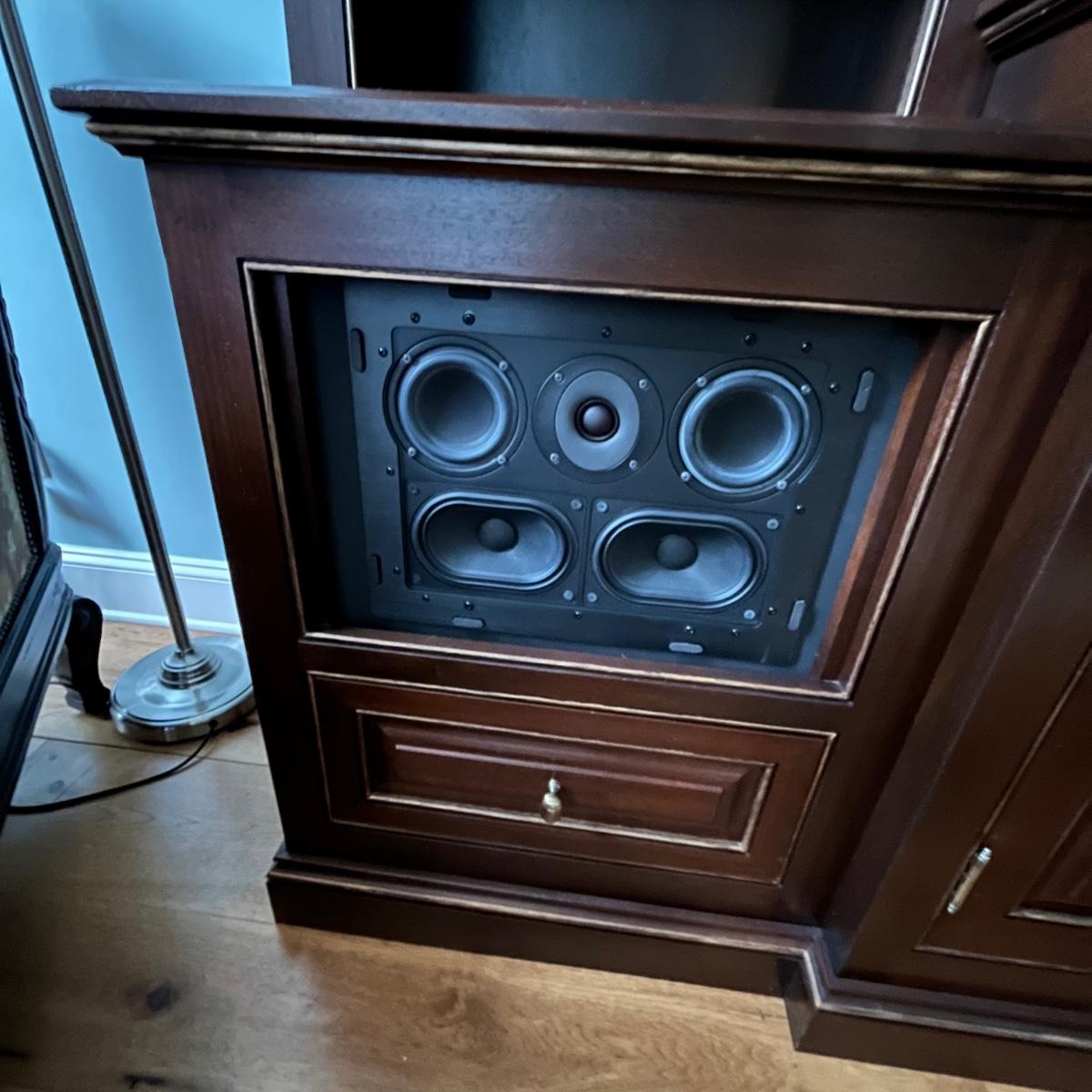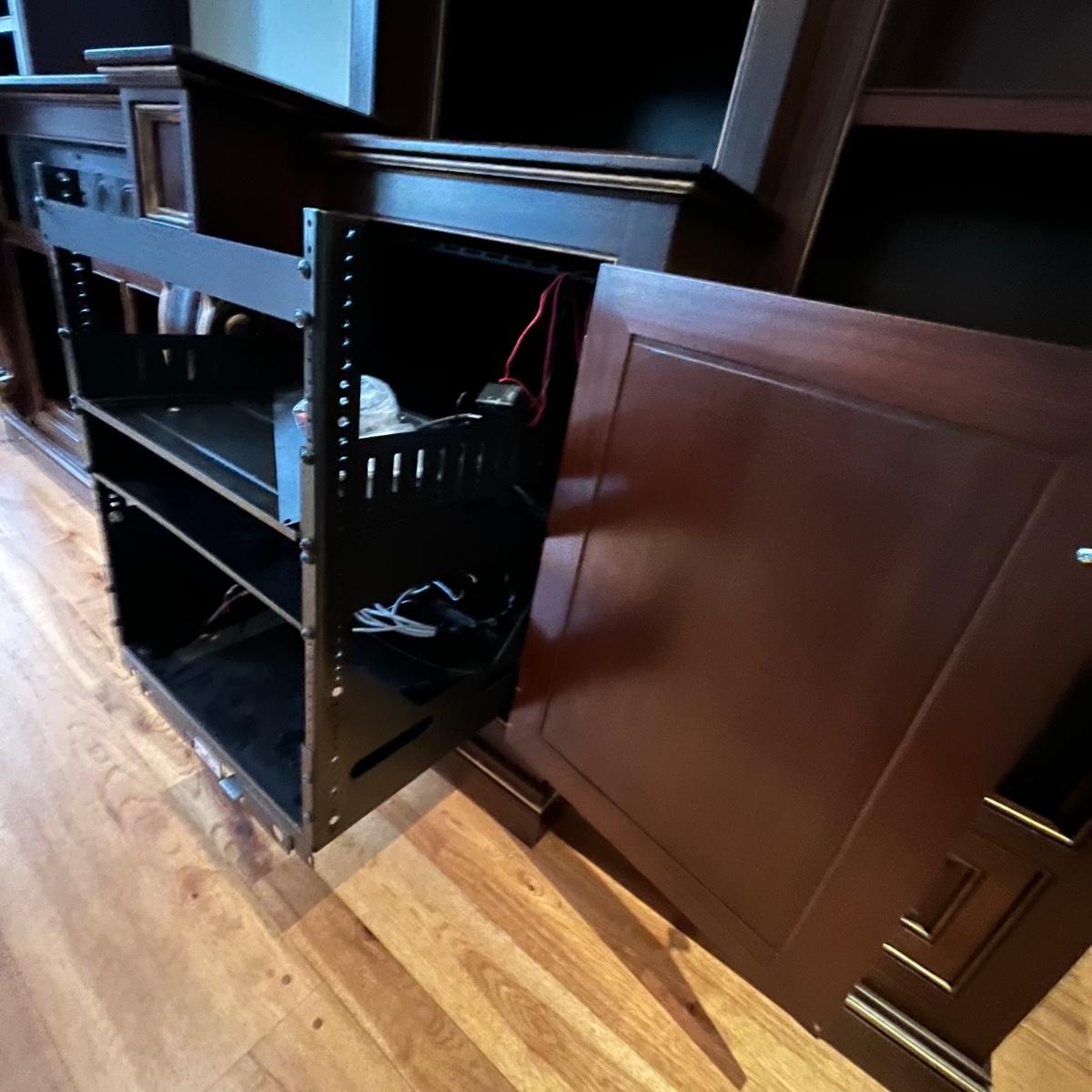Lot includes a large solid wood entertainment center by Square Peg of Asheville. Unit has three built in speakers, a spot for a subwoofer and a slide out tray for home entertainment electronics. Unit measures 164” x 32” x 96”H. Winning bidder must bring assistance to help move and load this item due to its weight and/or size. This unit is very heavy and will need to be taken apart to move.