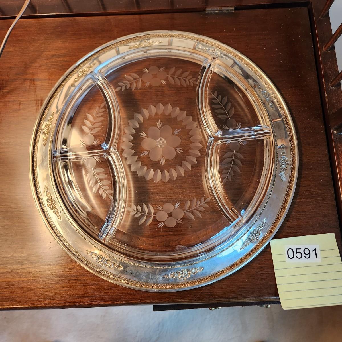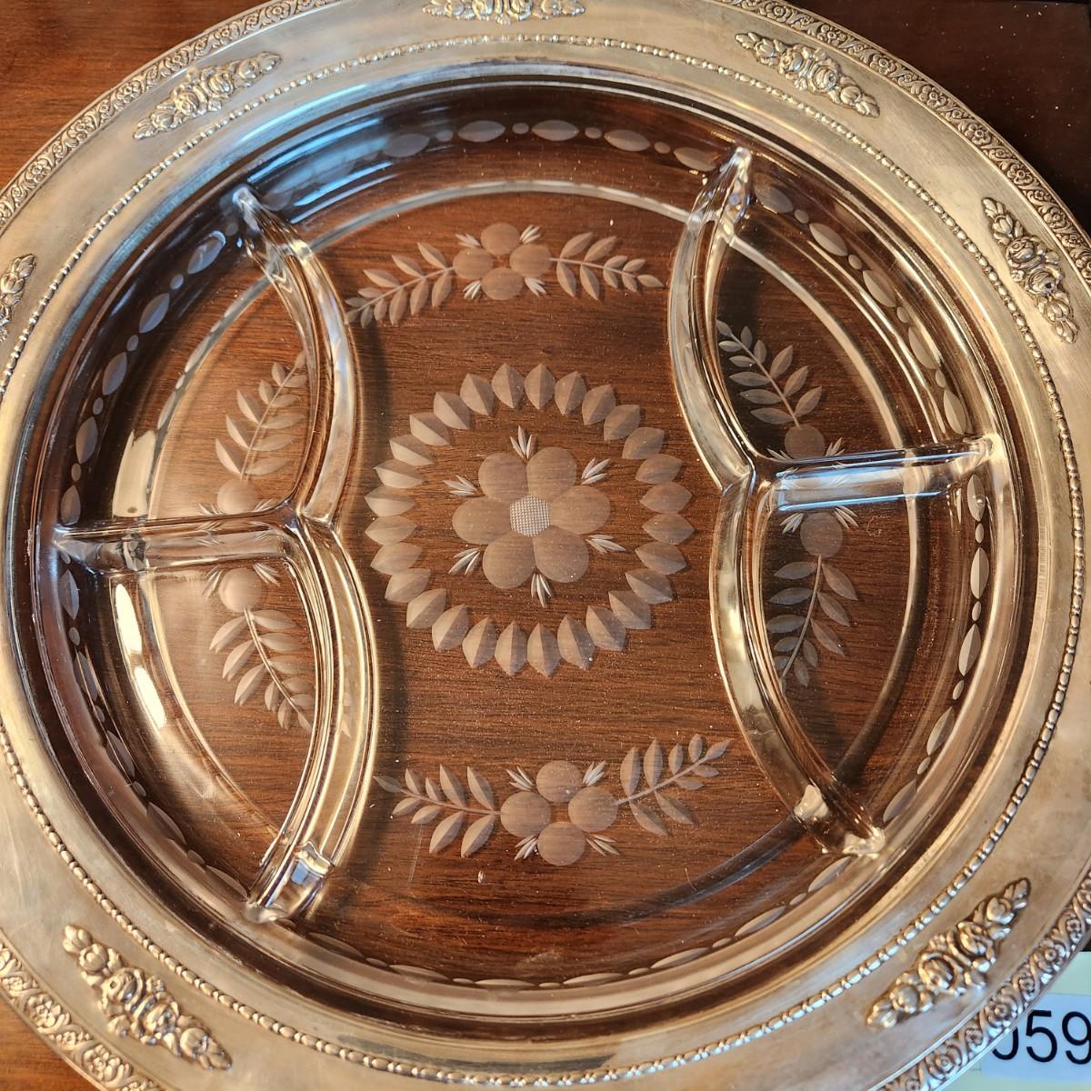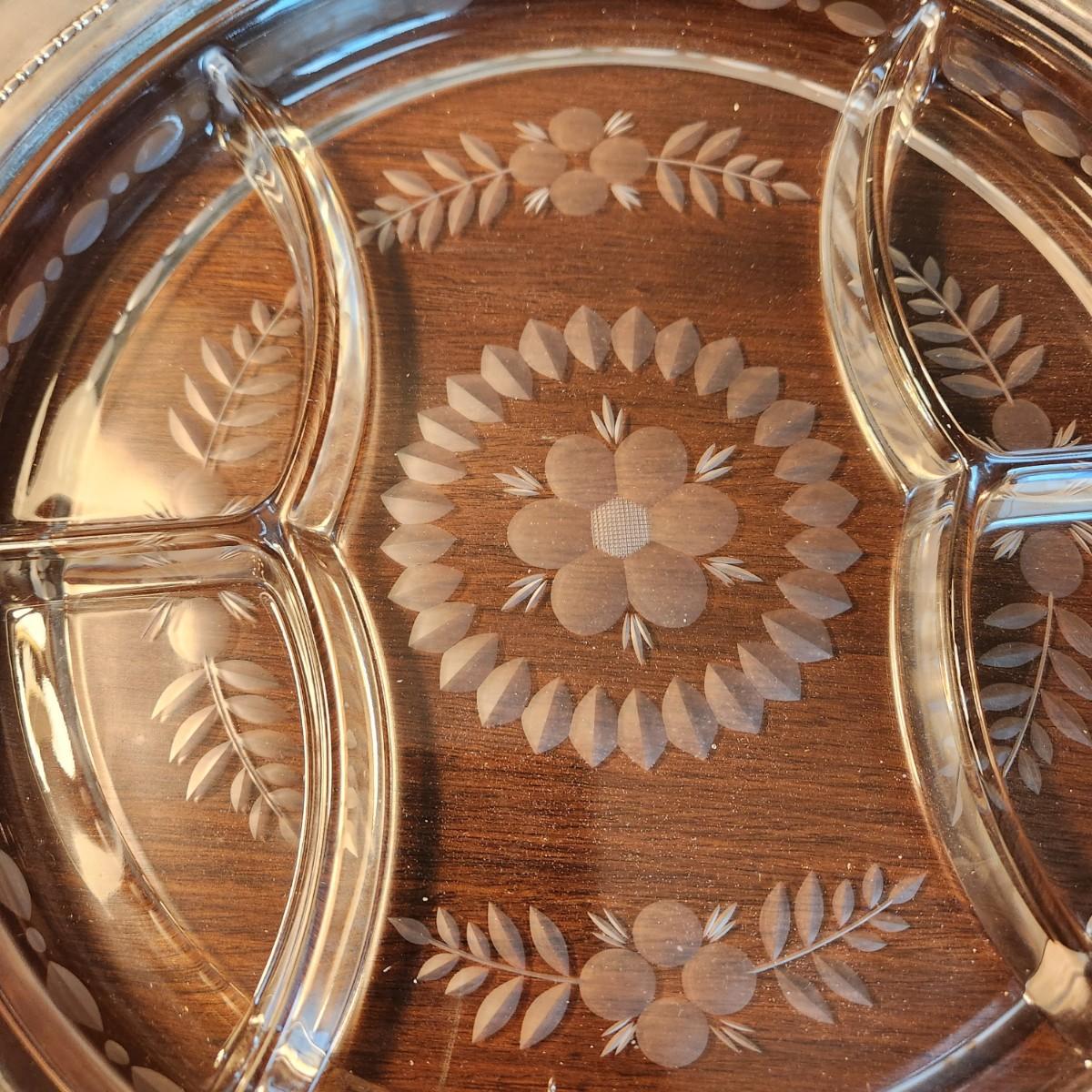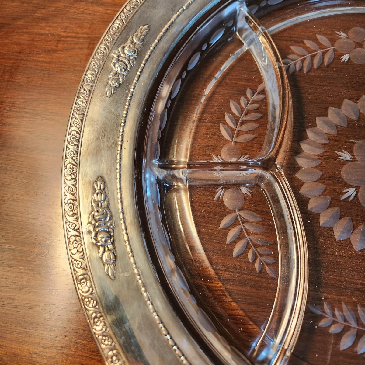 Large Etched 5 part Glass Relish Serving Tray with Sterling Sliver Trim