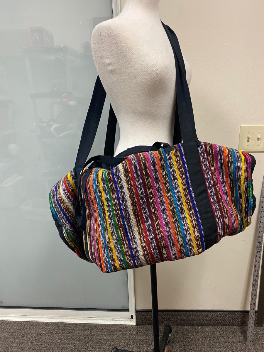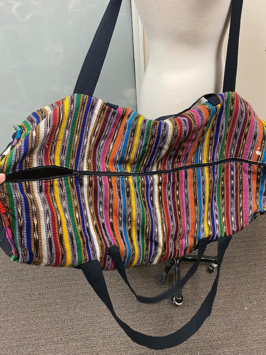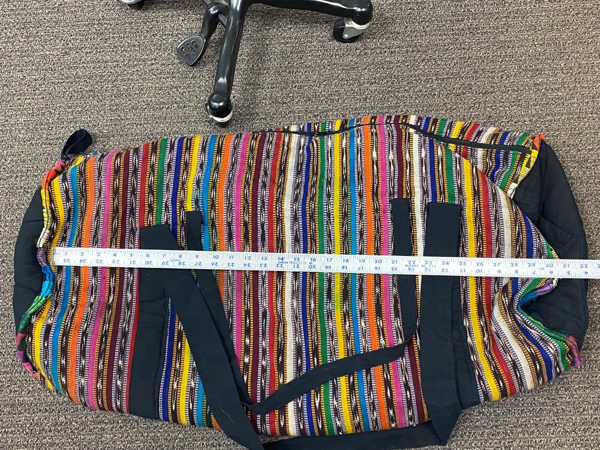 Extra large duffel bag in a Southwestern striped fabric. Two sets of handles. Zipper close, works well. About 30" length end to end. Good used condition, no holes or spots found.