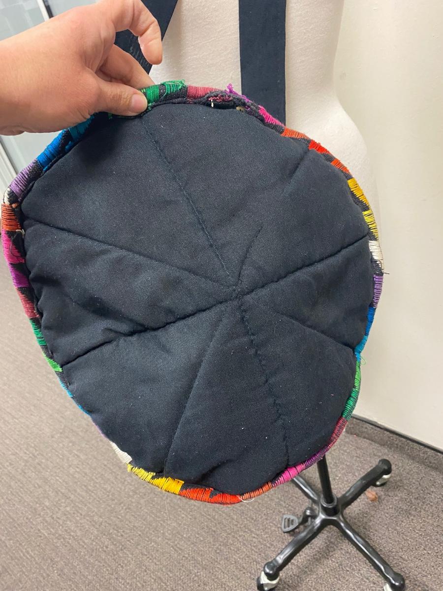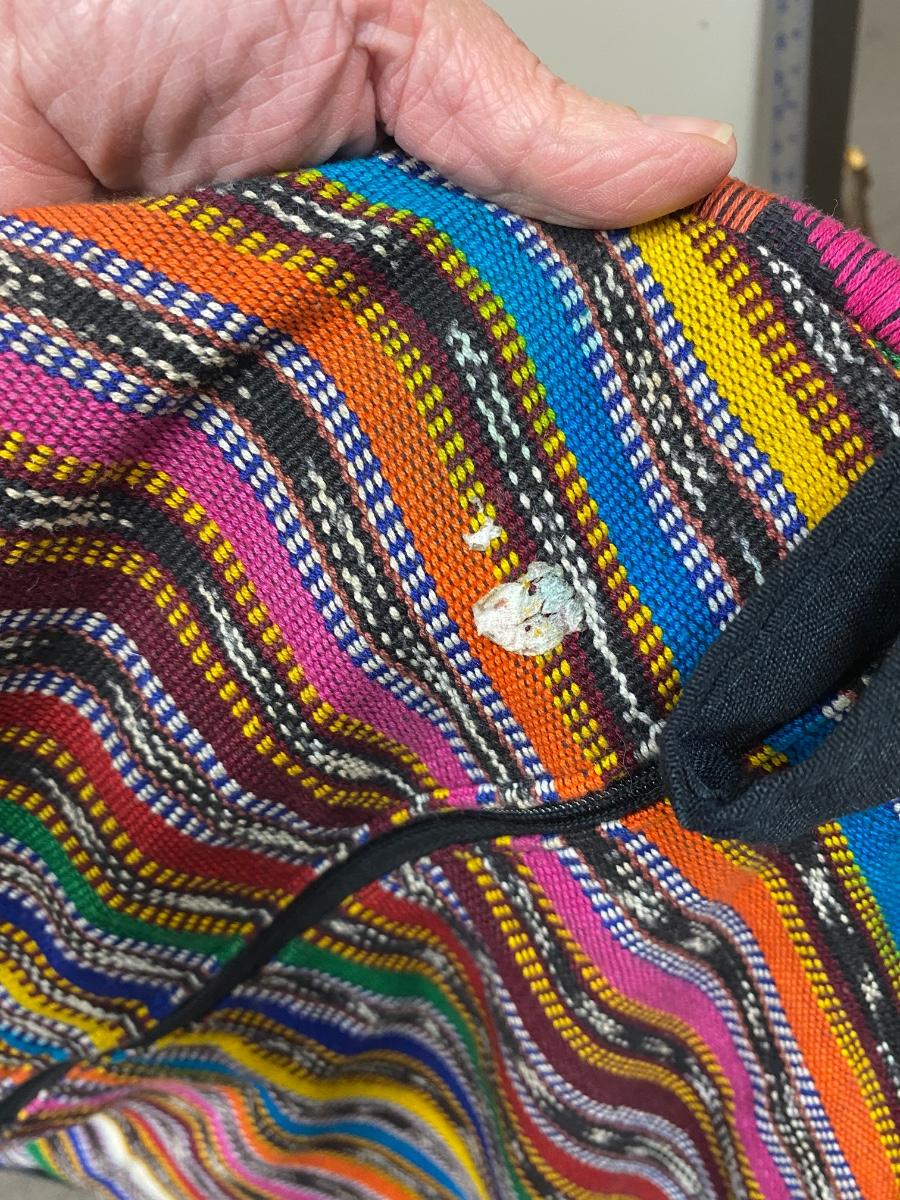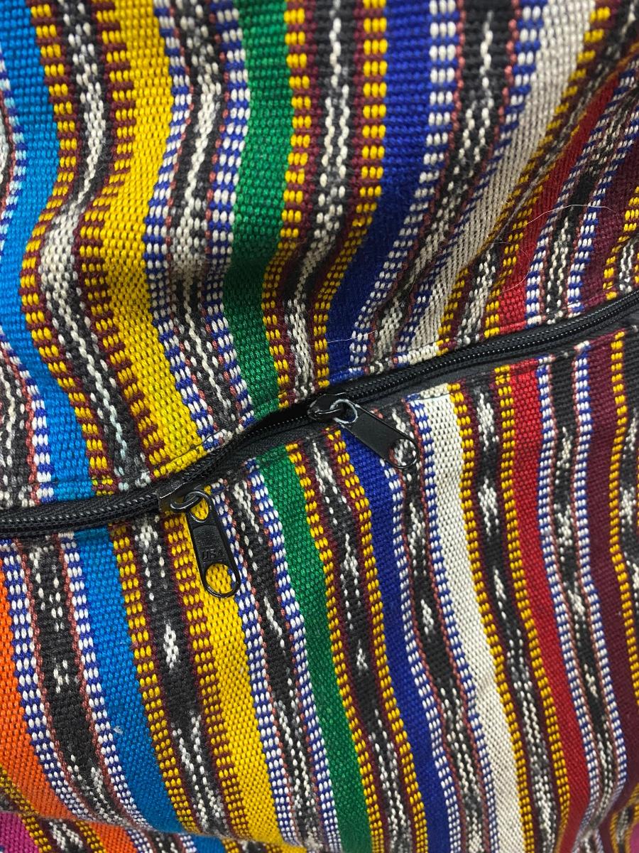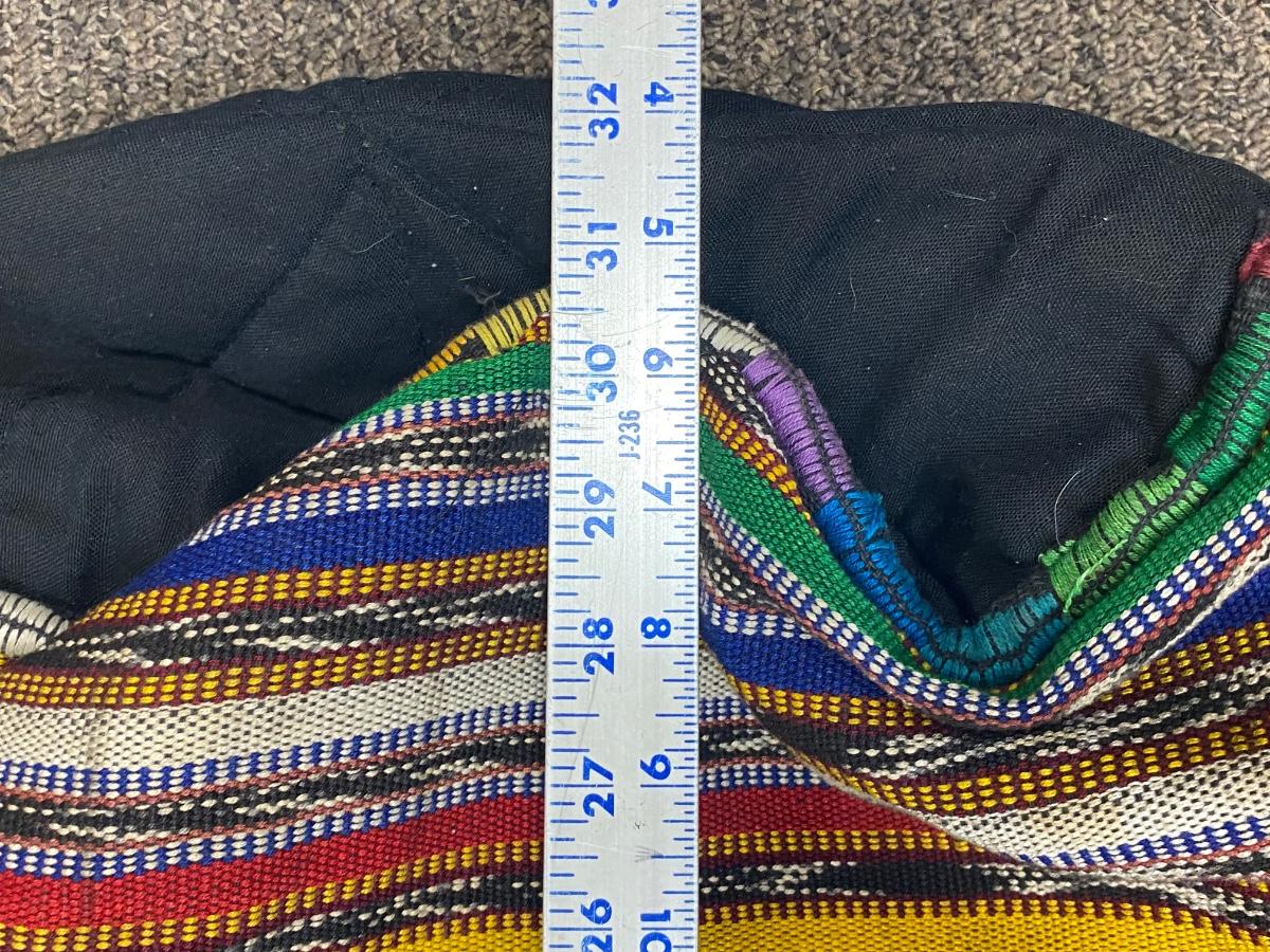 Extra large duffel bag in a Southwestern striped fabric. Two sets of handles. Zipper close, works well. About 30" length end to end. Good used condition, no holes or spots found.