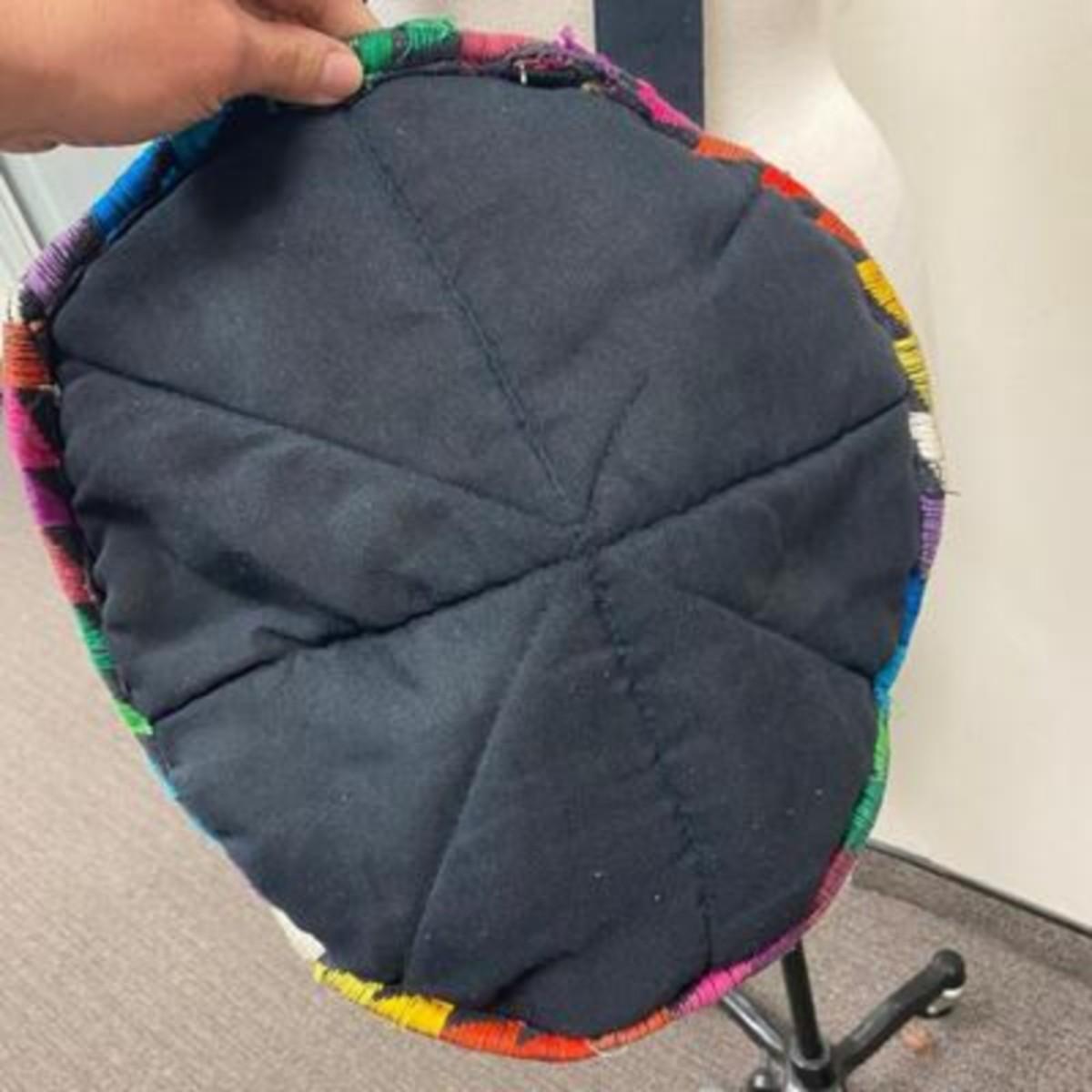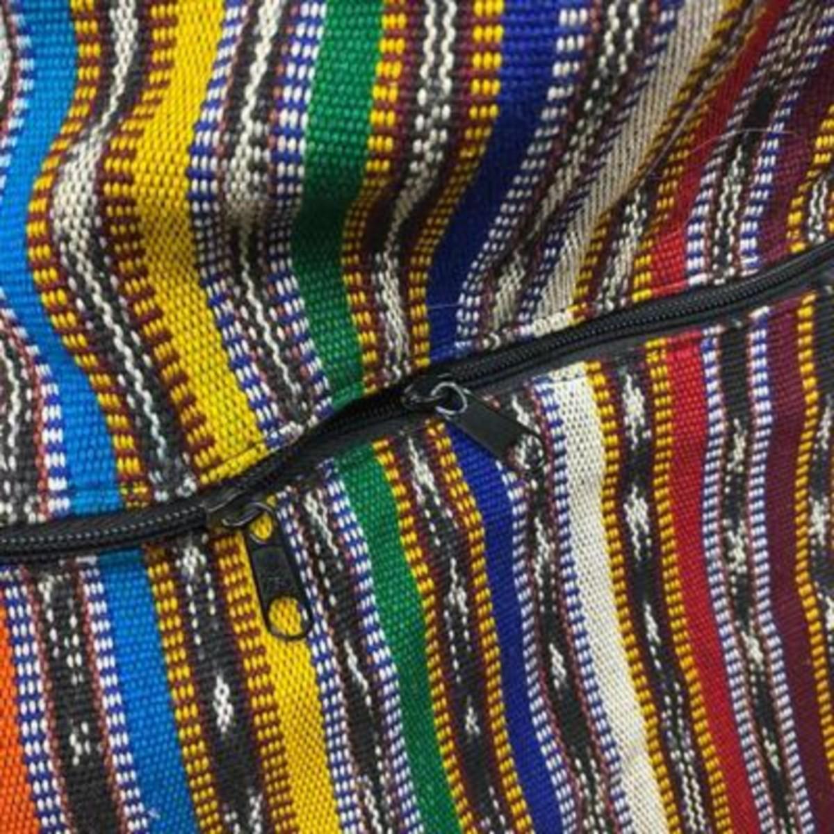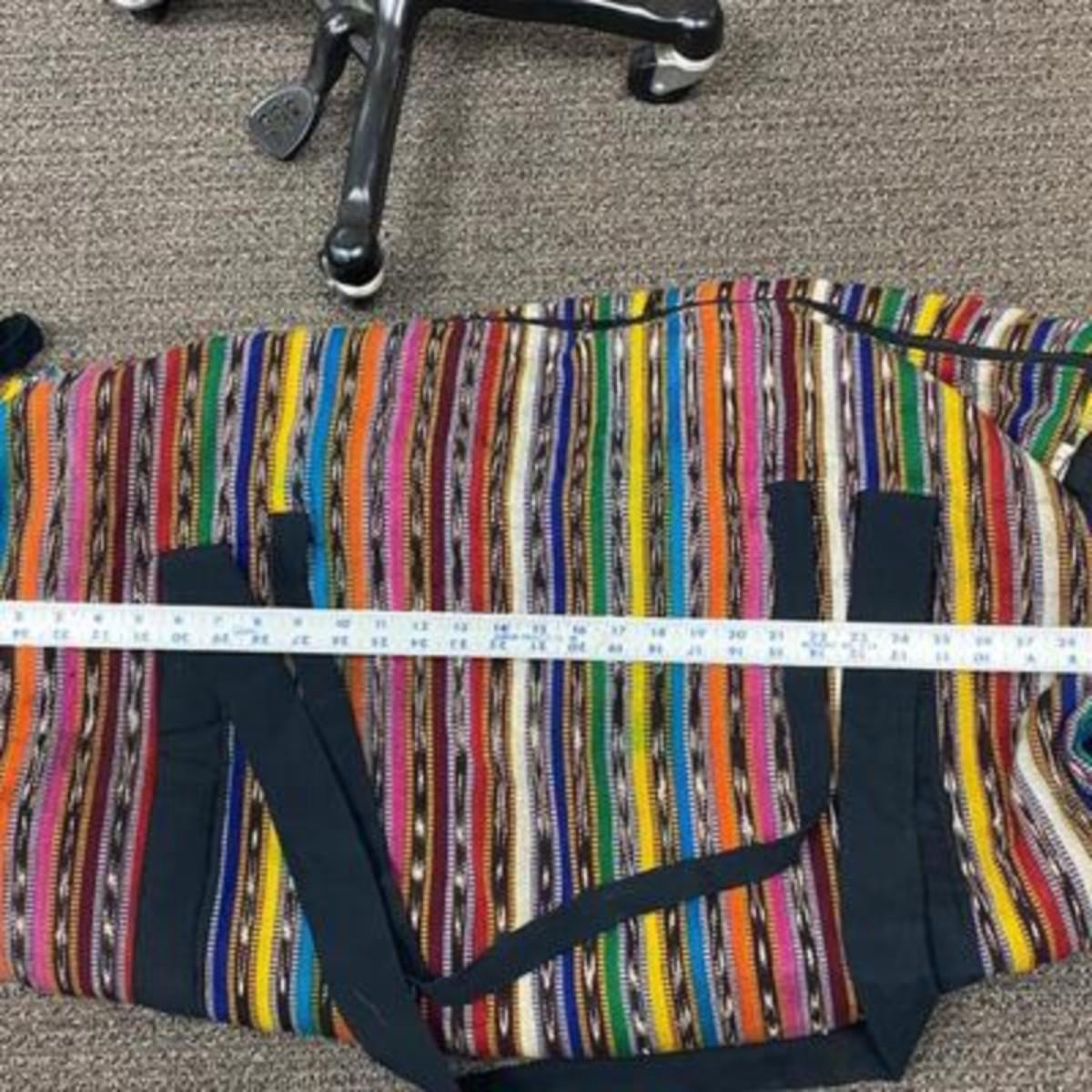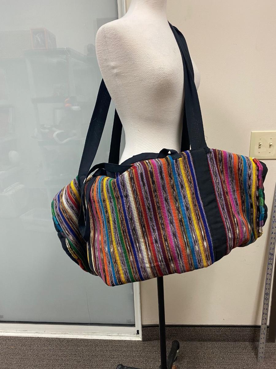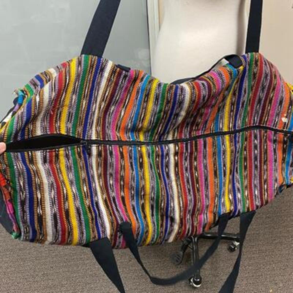 Extra large duffel bag in a Southwestern striped fabric. Two sets of handles. Zipper close, works well. About 30" length end to end. Good used condition, no holes or spots found