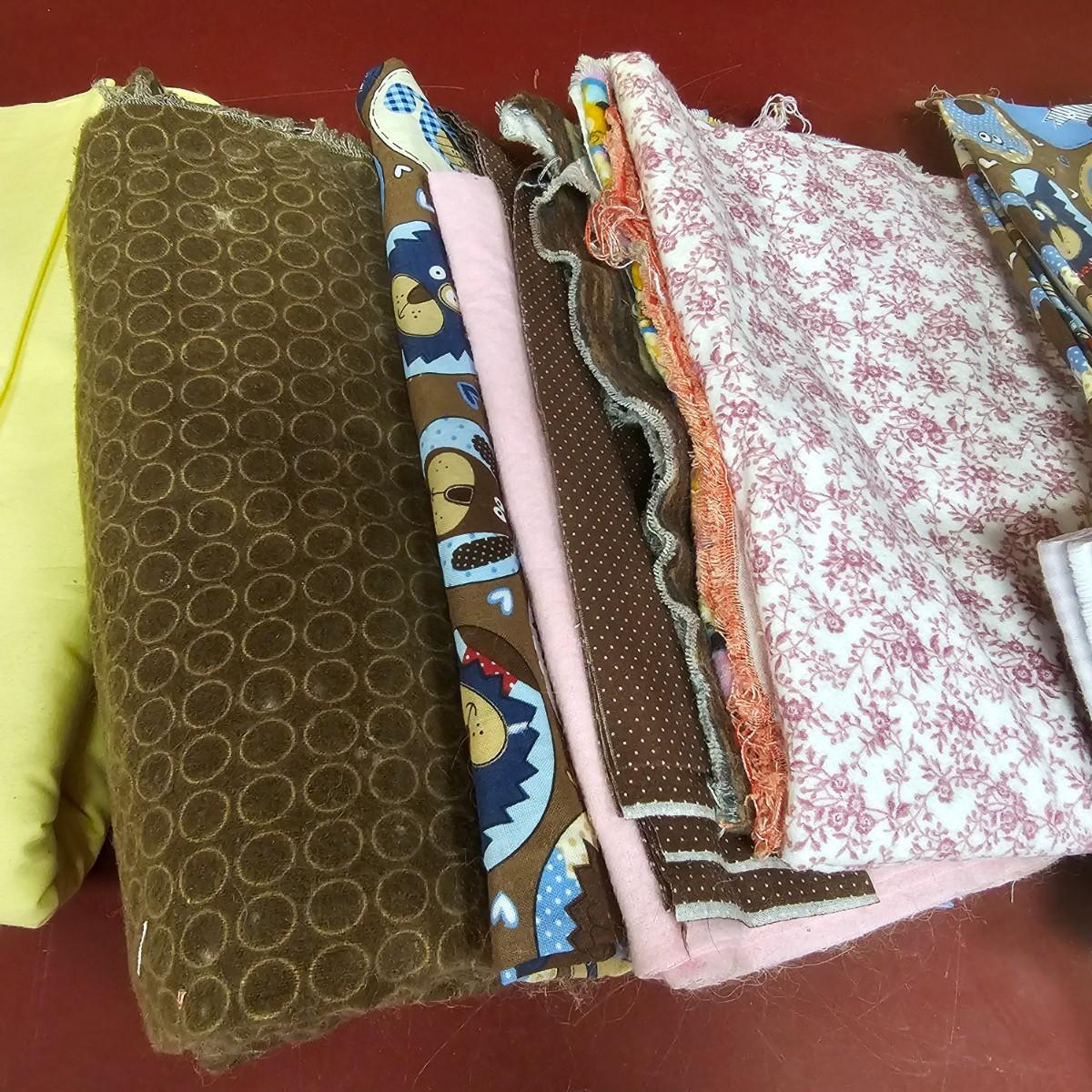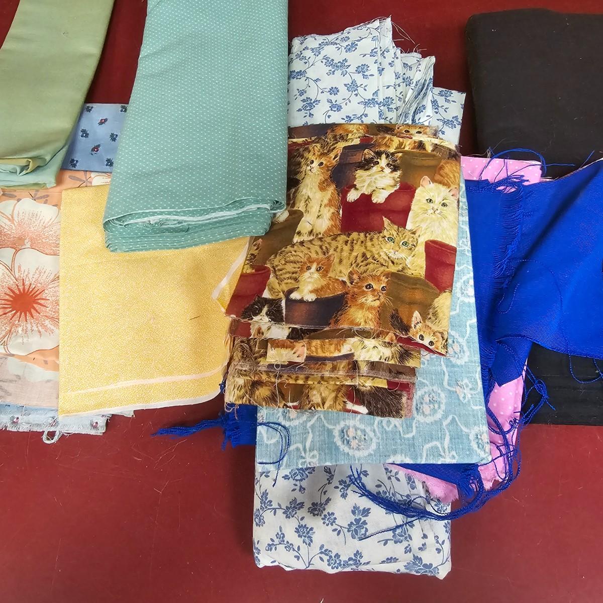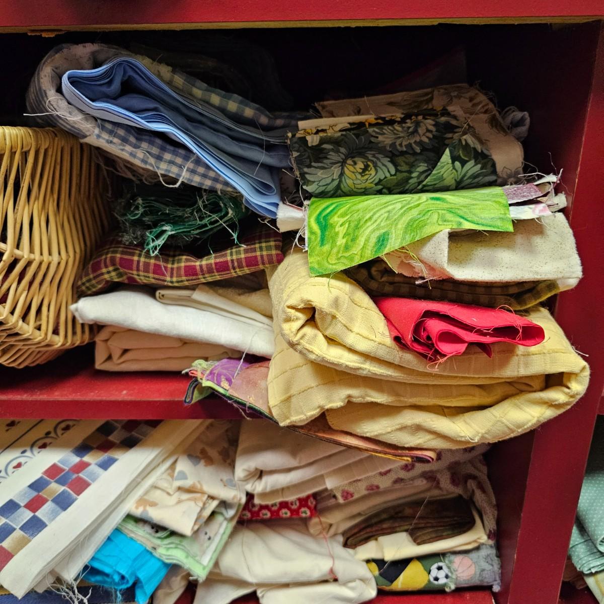 Multiple shelves and baskets filled with fabric. Top shelf of this group is double sided, more fabric on the back. Six lower shelves in front are just one side. Cotton, rayon, polyester, felt, something for everyone. Small pre cuts to larger flat pieces, also some projects already in work. Please check out our other large Fabric lots in this auction. All baskets shown are included in lot. Winning bidder will be responsible for bringing their own boxes, bags or tubs to load their winnings and remove them. See photos for details. Local pickup only.