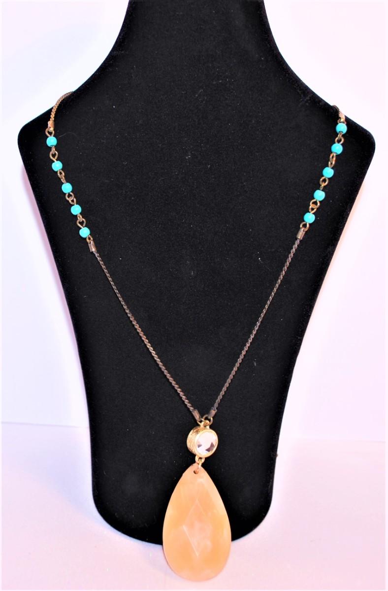 Large Faceted Pink Teardrop Stone with Mirror Circle & Small Bead Accents 32" L
