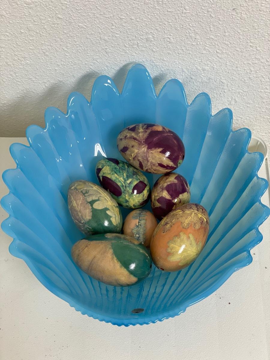 Large Fenton blue bowl and Edith eggs