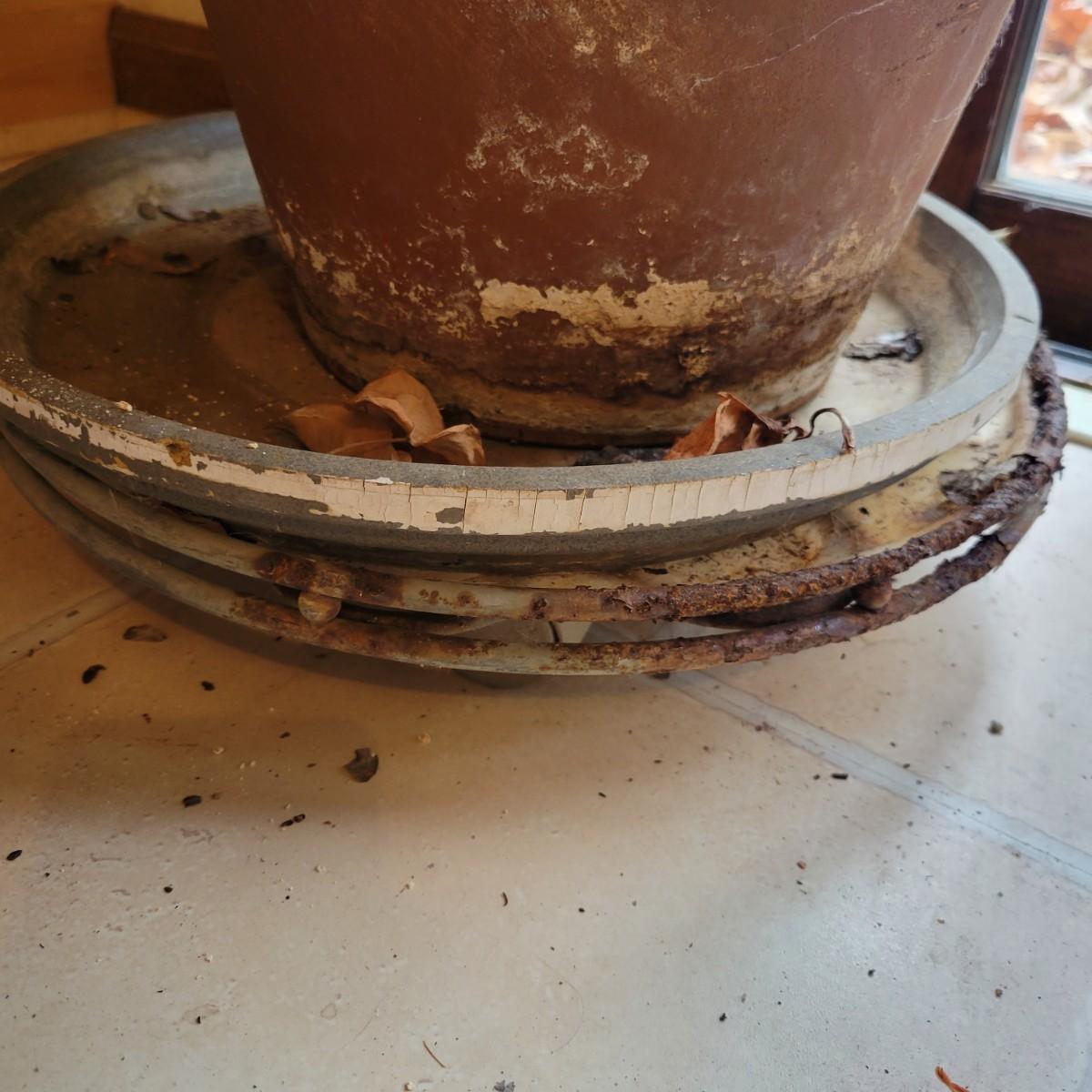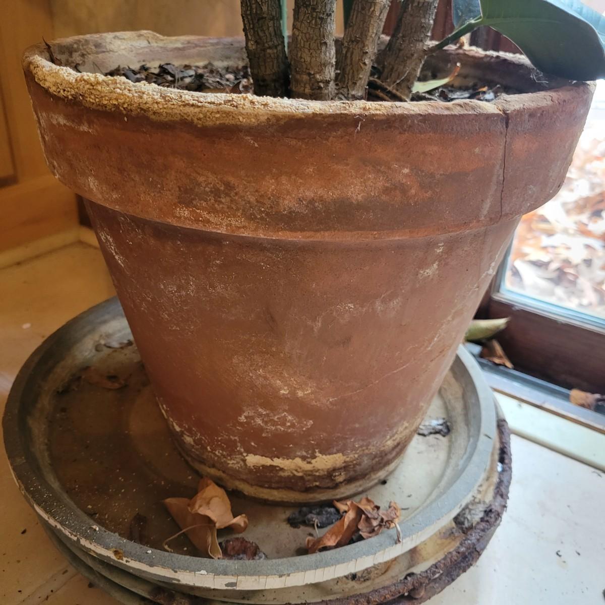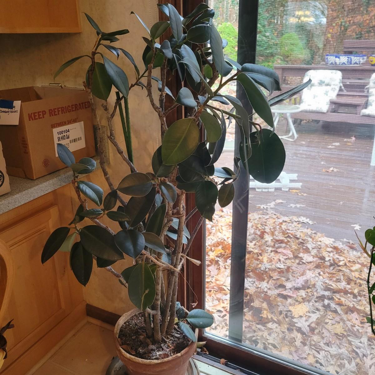 A large ficus elastica, also known as a rubber plant. It has six main stalks and is in a weathered terracotta pot with a base. It measures approximately 5' tall from the floor to its highest foliage. Local pickup only