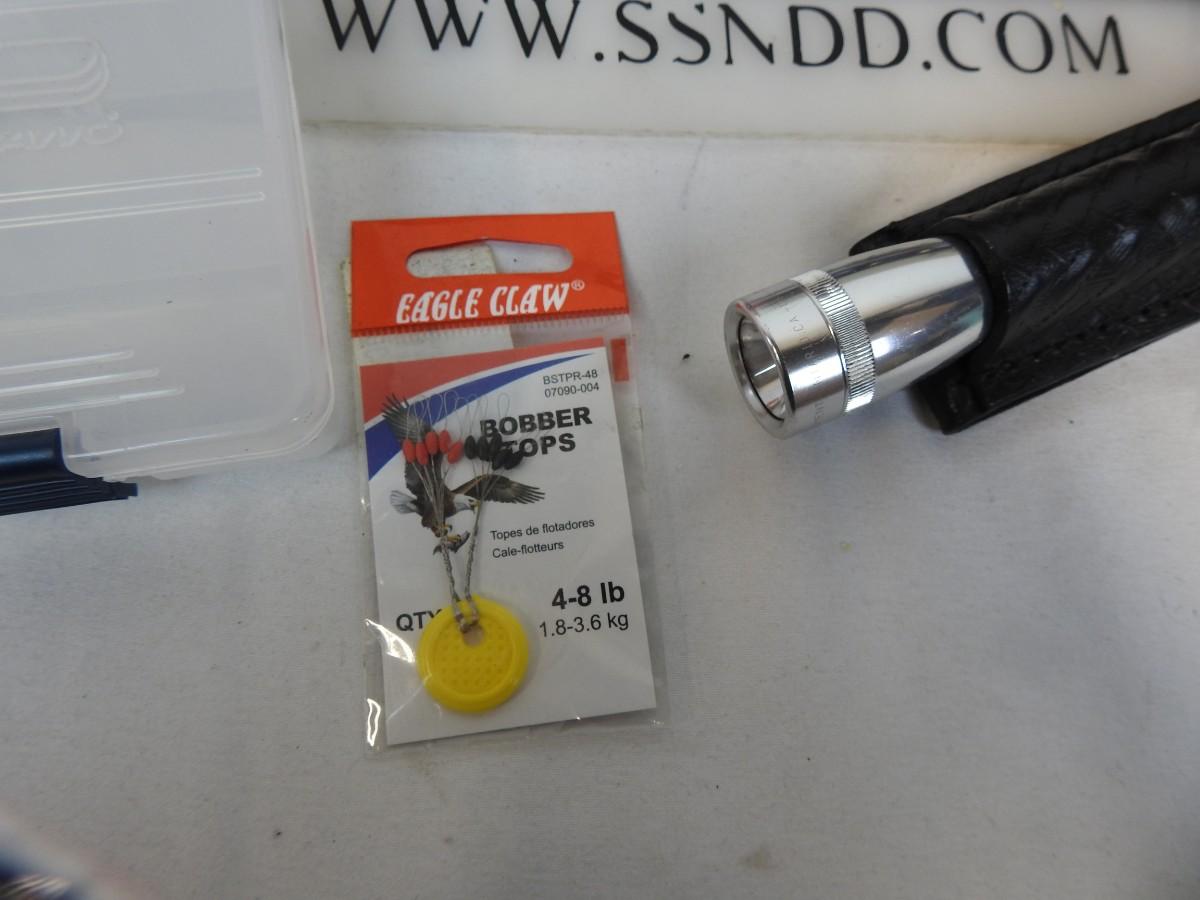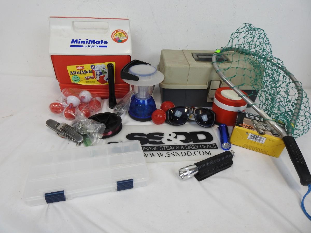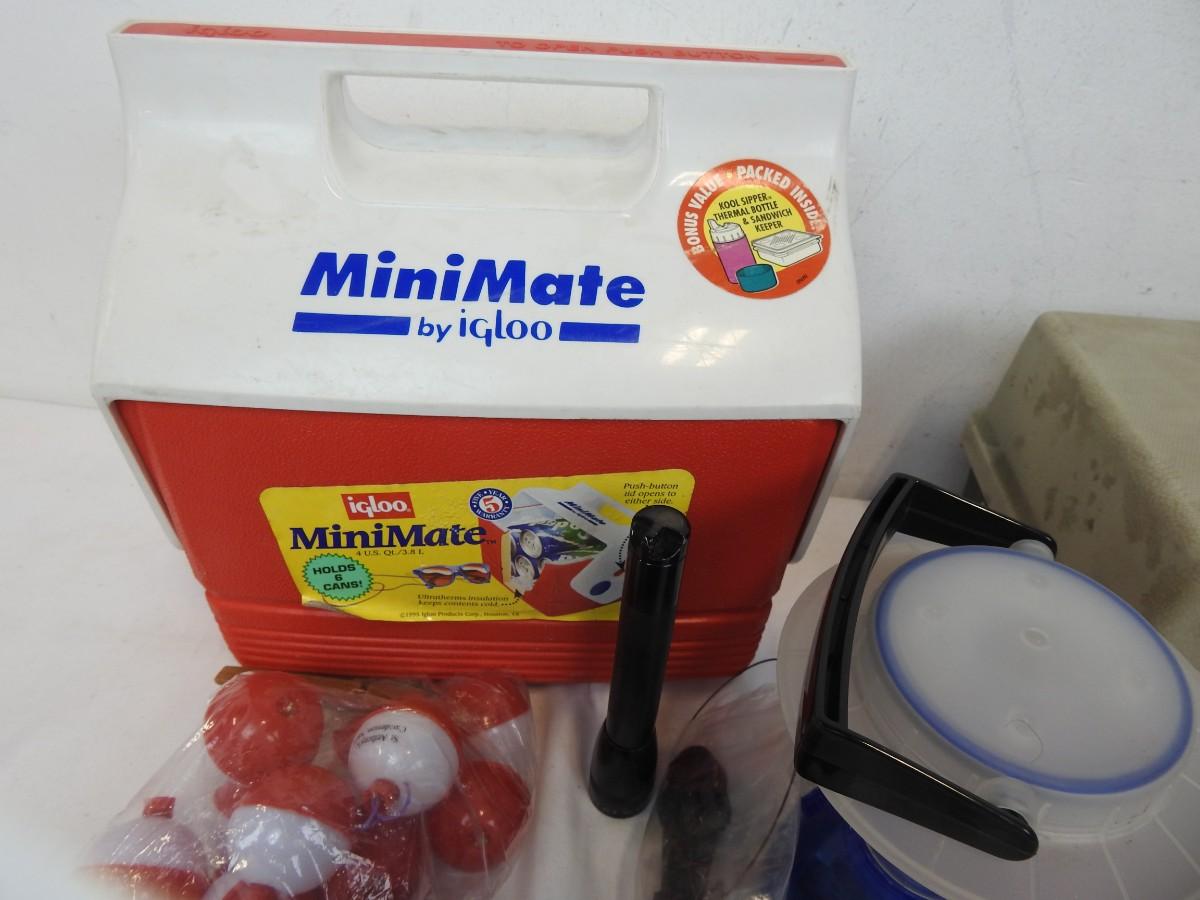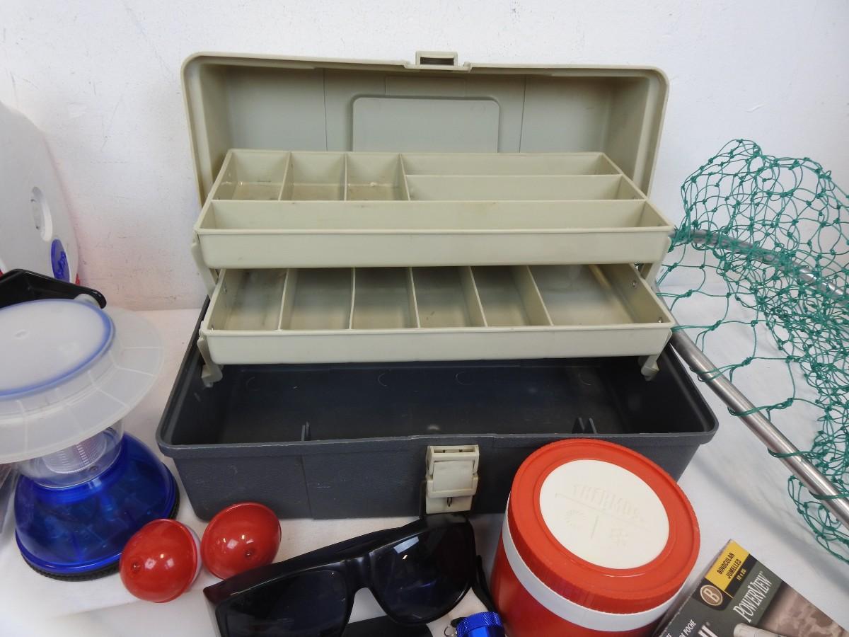 Large fishing lot: Tackle box, bobbers, Igloo cooler, Thermos, light, flashlight