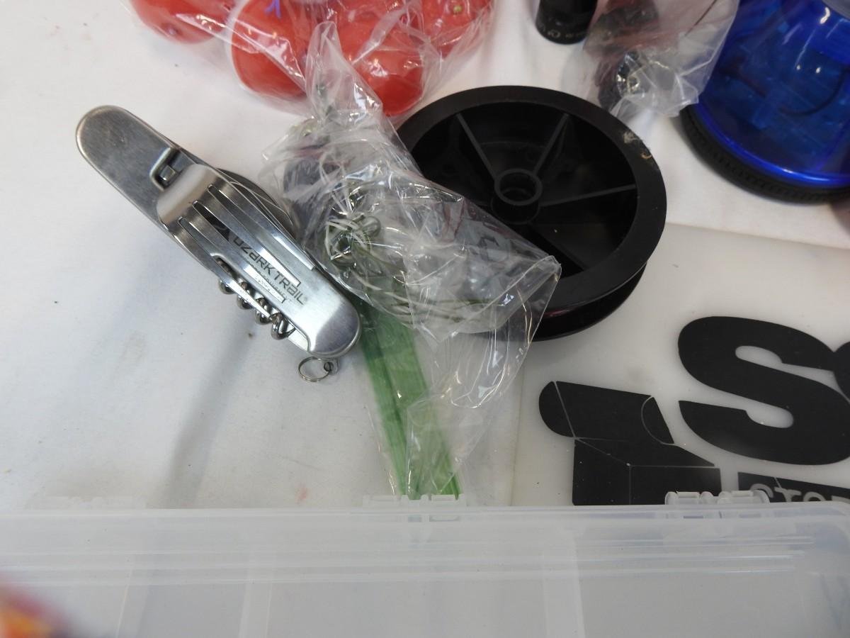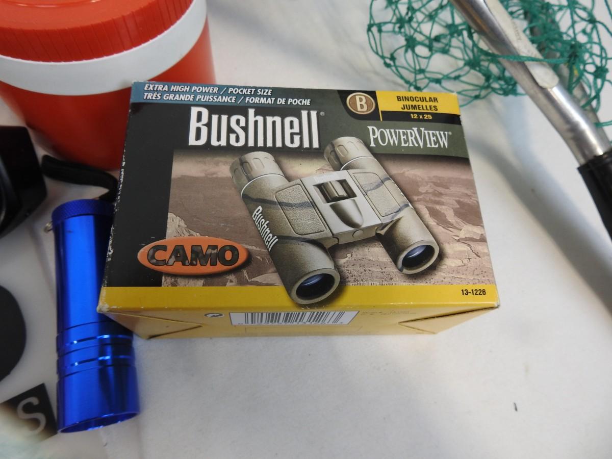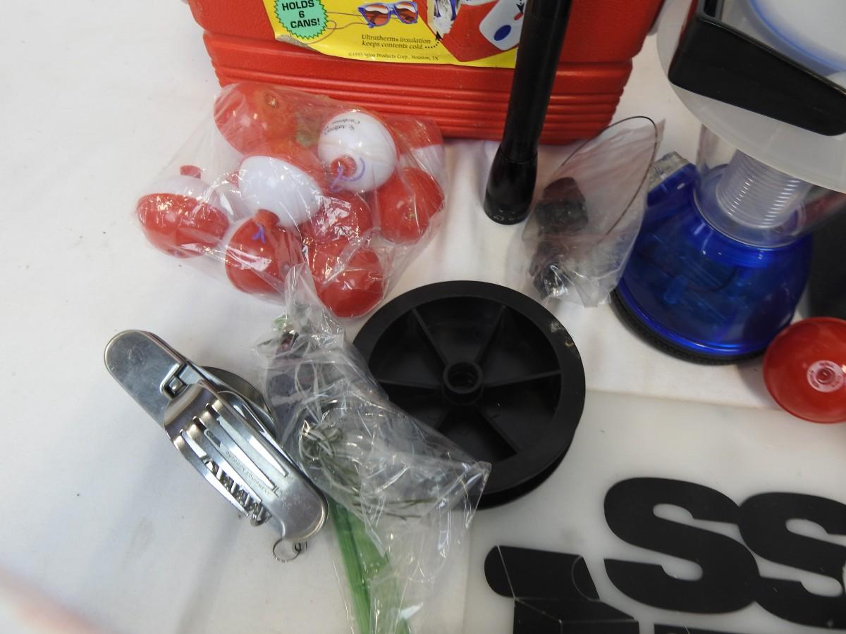 Large fishing lot: Tackle box, bobbers, Igloo cooler, Thermos, light, flashlights