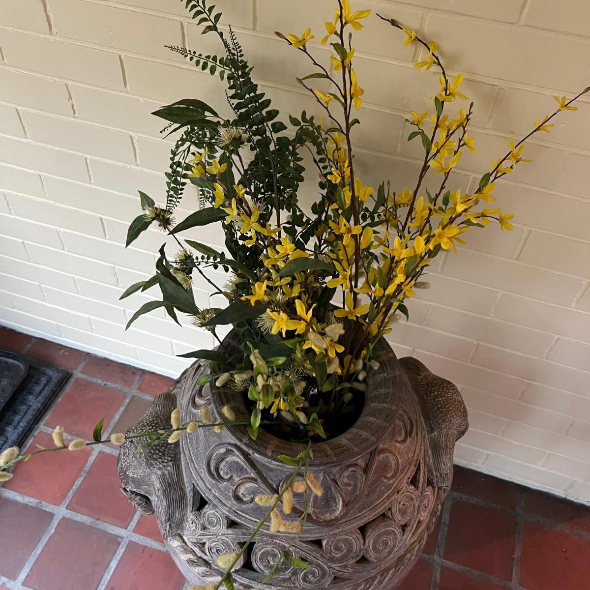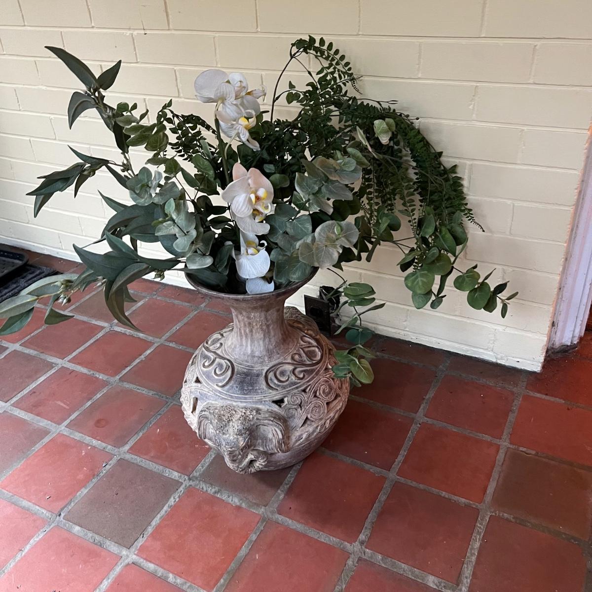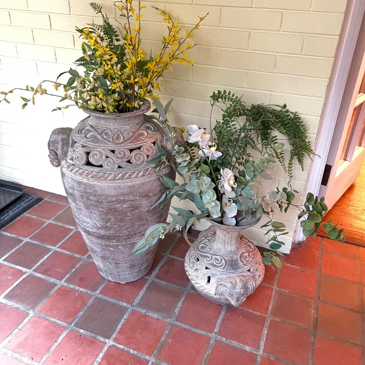 Two ceramic pots have matching terracotta finish and elephant head motifs, tusks and all. The larger vase is quite heavy, note the small chip at the base; it measures 18” x 30”H. No makers marks found. Both have faux floral arrangements.