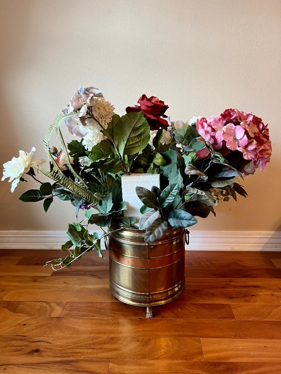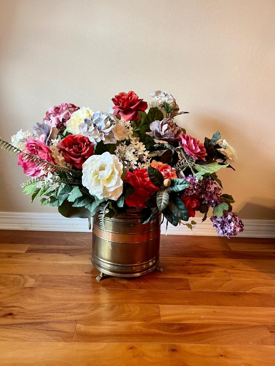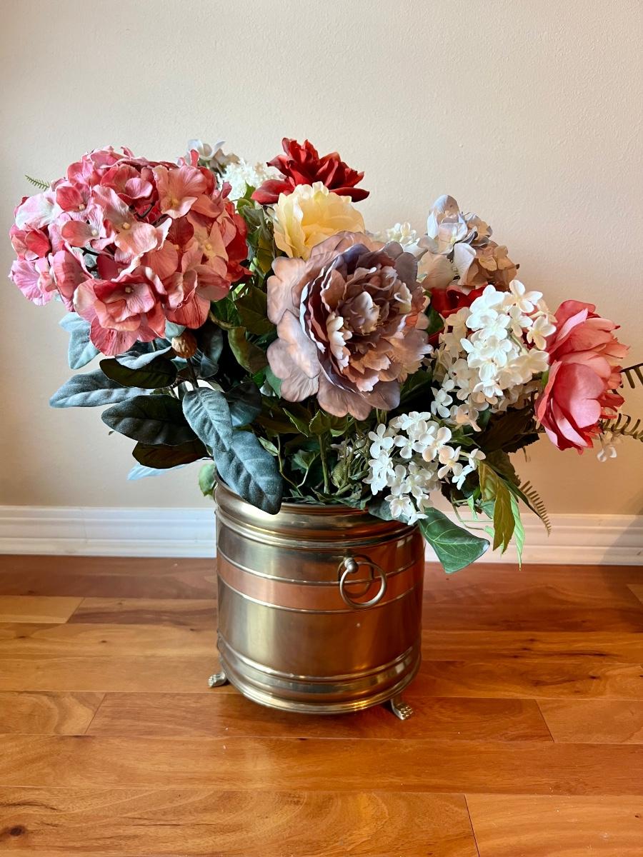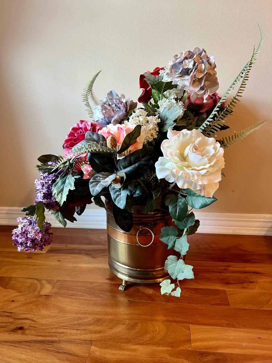 Beautiful, Large Floral Arrangement with copper branded footed planter. Approximately 27 inches tall.