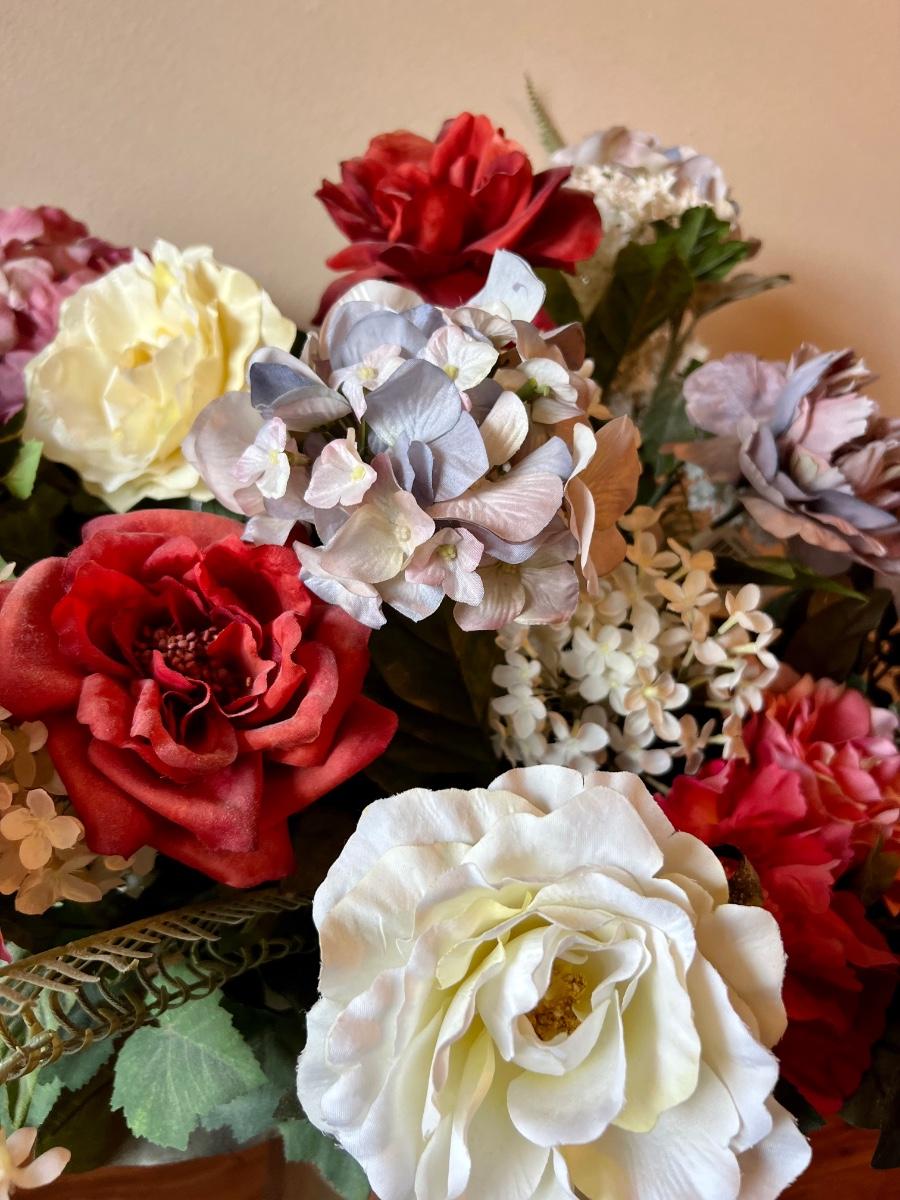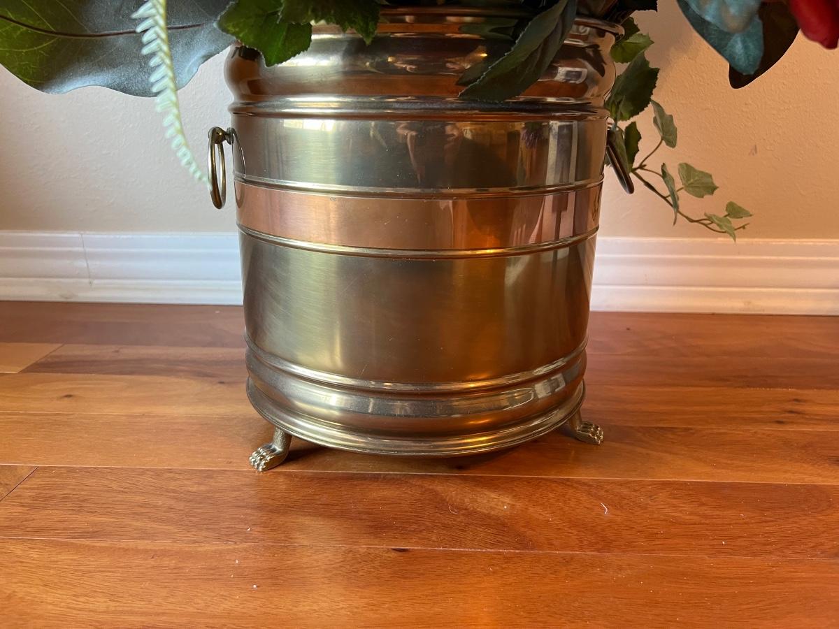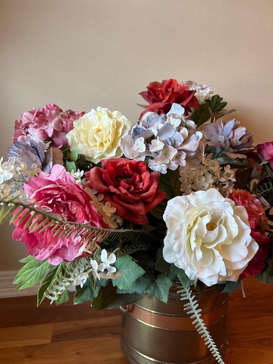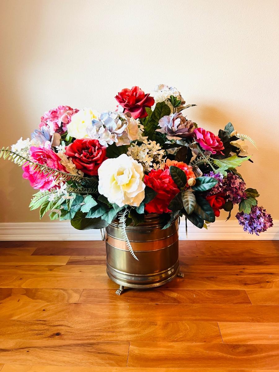 Beautiful, Large Floral Arrangement with copper branded footed planter. Approximately 27 inches tall.