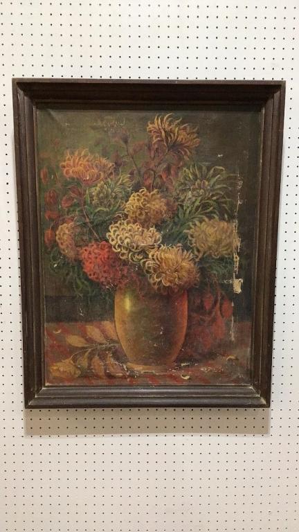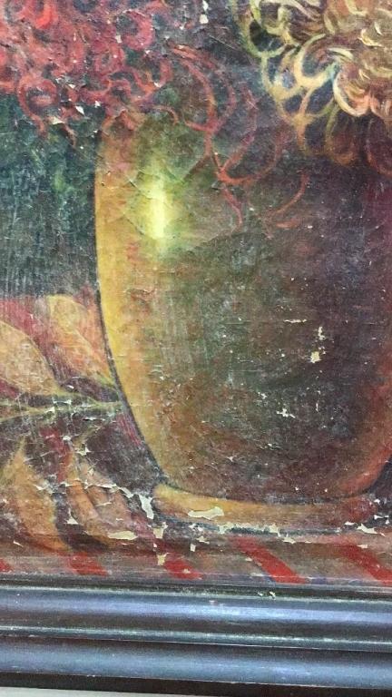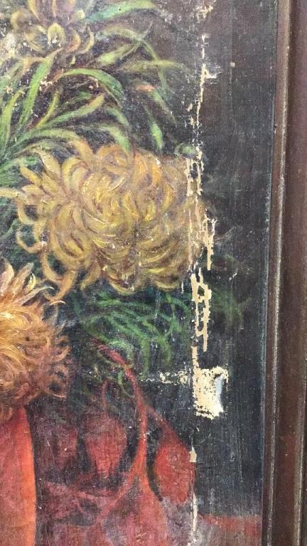 Oil on canvas, 34 x 27 inch, Chrysanthemums in Vase, paint loss and damage to canvas, wooden frame
