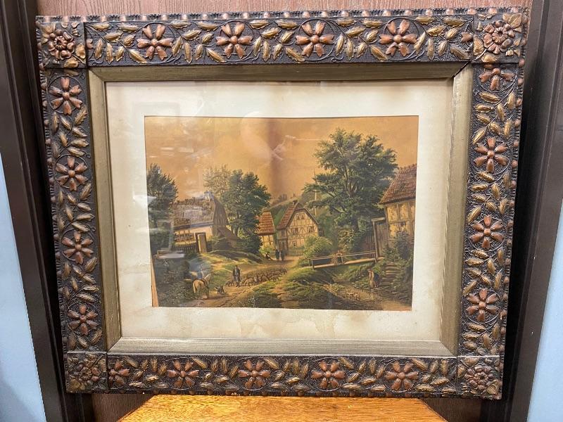 Large Flower Carved Wood Picture Frame with A Cottage Town Scene Print