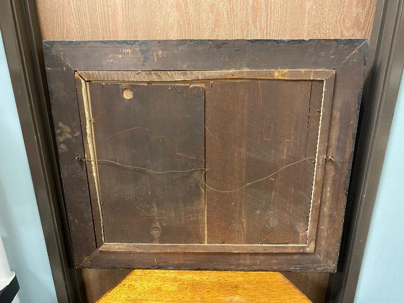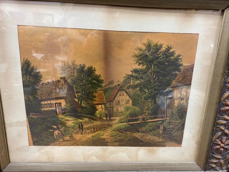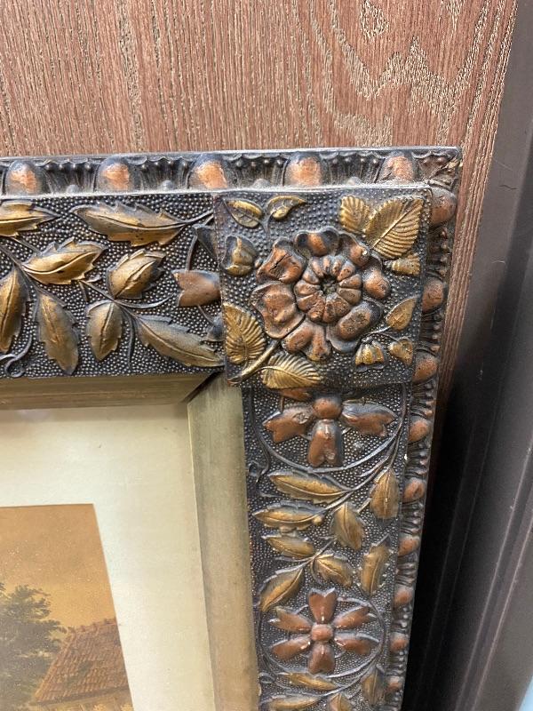 Large Carved Wood Picture Frame. Flower and leaf pattern, painted in soft metallic colors. Measures roughly 26x30. The print inside is of a cottage town. Its has signs of age, discoloration, water stains. The frame looks good as is, has wonderful potential as a paint project.