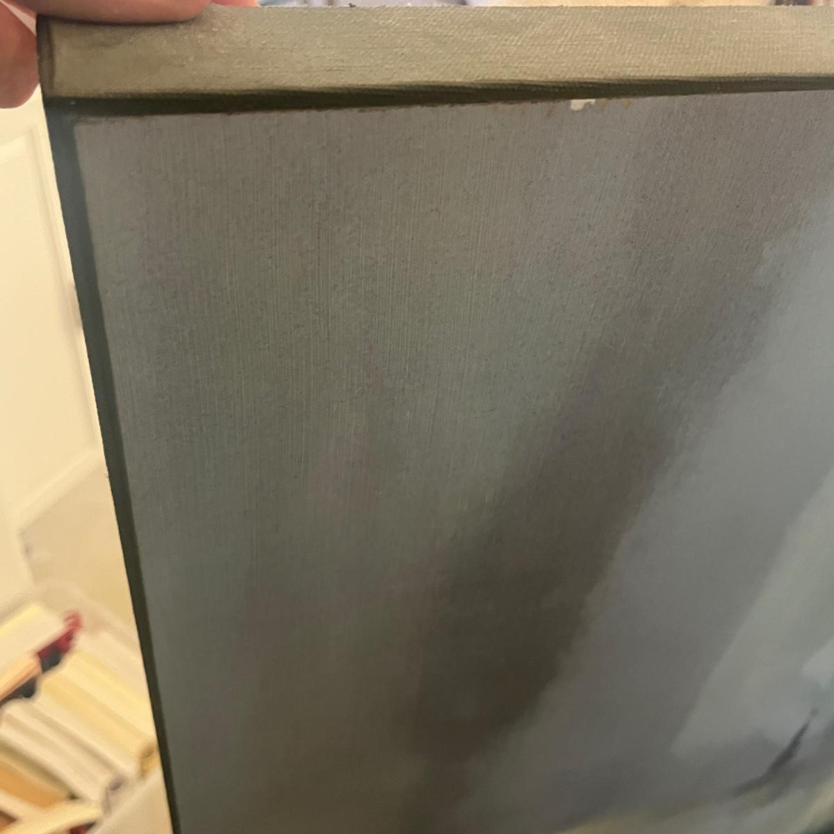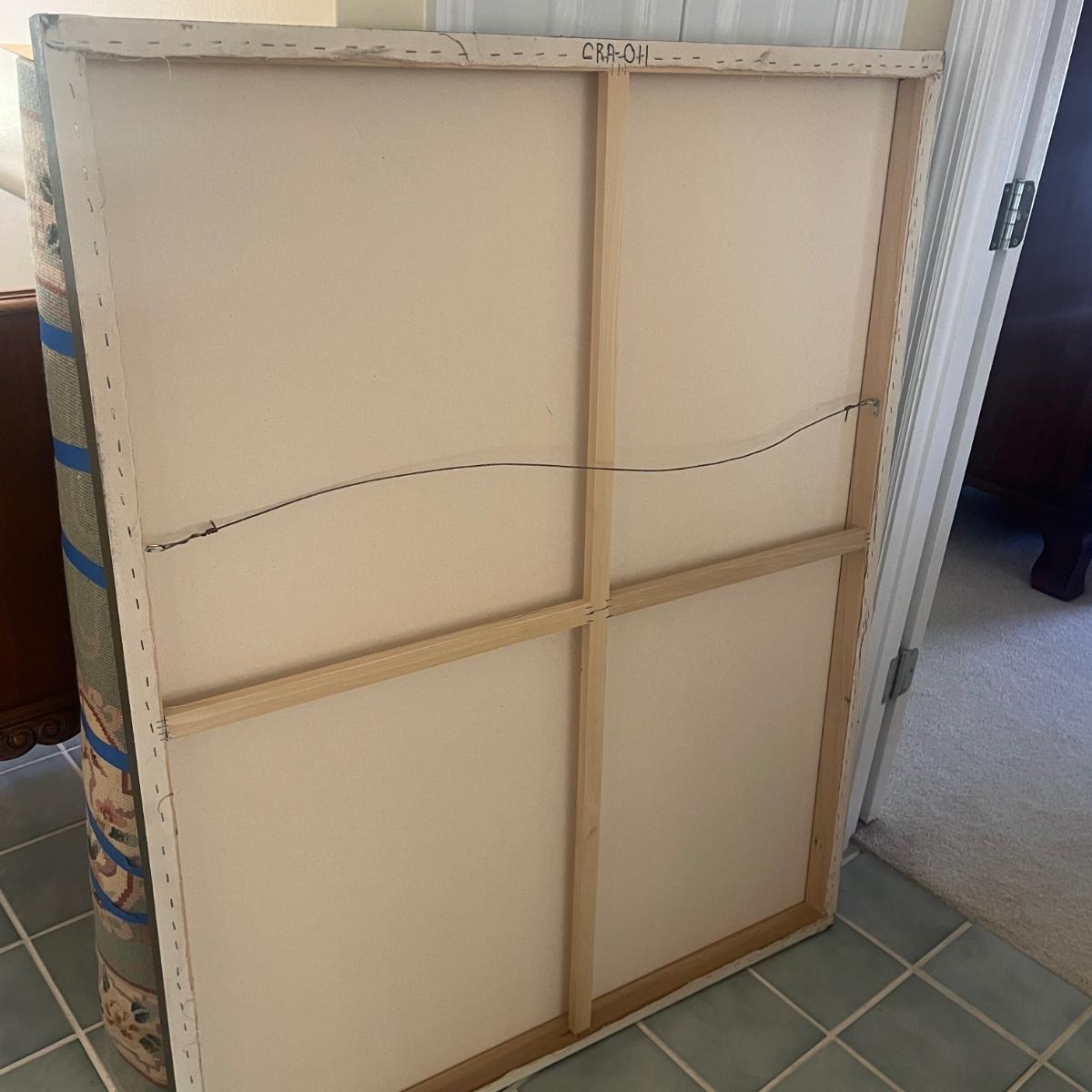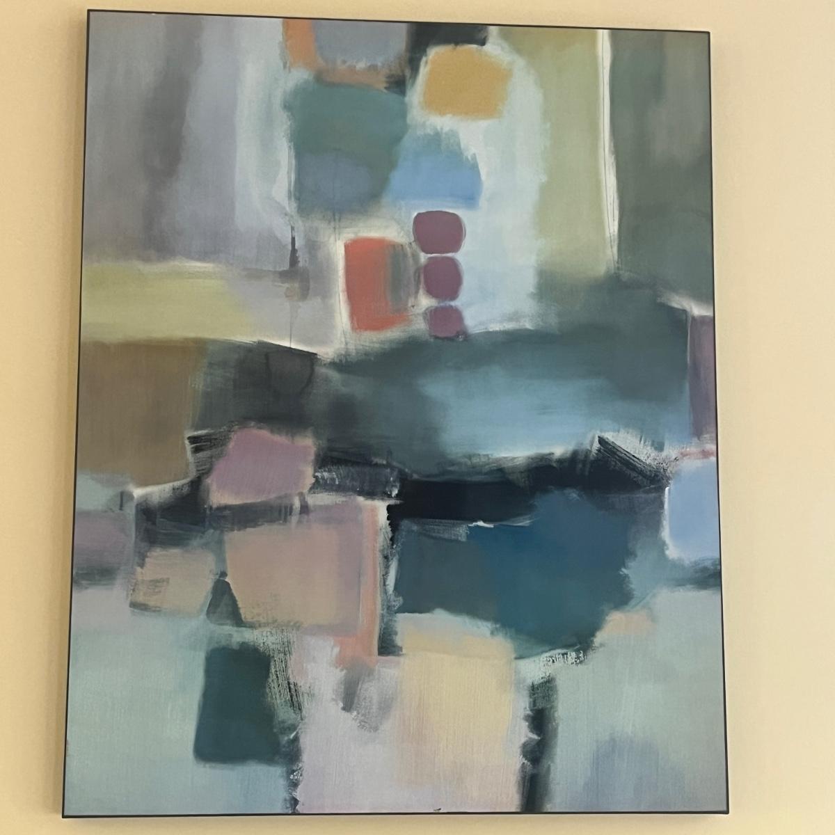 This abstract painting has a wooden frame and measures 40” x 1.75” x 50”H. There is a small chip towards the top of painting, see pictures.