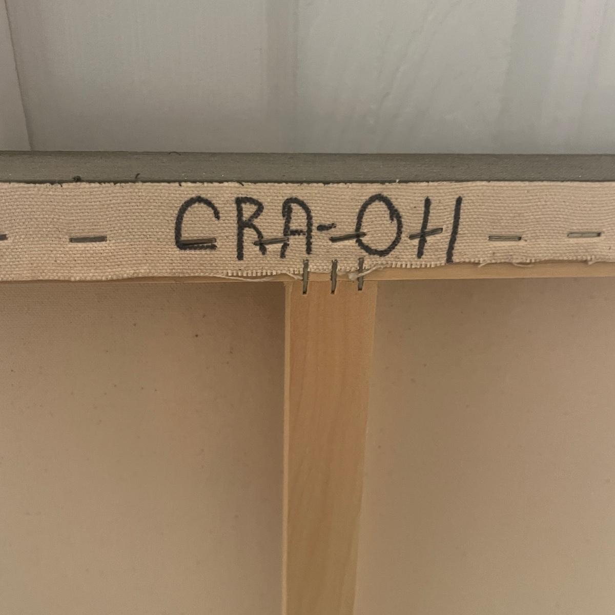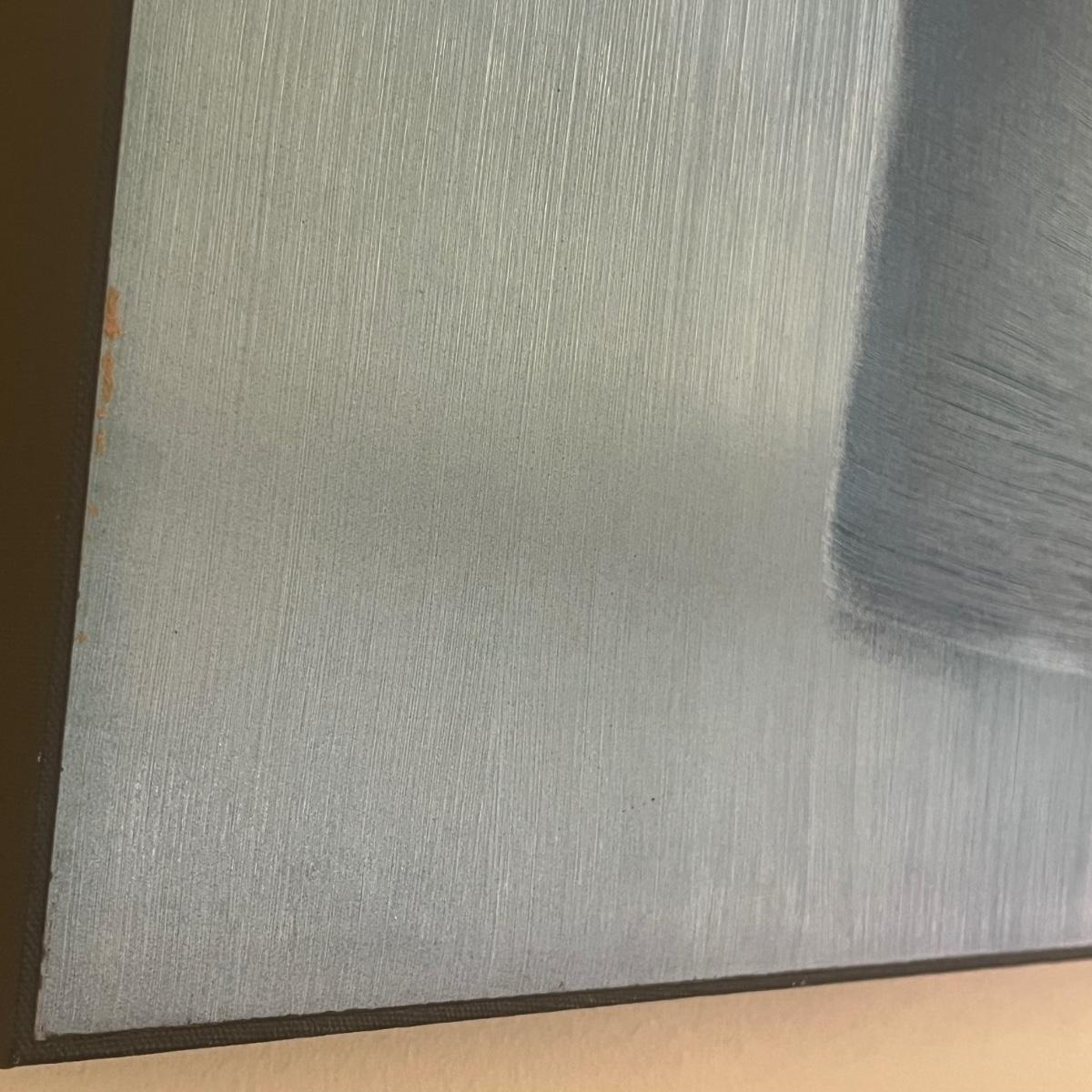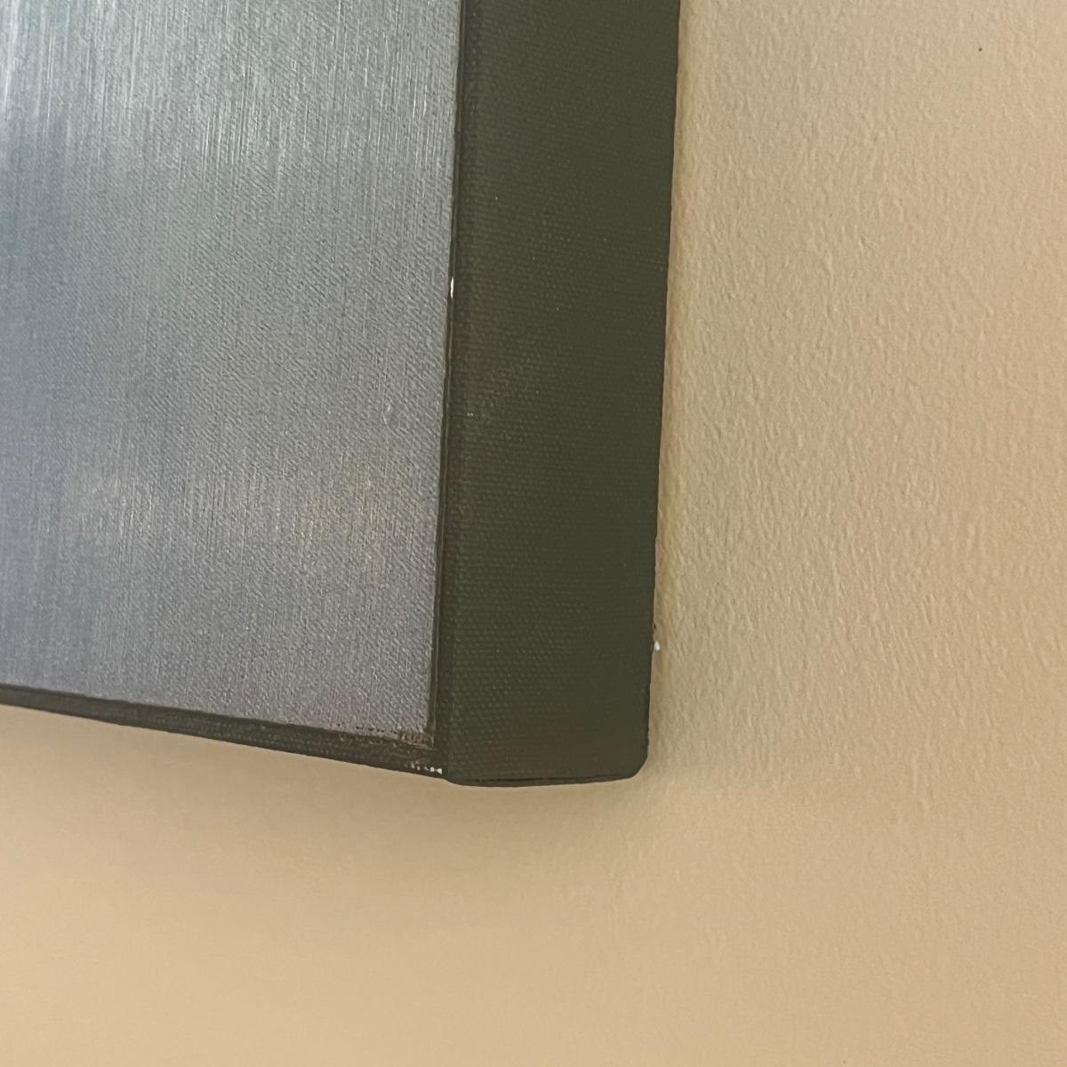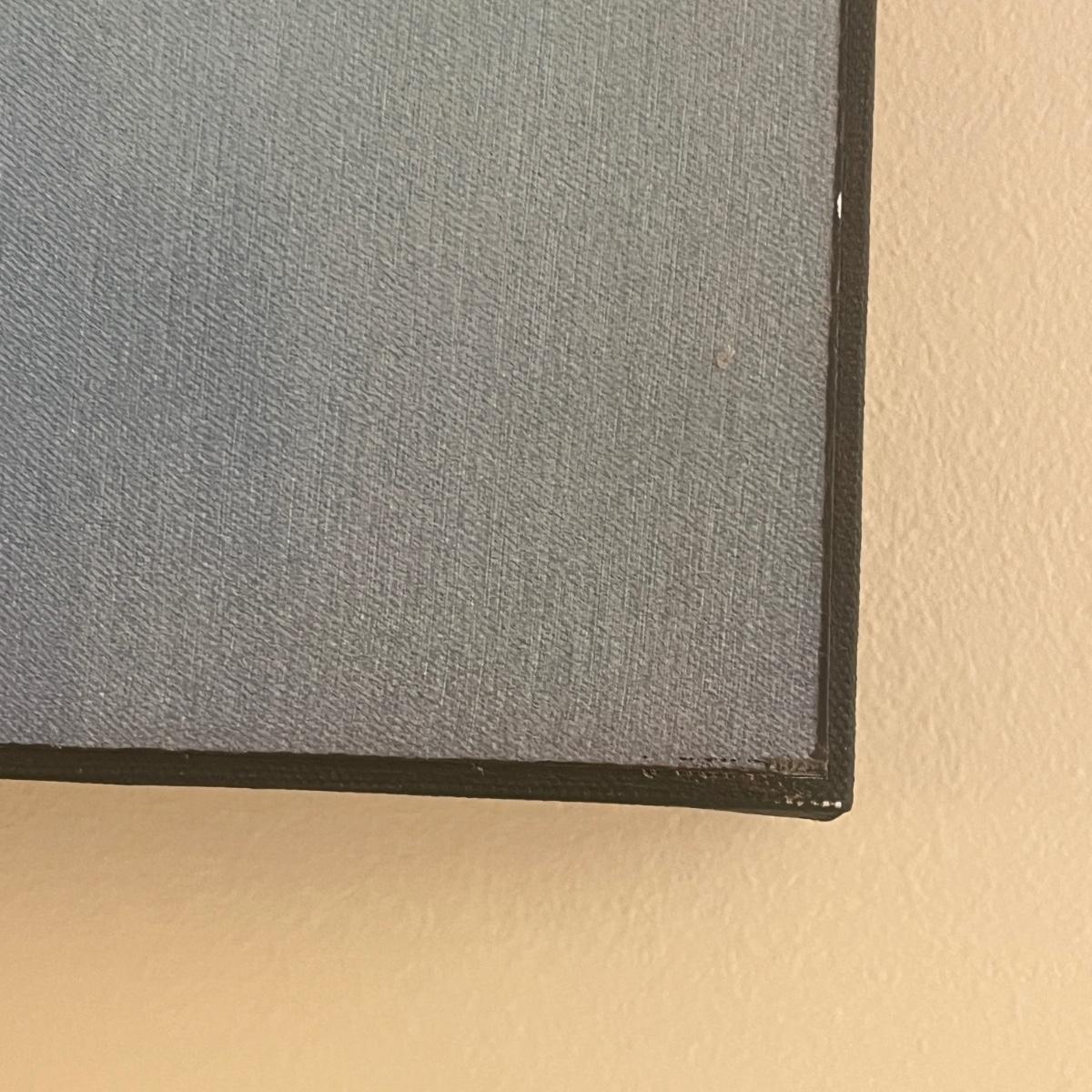 This abstract painting has a wooden frame and measures 40” x 1.75” x 50”H. There is a small chip towards the top of painting, see pictures.