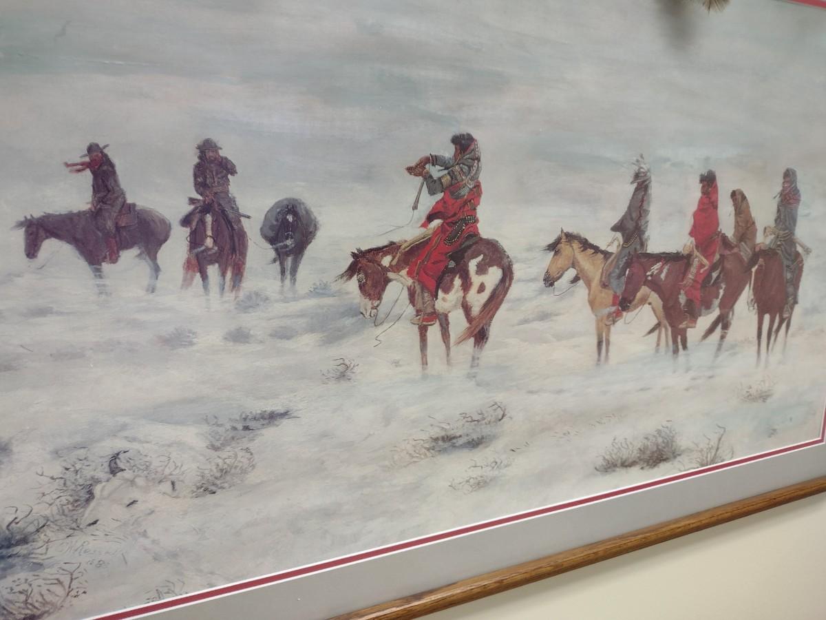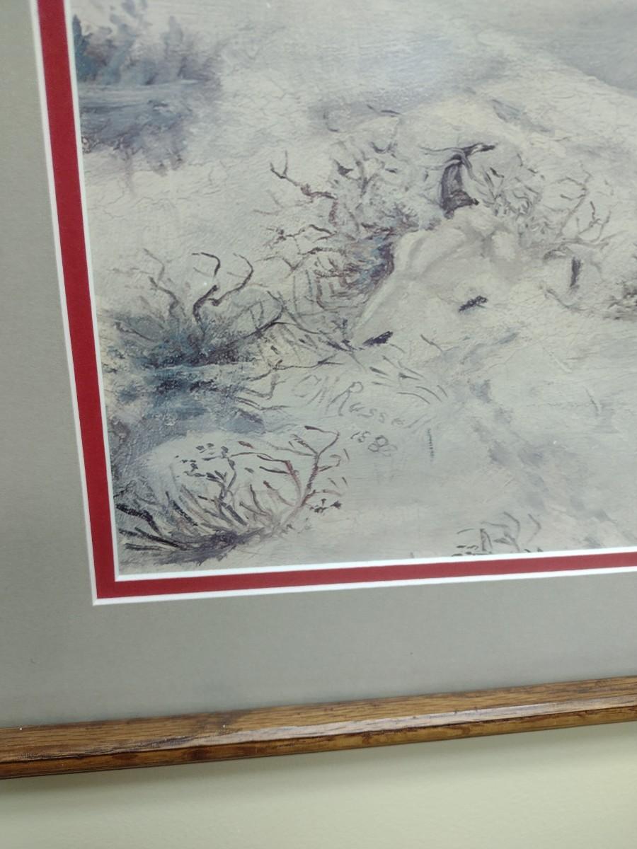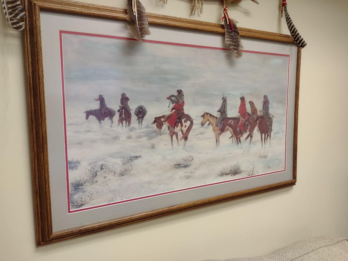 Large Framed Art Native American Theme by C.M. Russell. Bow and arrow above print not included